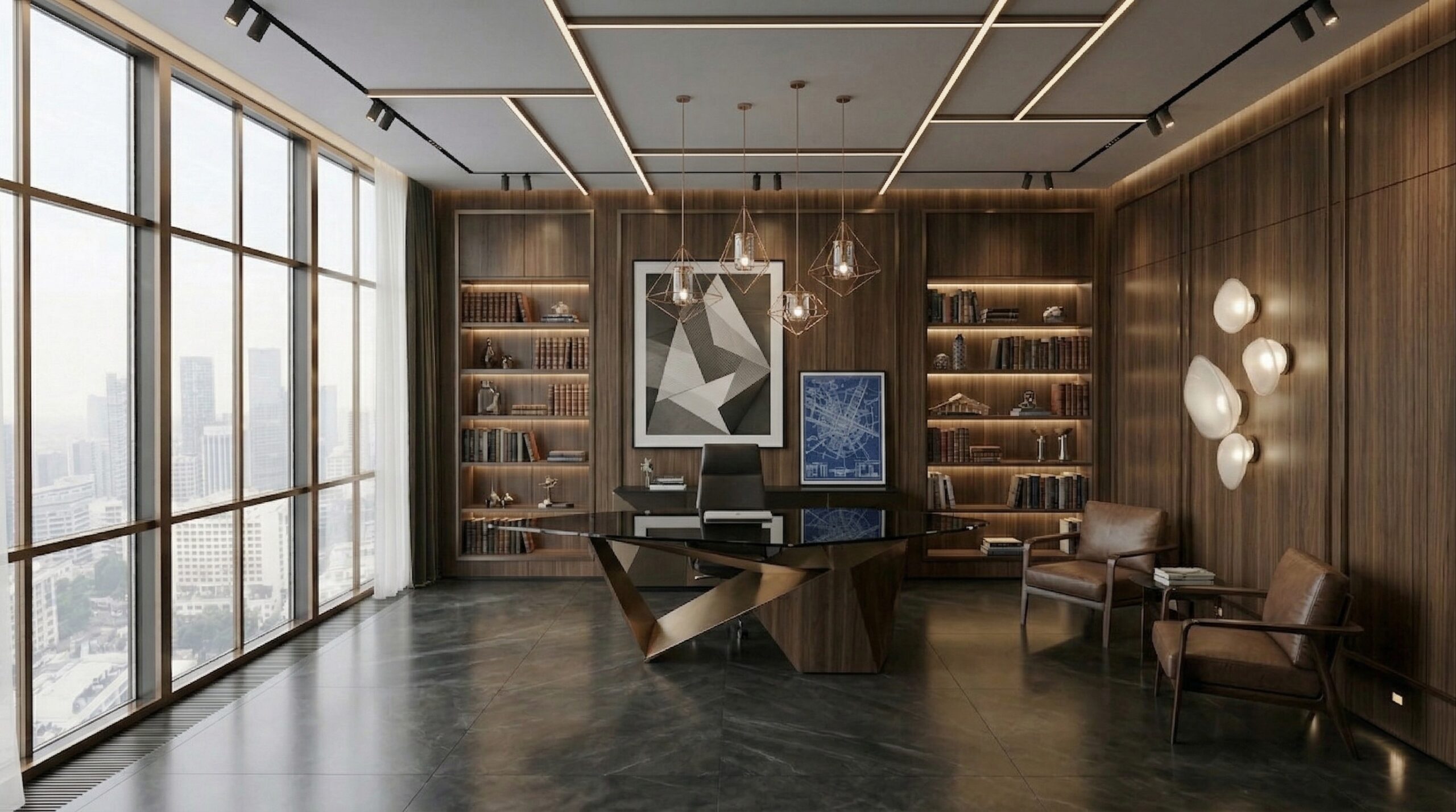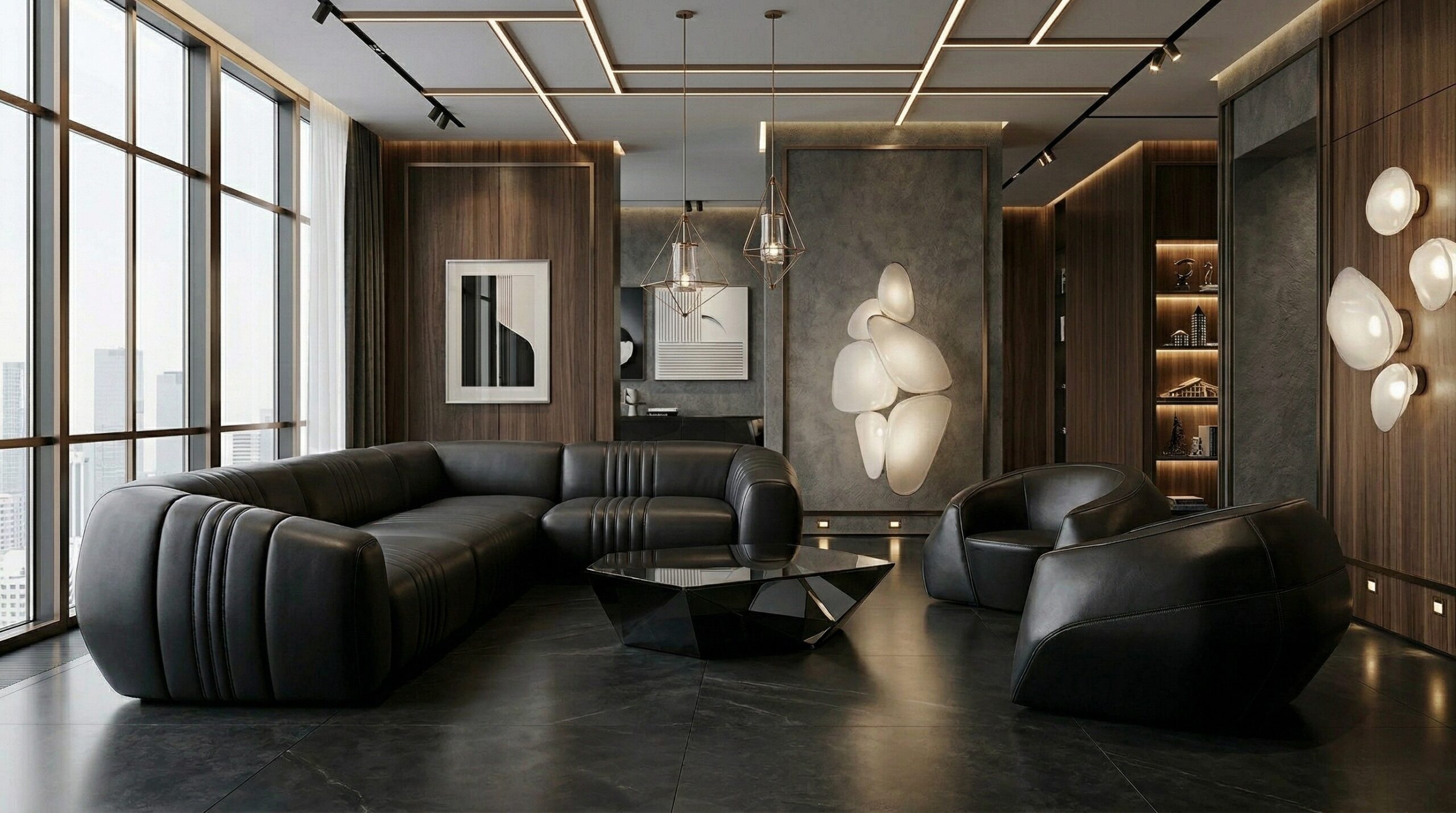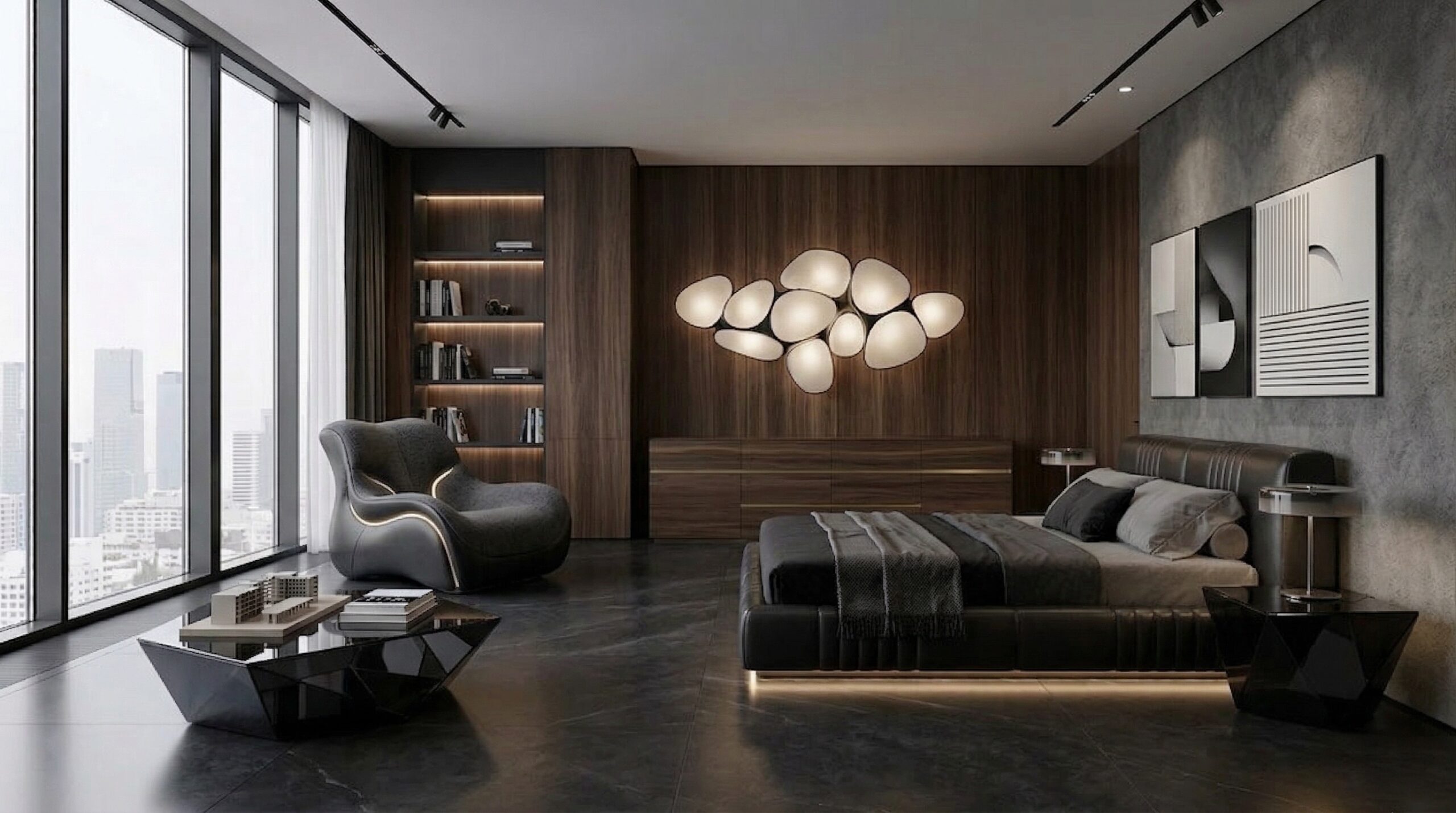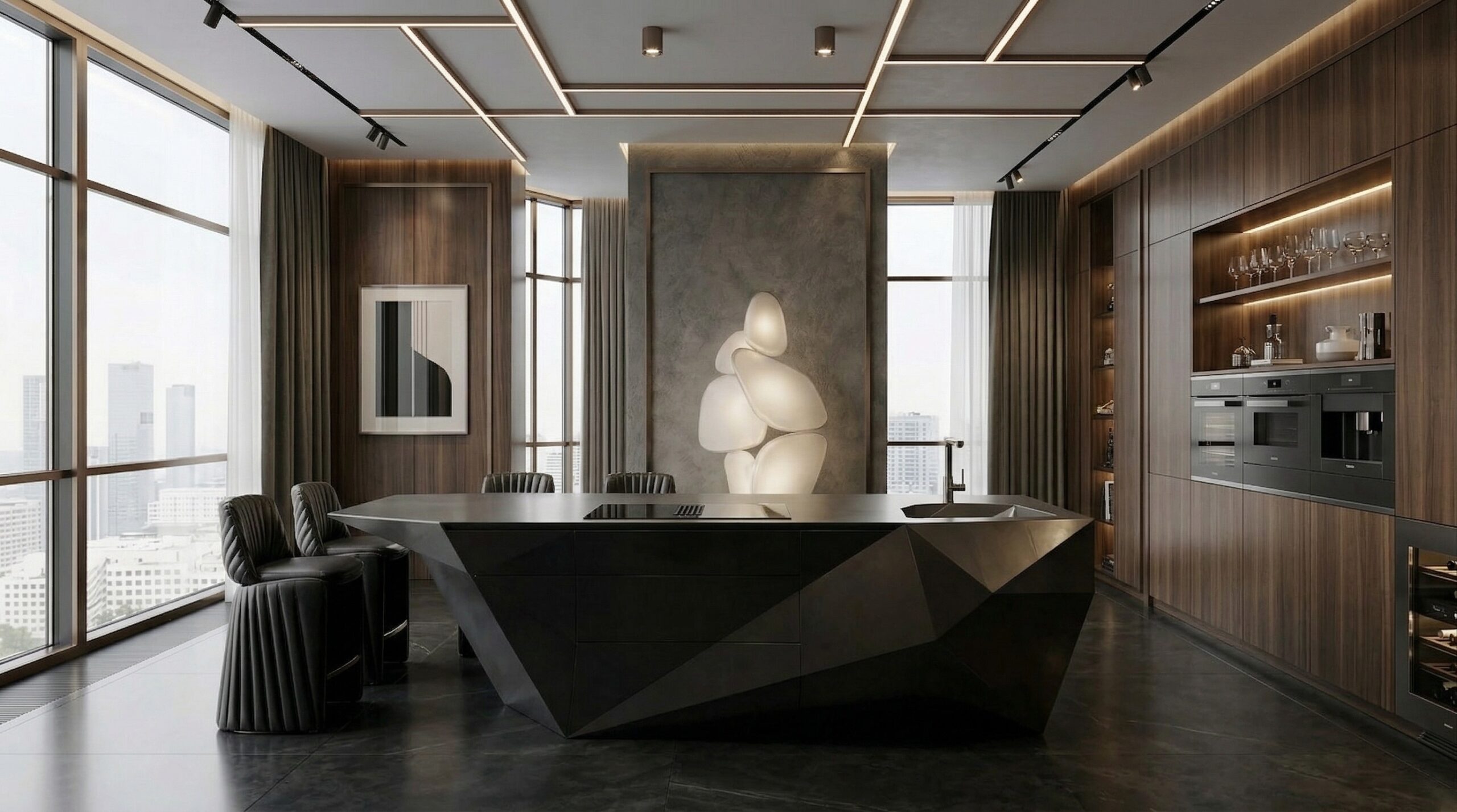 Koyu ahşap paneller, taş yüzeyler ve mat dokular; modüler düşük profilli koltuklar, geometrik formda masa tasarımları ve heykelsi aydınlatmalar ile bütünleşir. Özel üretim çalışma masası, geniş yemek alanı ve gömme raf sistemleri mekânın fonksiyonel katmanlarını güçlendirir.
