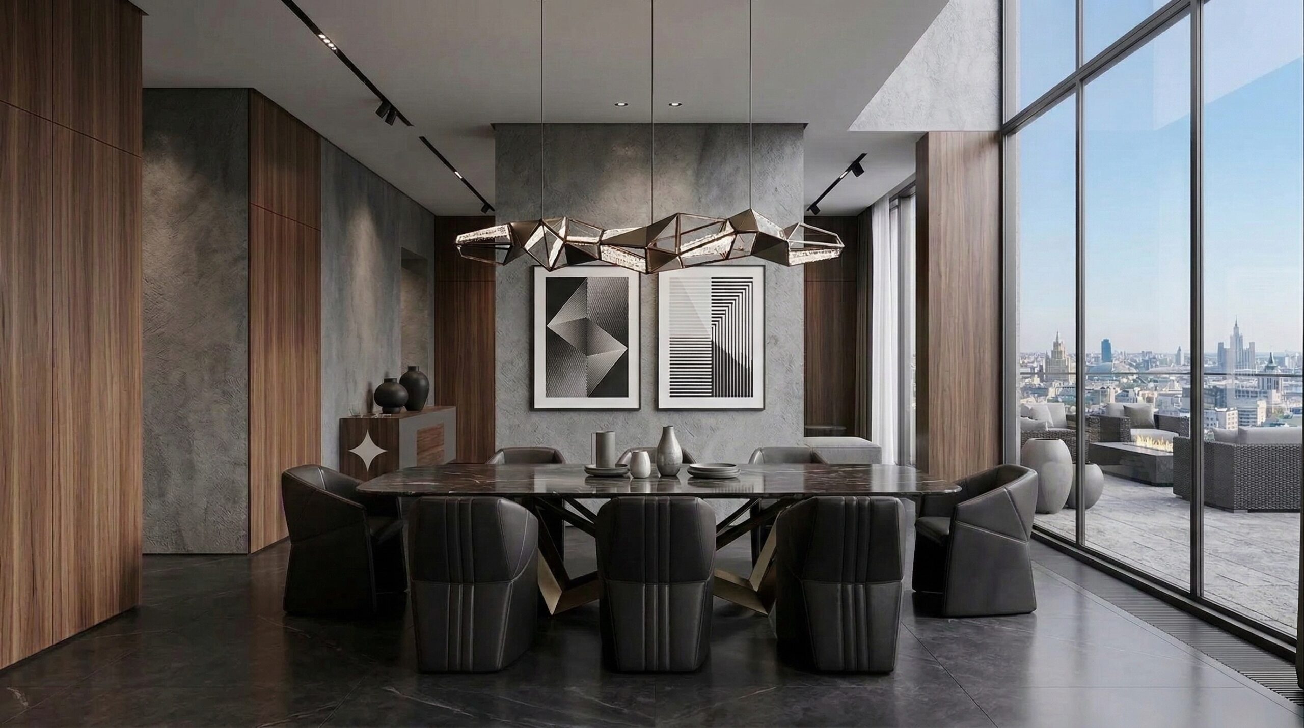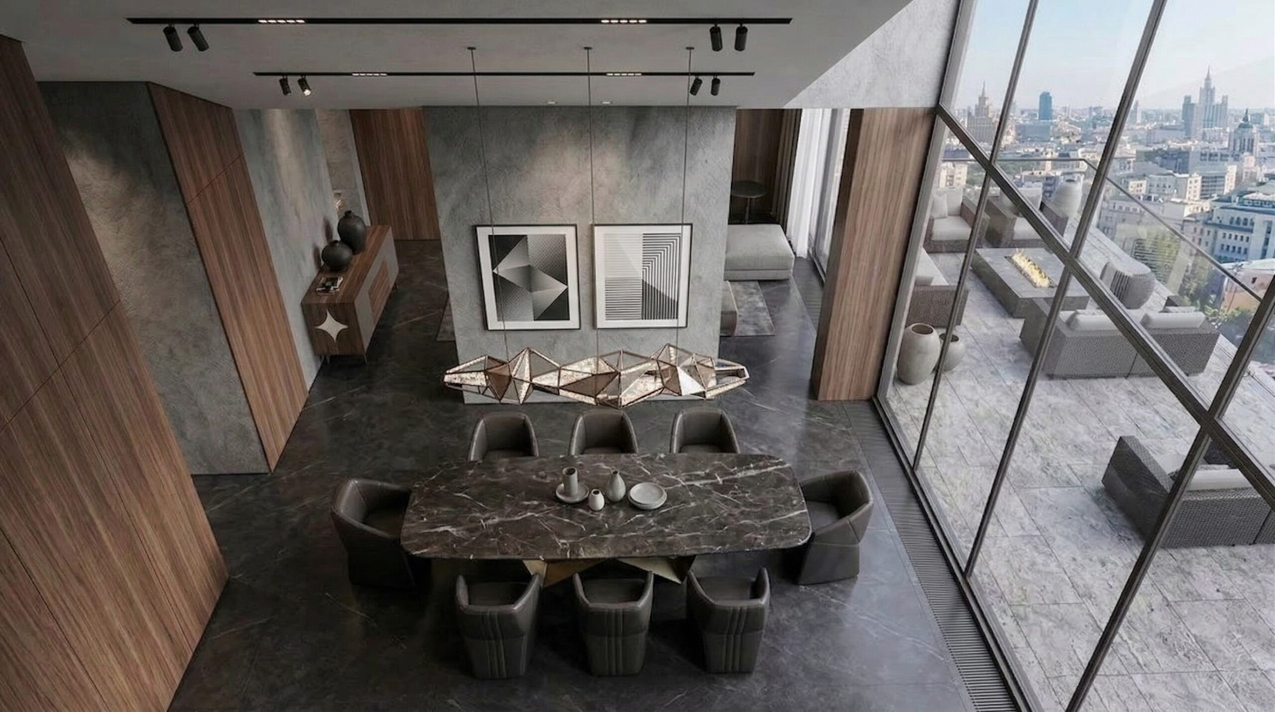 Minimalist lüks anlayışını güçlü malzeme kontrastları ile yorumlayan bu konut, şehir manzarası ile bütünleşen sofistike ve kontrollü bir yaşam deneyimi sunar.