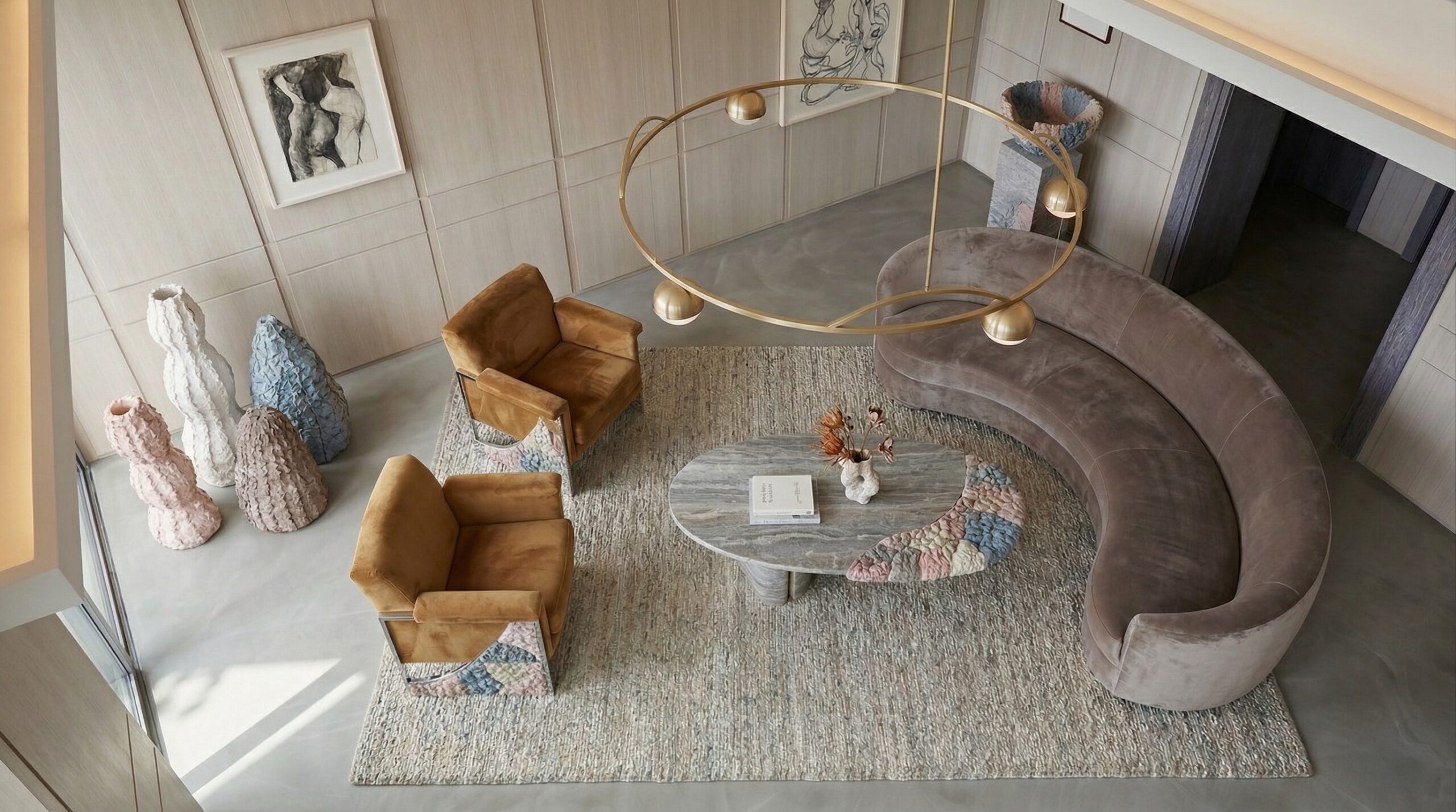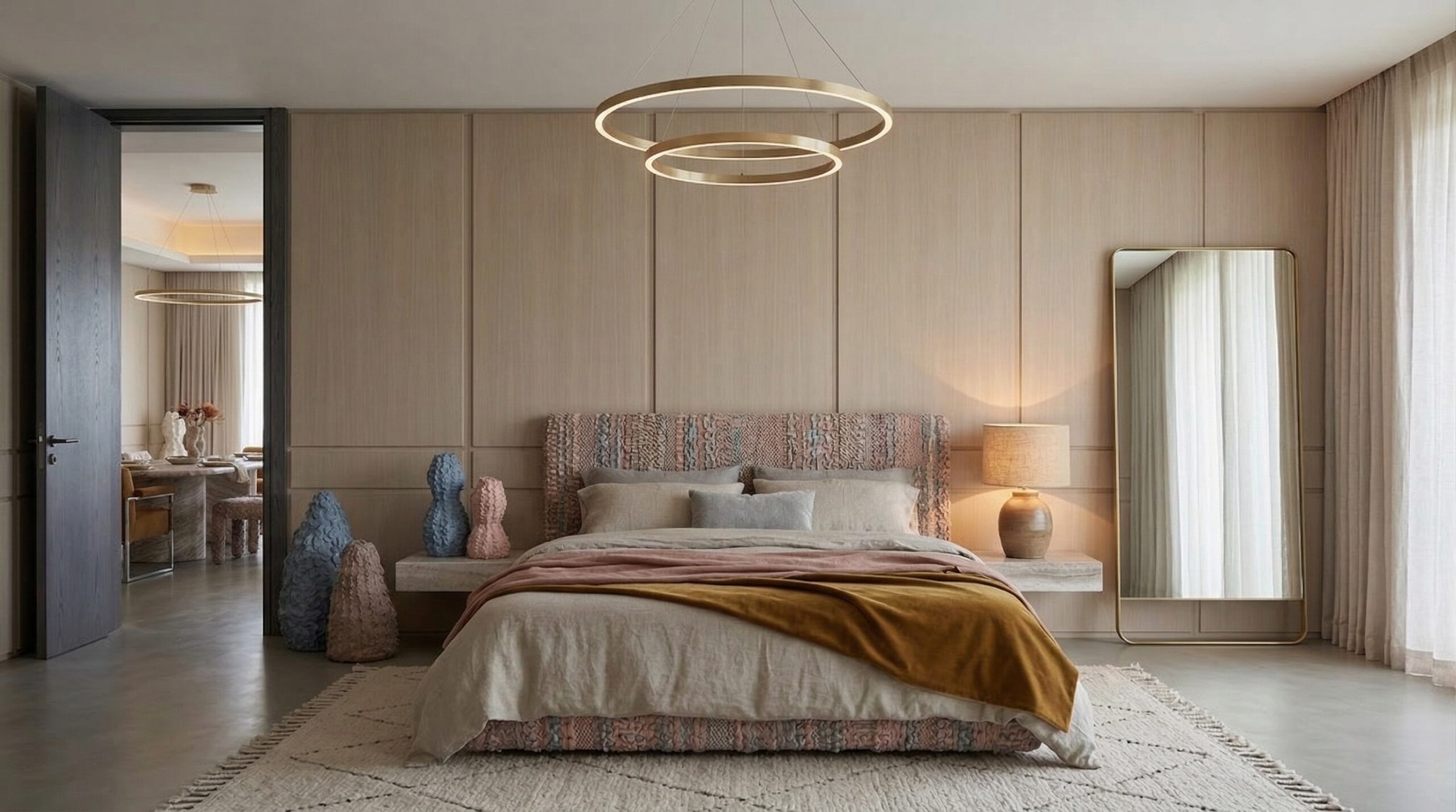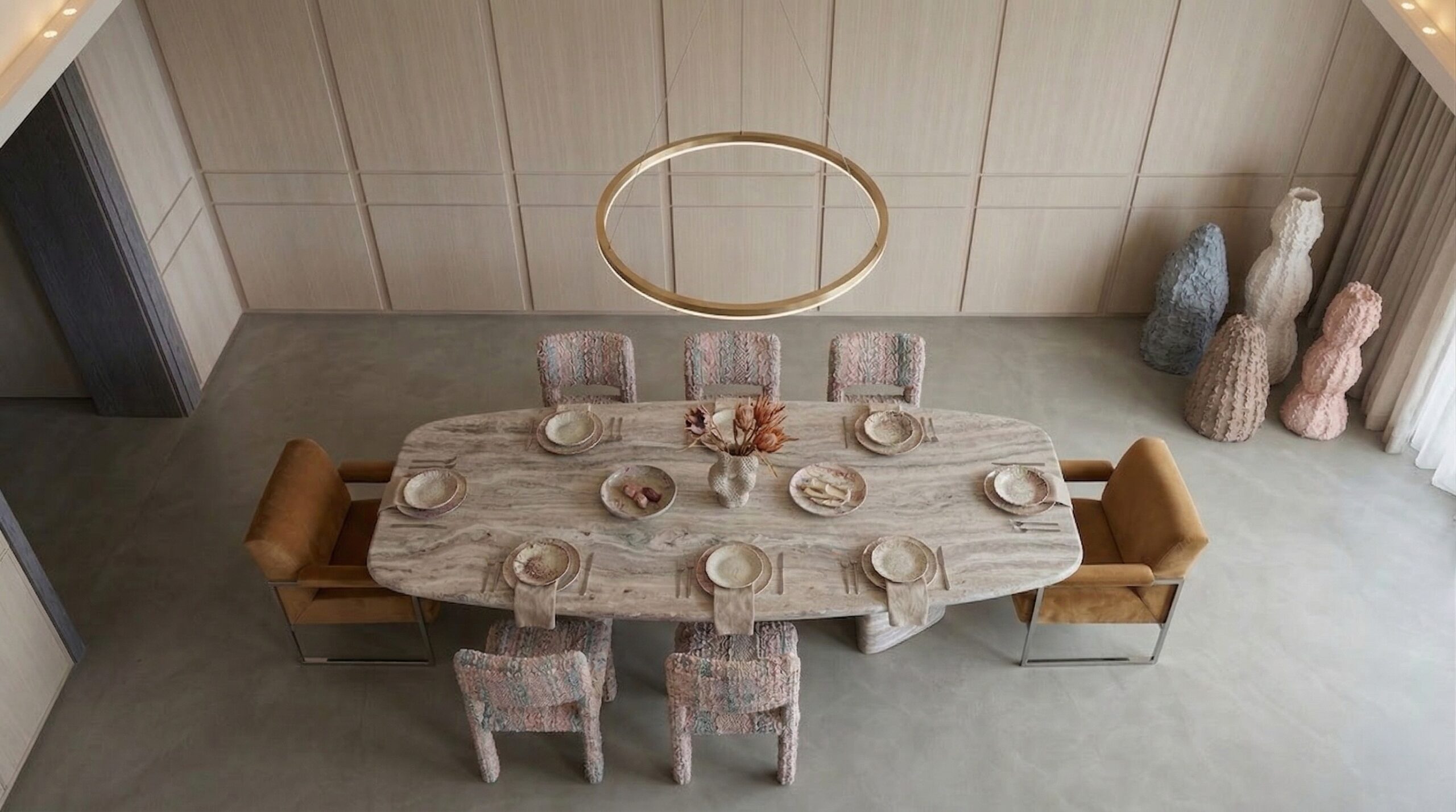 Kavisli formda ve yenilenebilir materyaller ile tasarlanmış koltuklar, dokulu taş yemek masası, minimal çalışma ünitesi ve yalın yatak tasarımı mekânın ana karakterini belirler. İnce detaylara sahip aydınlatmalar ve heykelsi dekoratif objeler, sade kompozisyona zarif bir katman ekler.