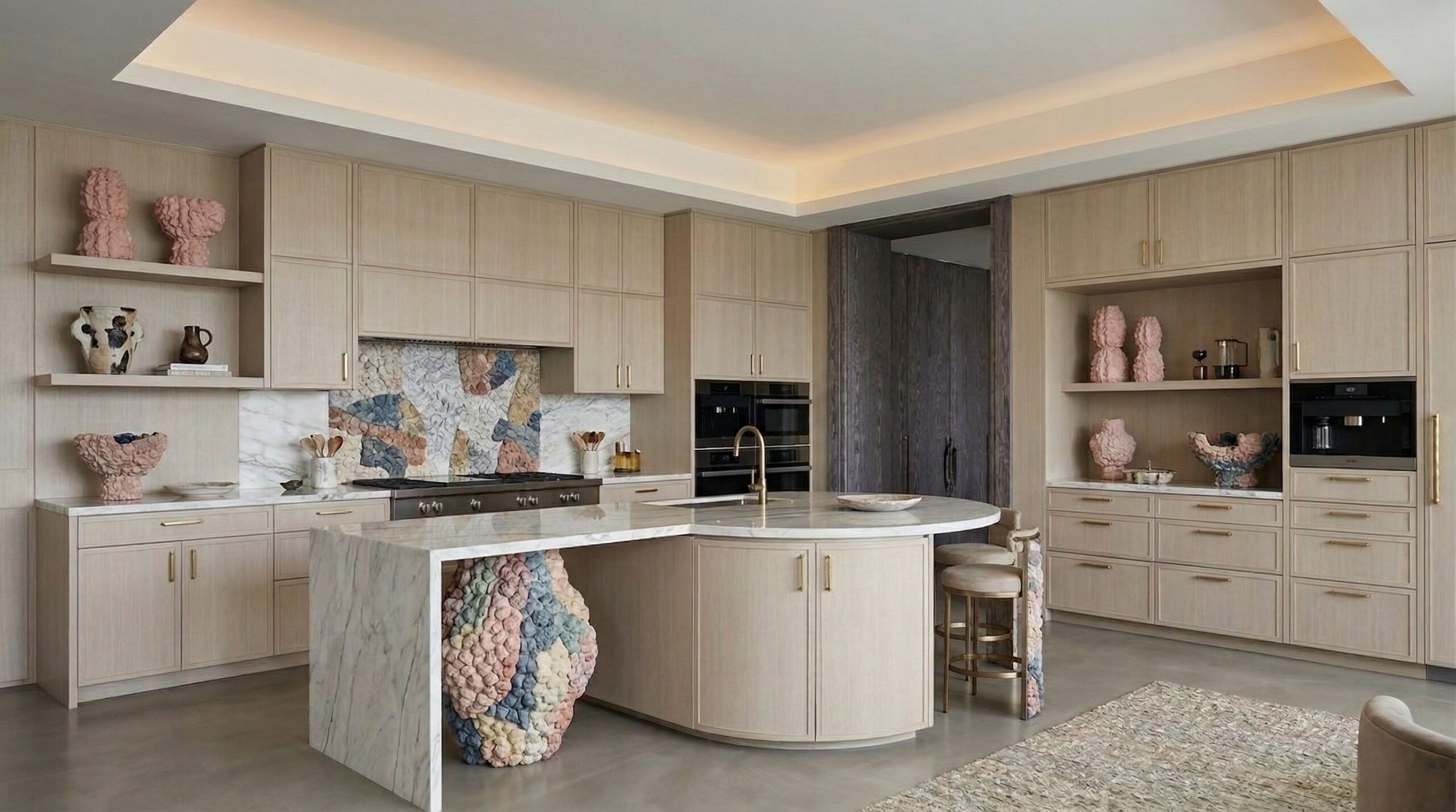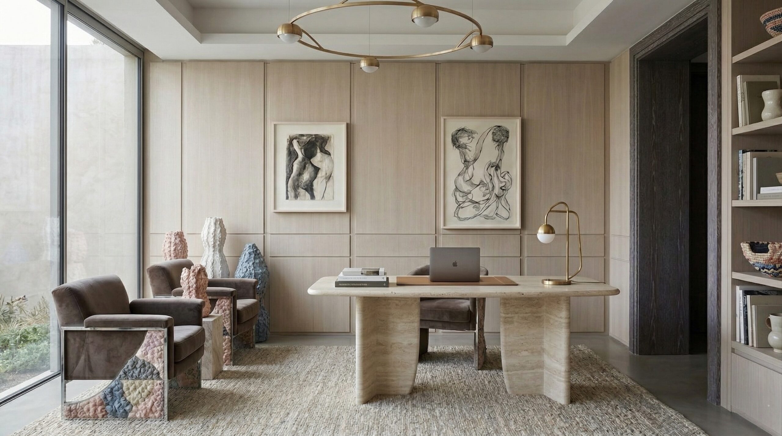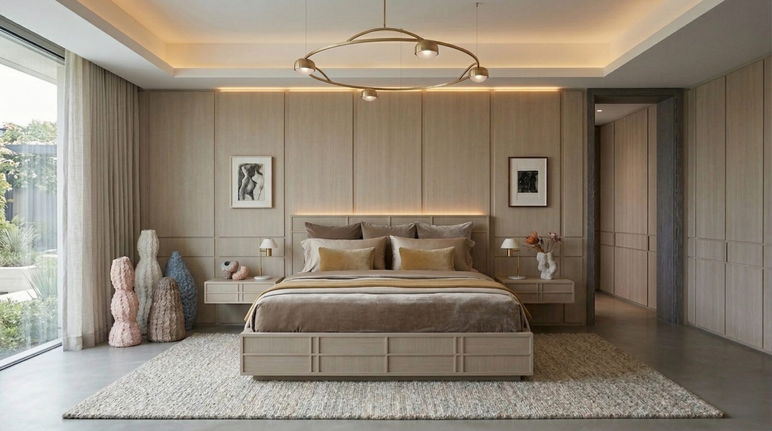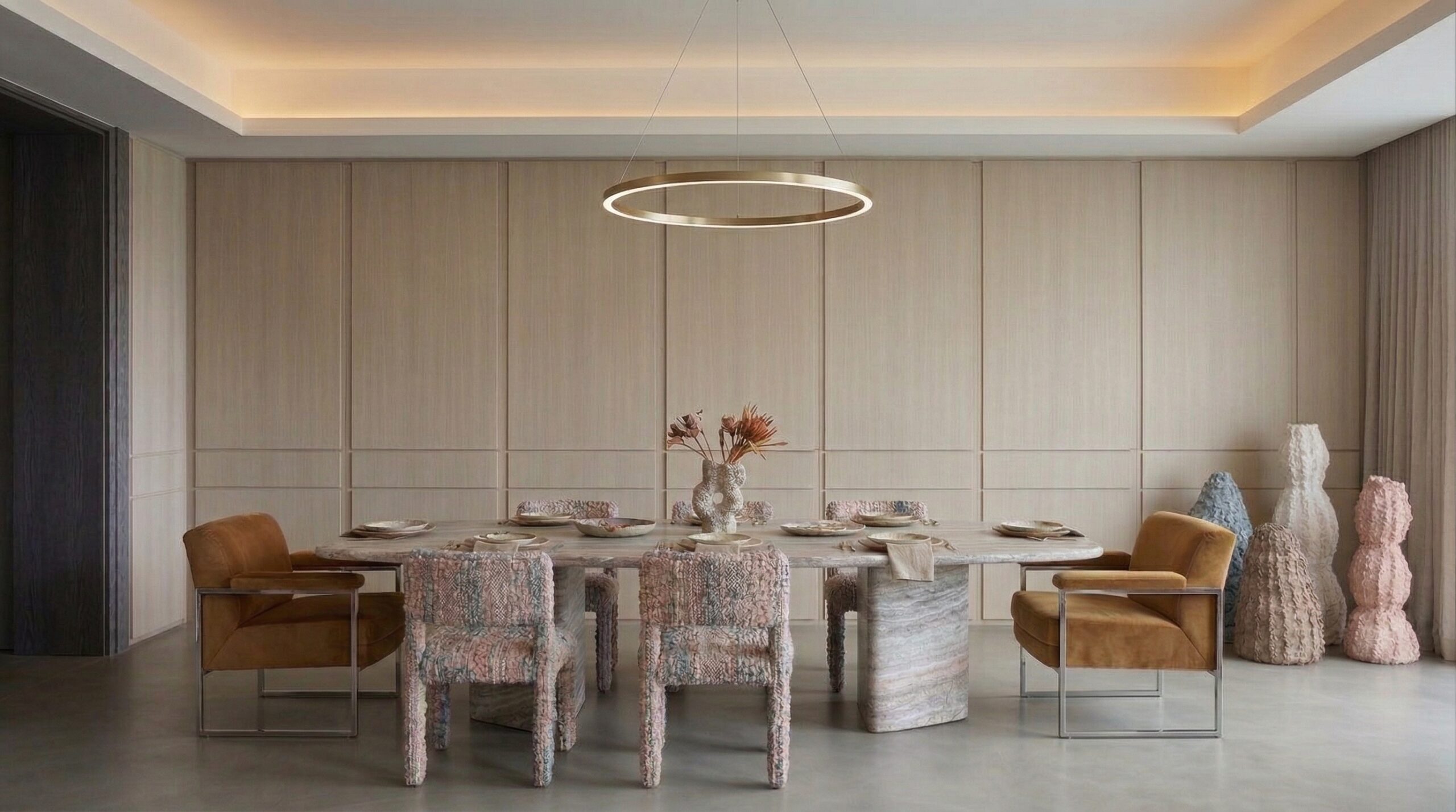Kavisli formda ve yenilenebilir materyaller ile tasarlanmış koltuklar, dokulu taş yemek masası, minimal çalışma ünitesi ve yalın yatak tasarımı mekânın ana karakterini belirler. İnce detaylara sahip aydınlatmalar ve heykelsi dekoratif objeler, sade kompozisyona zarif bir katman ekler.