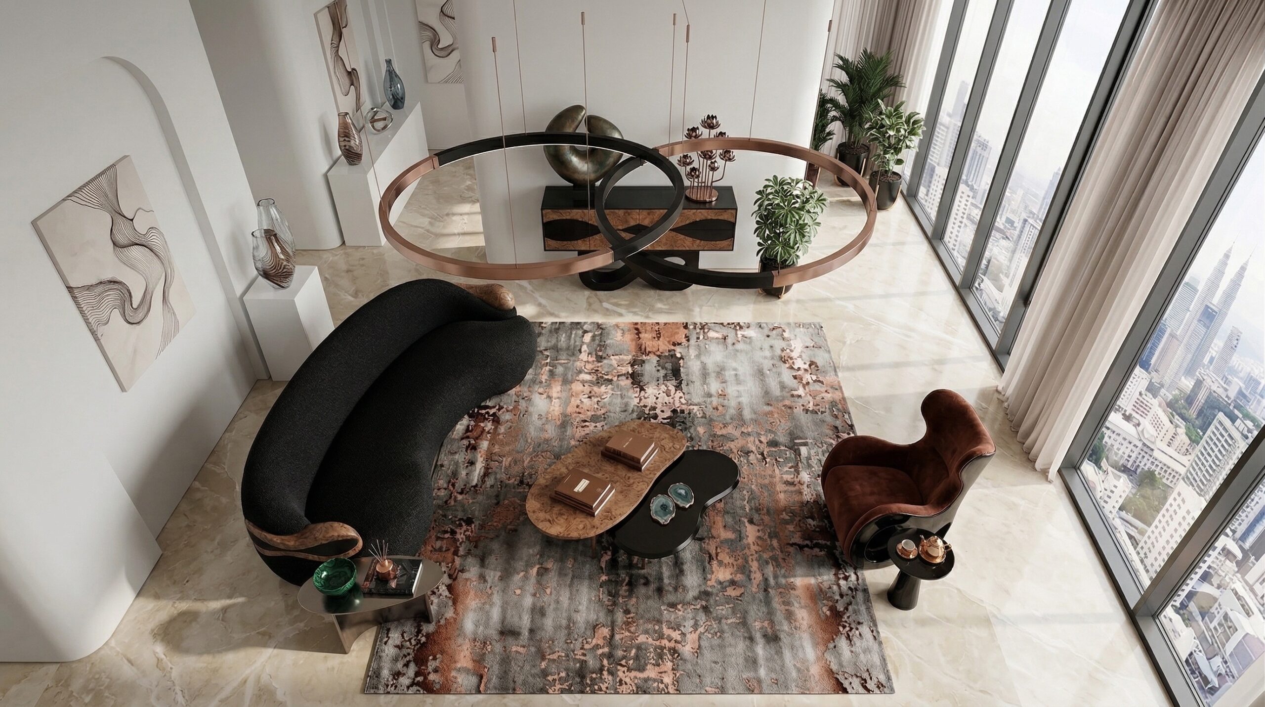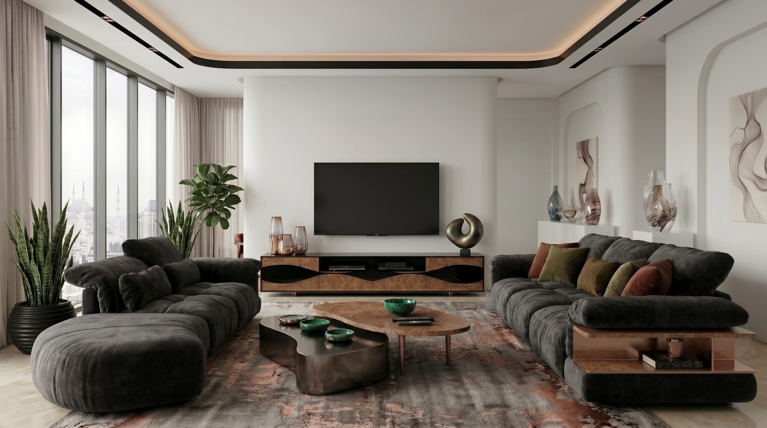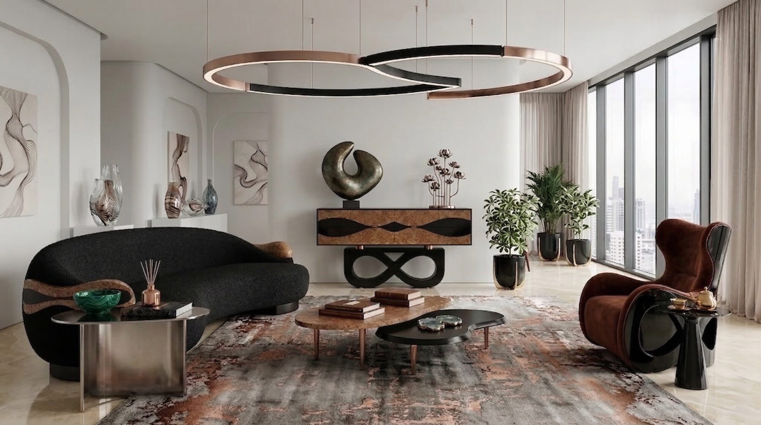 Merkezde yer alan dairesel aydınlatma elemanı, mekânın odak noktasını oluştururken; kıvrımlı ve heykelsi formda tasarlanmış koltuklar, organik hatlı sehpa kompozisyonu ve özel üretim konsol ünitesi ile bütünleşir. Doğal taş zemin, sanatsal dokulu halı ve metal detaylar mekânda dengeli bir malzeme kontrastı yaratır.