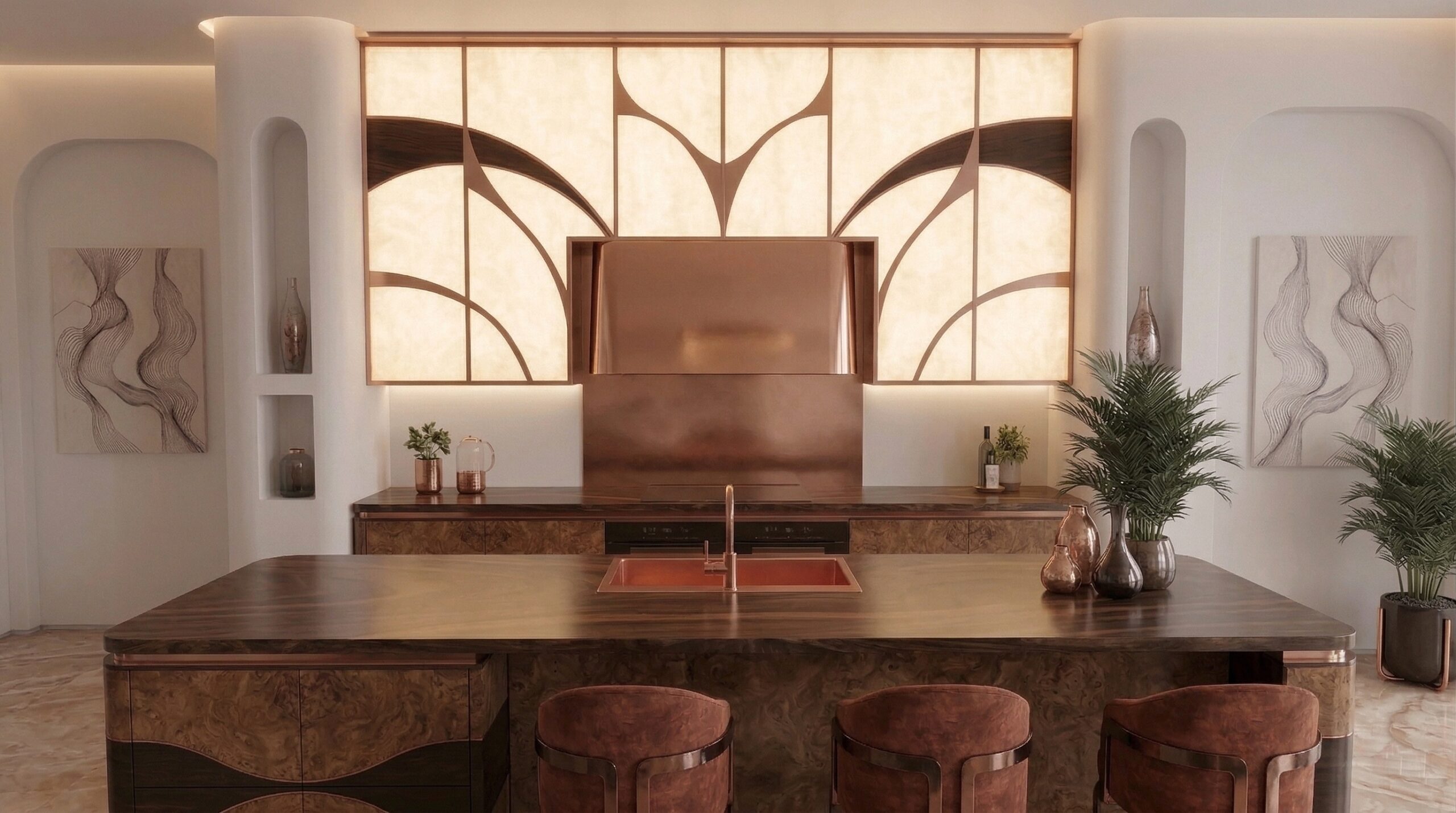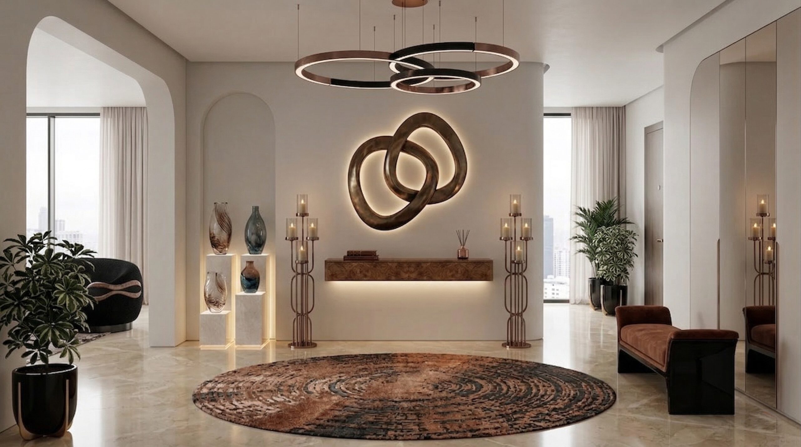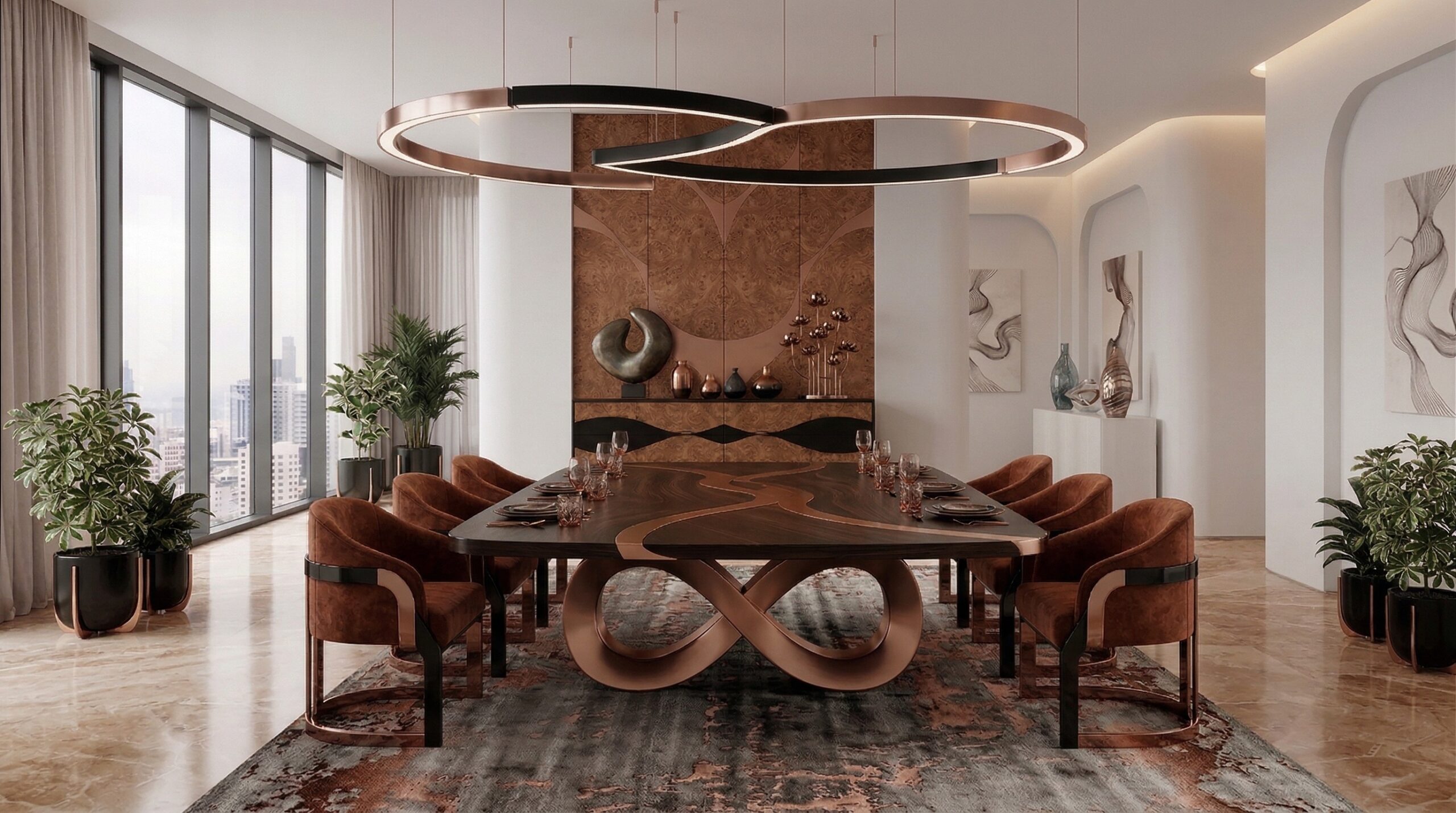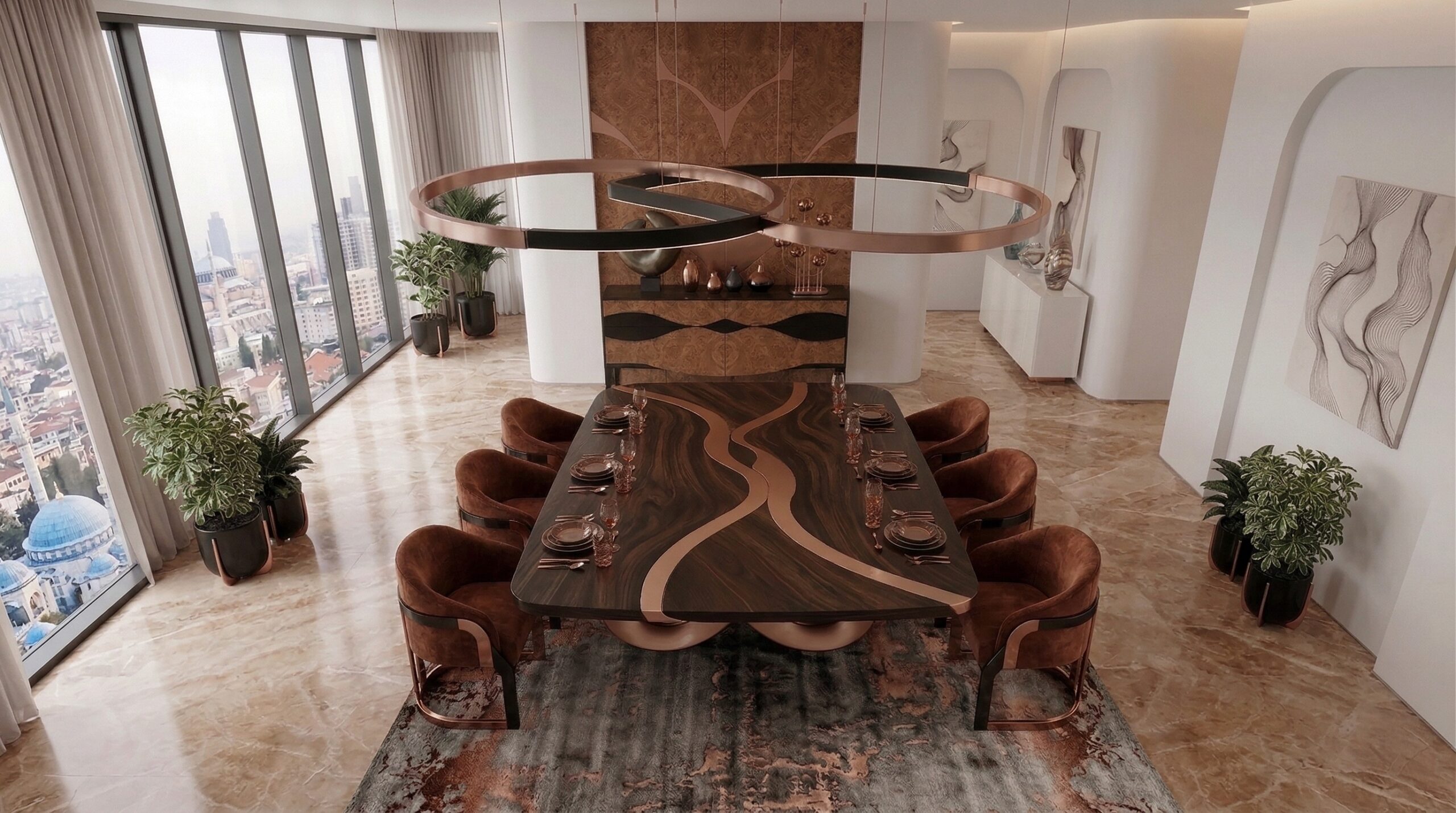 Merkezde yer alan dairesel aydınlatma elemanı, mekânın odak noktasını oluştururken; kıvrımlı ve heykelsi formda tasarlanmış koltuklar, organik hatlı sehpa kompozisyonu ve özel üretim konsol ünitesi ile bütünleşir. Doğal taş zemin, sanatsal dokulu halı ve metal detaylar mekânda dengeli bir malzeme kontrastı yaratır.
