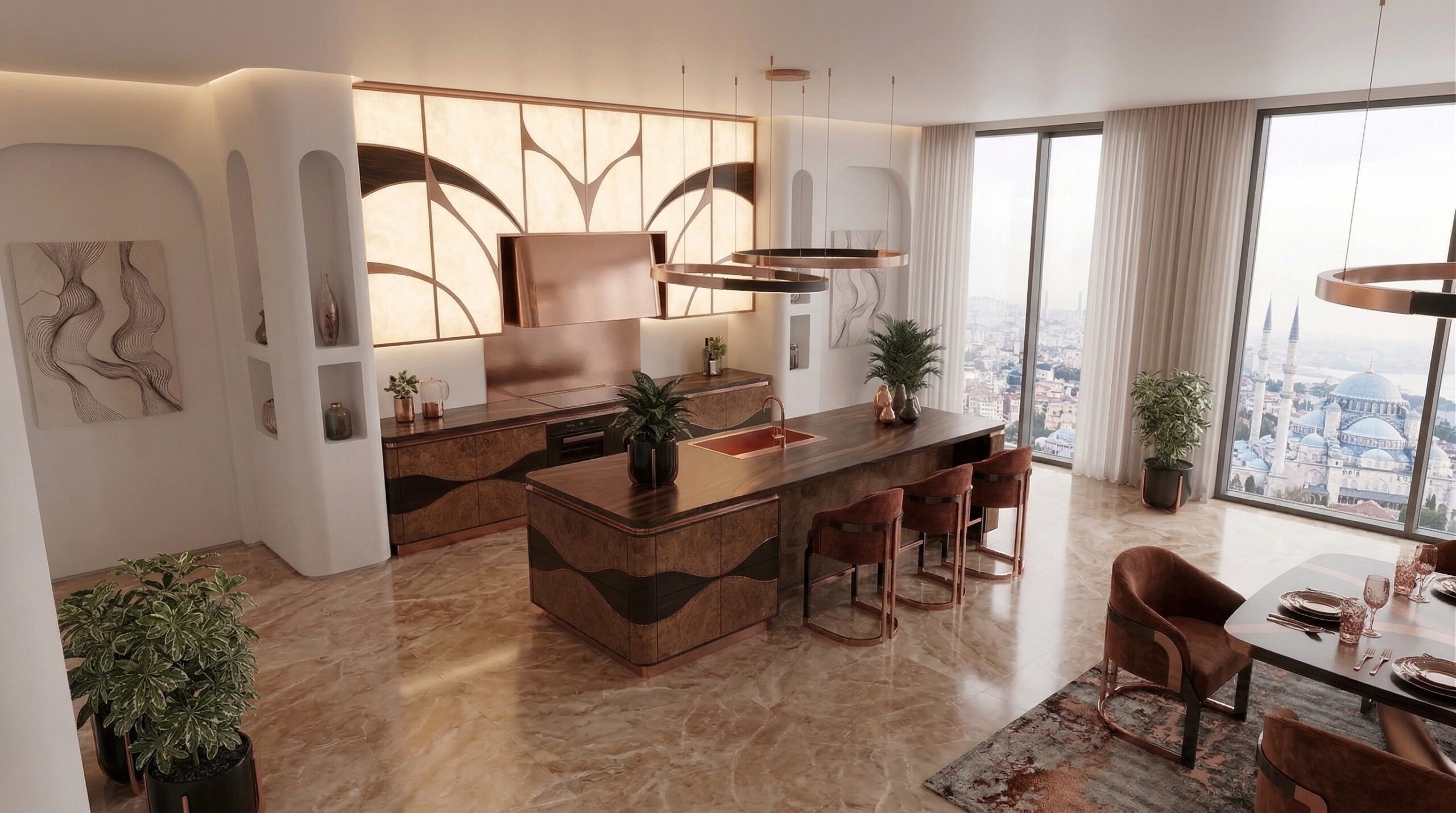 Sanatsal formlar ile modern lüksü bir araya getiren bu konut, şehir manzarasıyla bütünleşen güçlü ve karakteristik bir yaşam deneyimi sunar.