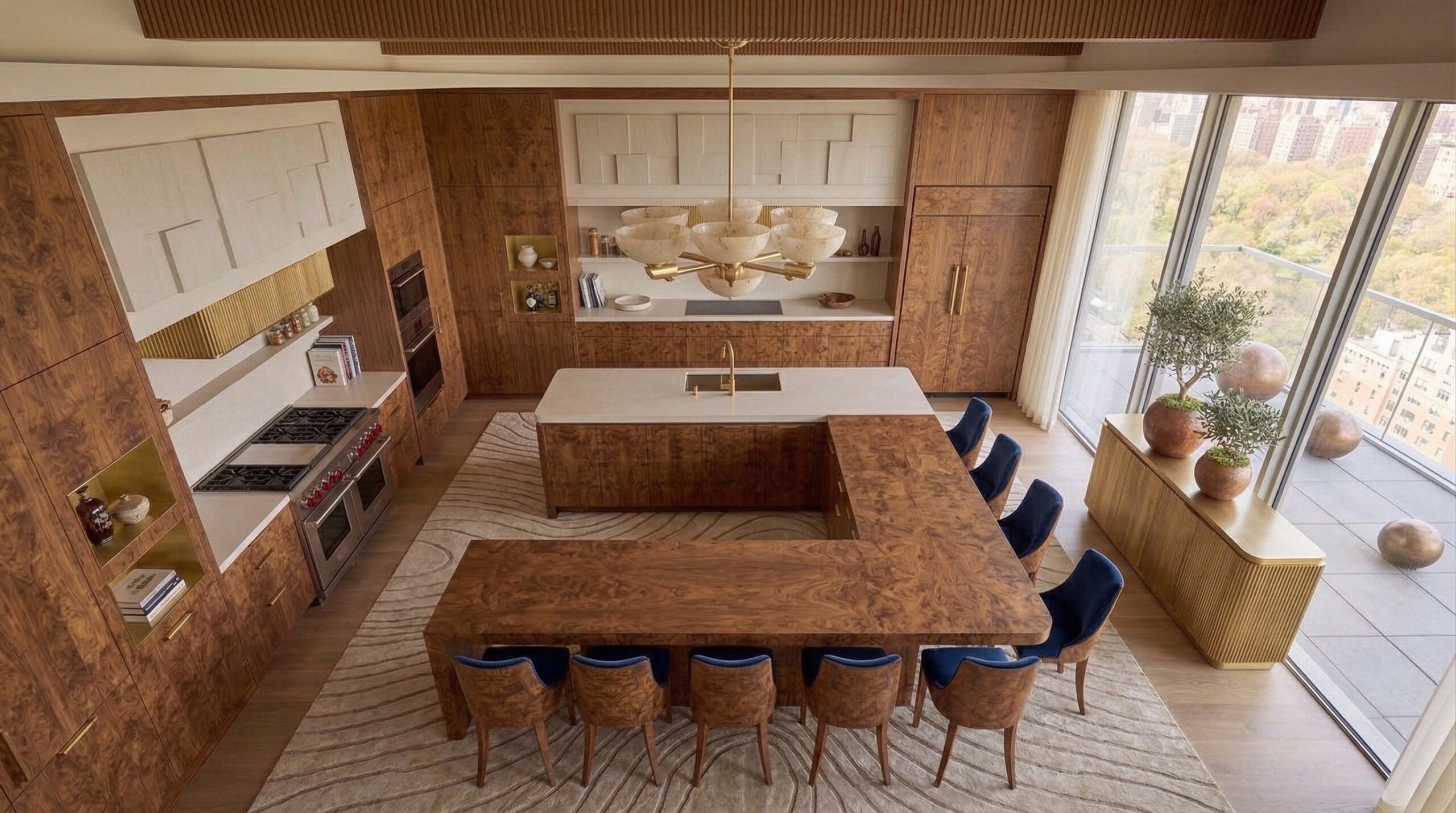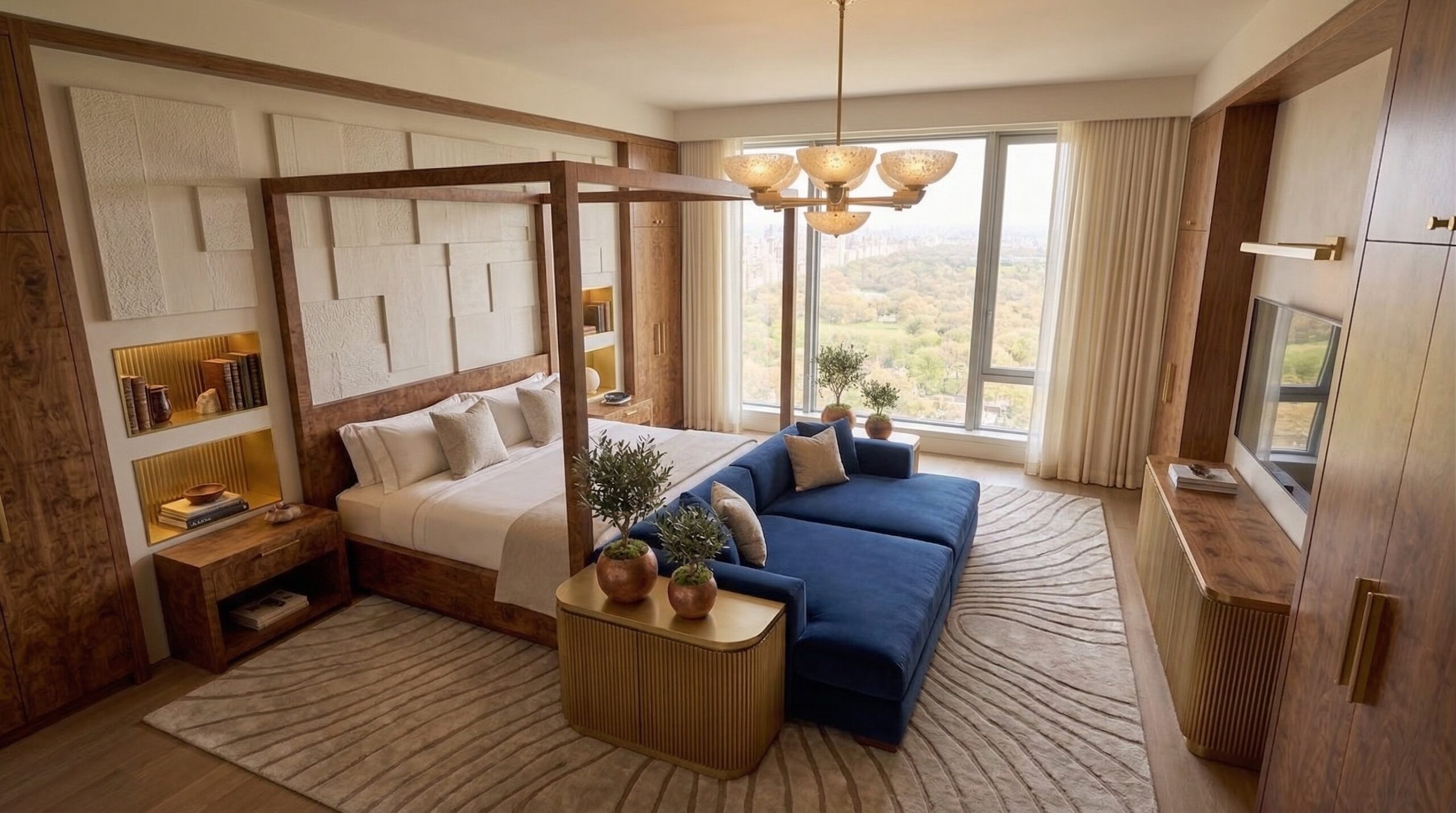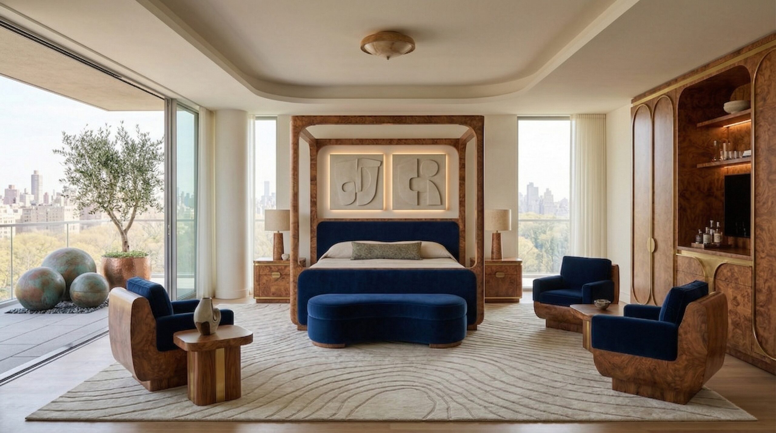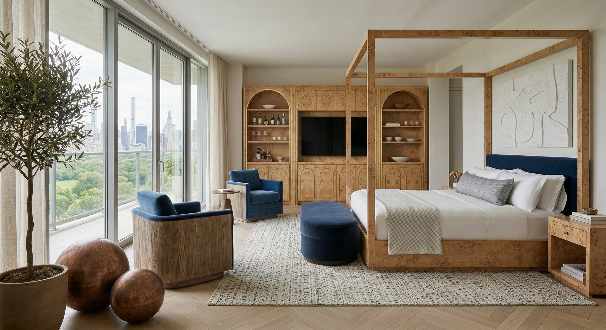 Açık tonlu yüzeyler ve doğal ahşap kaplamalar; mavi vurgulu koltuklar, kavisli oturma elemanları, masif yemek masası ve bütünleşik yatak tasarımı ile dengelenir. Yumuşak dokulu halılar, sade aydınlatmalar ve gömme raf sistemleri mekânda sıcak ve rafine bir bütünlük oluşturur.