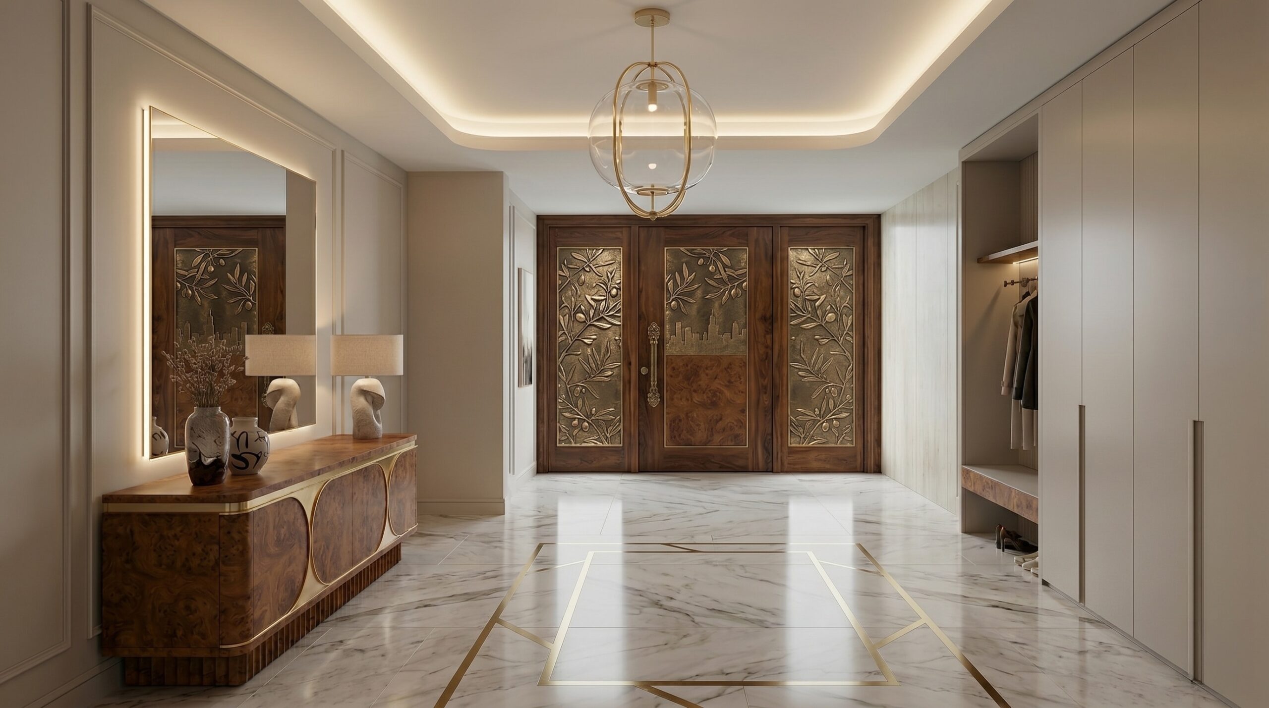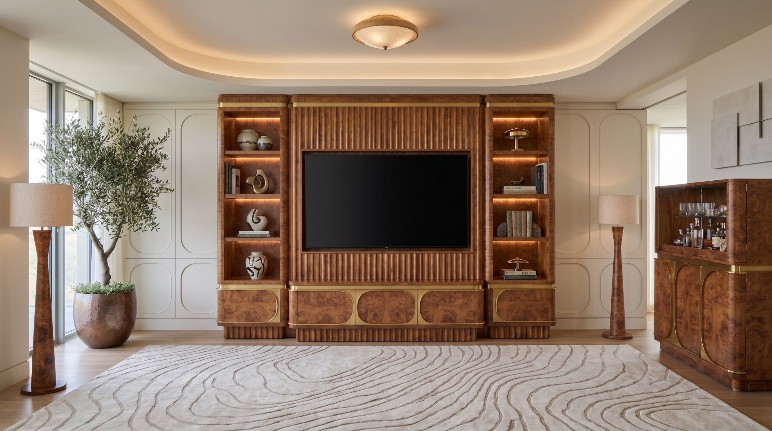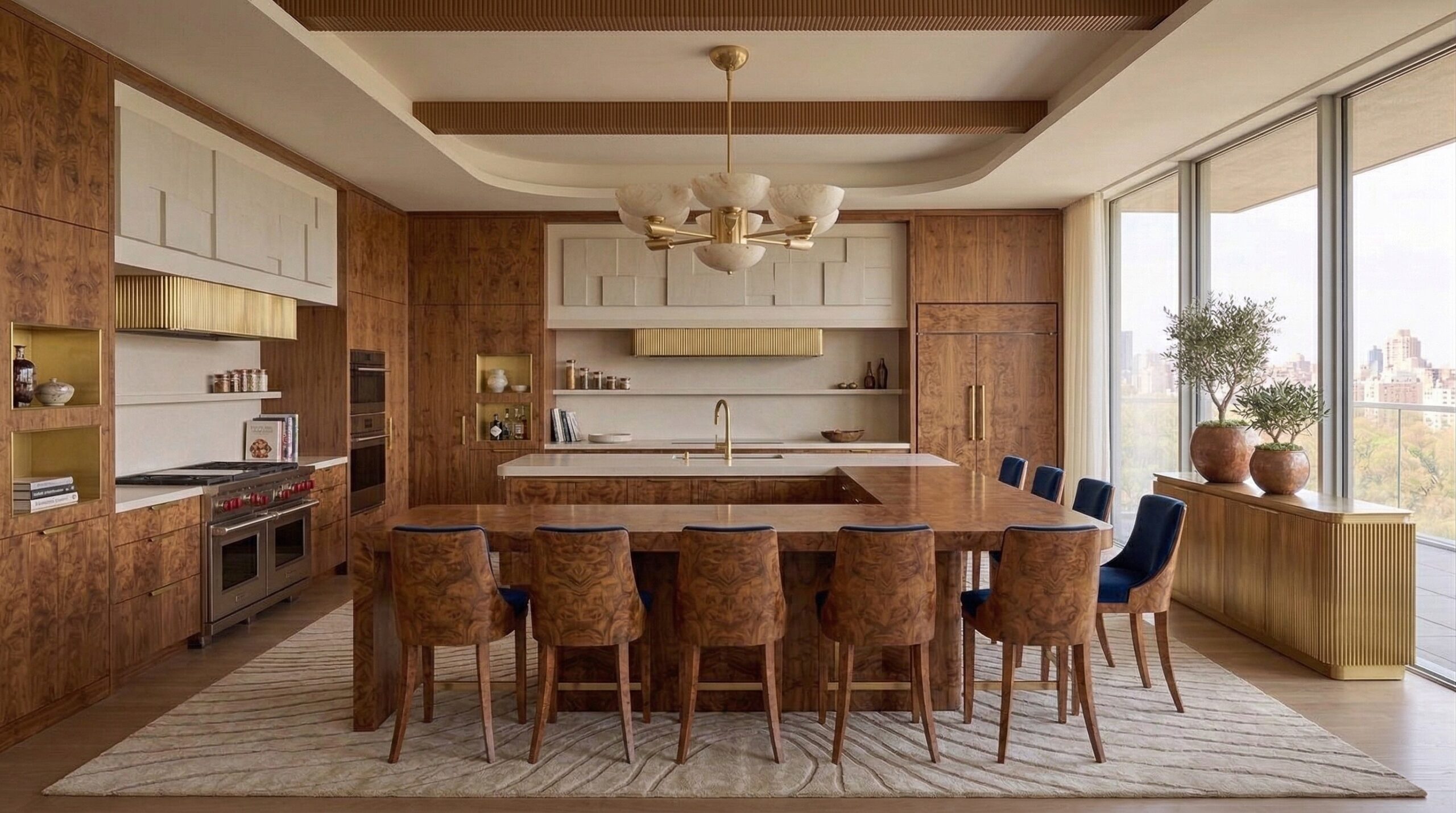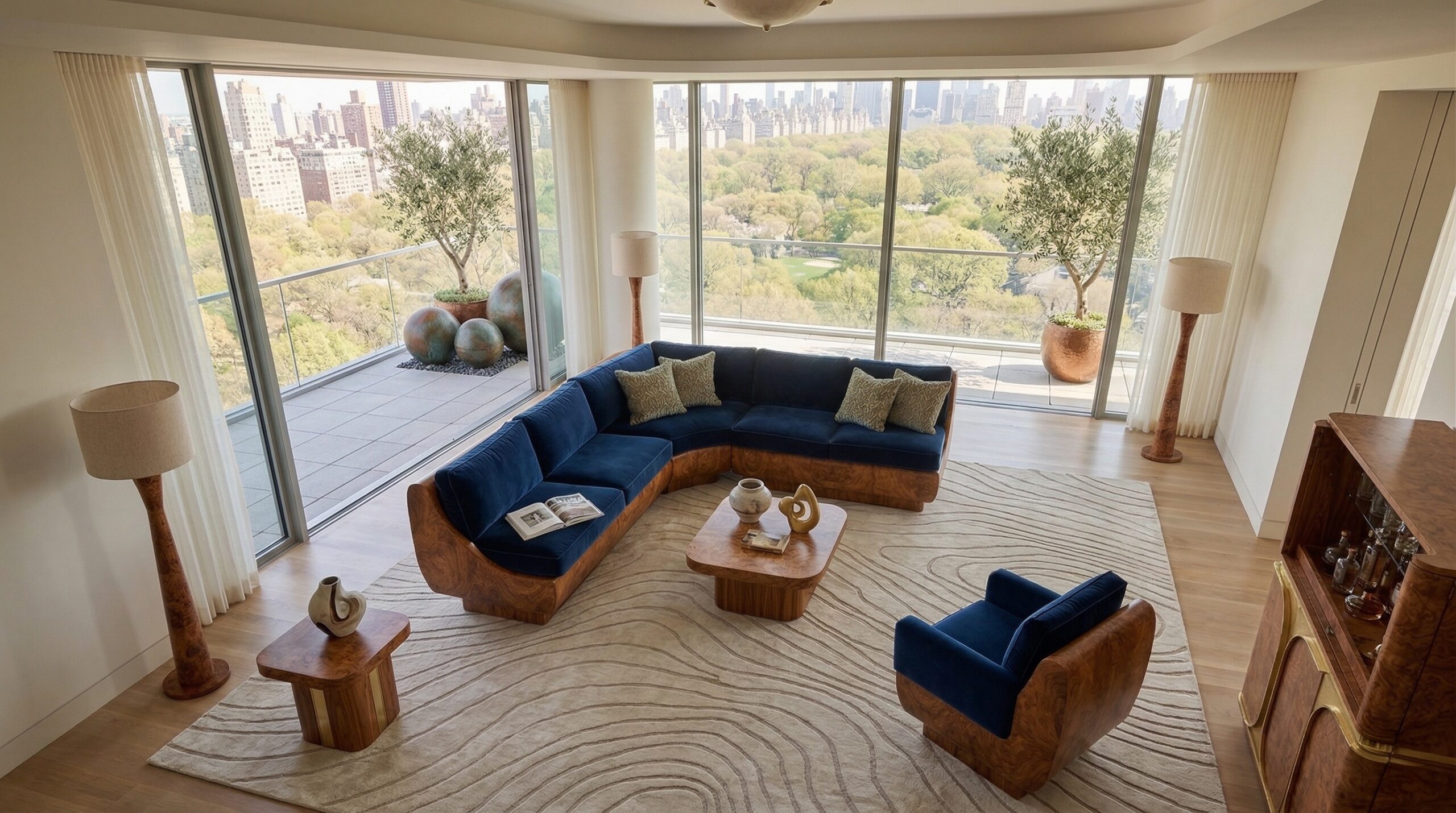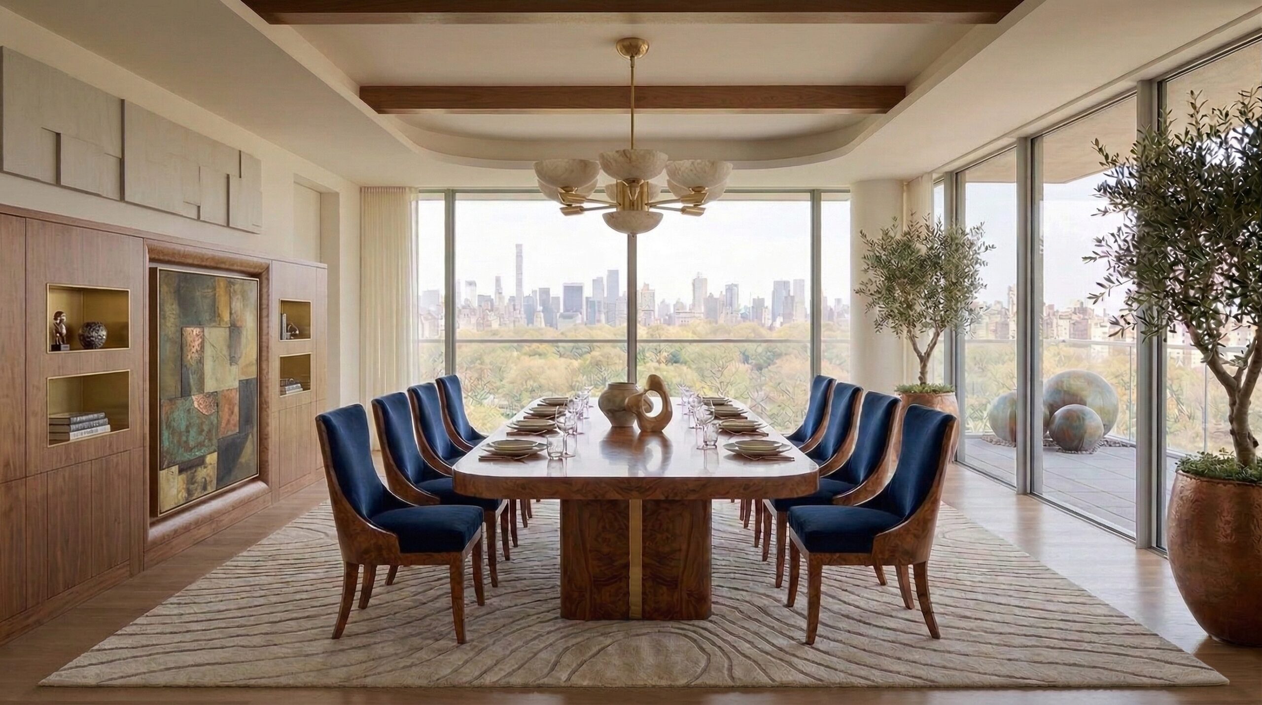 Açık tonlu yüzeyler ve doğal ahşap kaplamalar; mavi vurgulu koltuklar, kavisli oturma elemanları, masif yemek masası ve bütünleşik yatak tasarımı ile dengelenir. Yumuşak dokulu halılar, sade aydınlatmalar ve gömme raf sistemleri mekânda sıcak ve rafine bir bütünlük oluşturur.