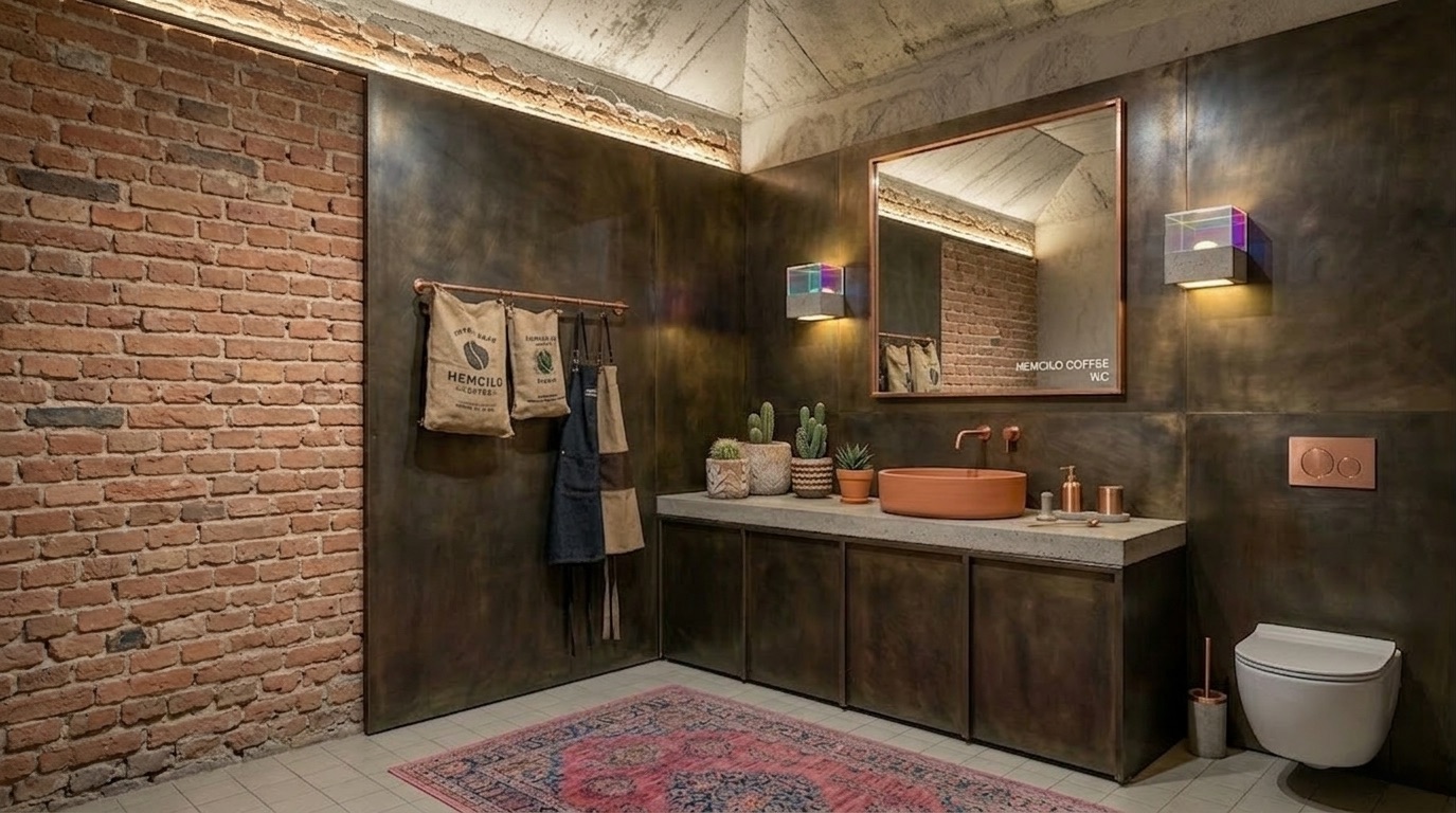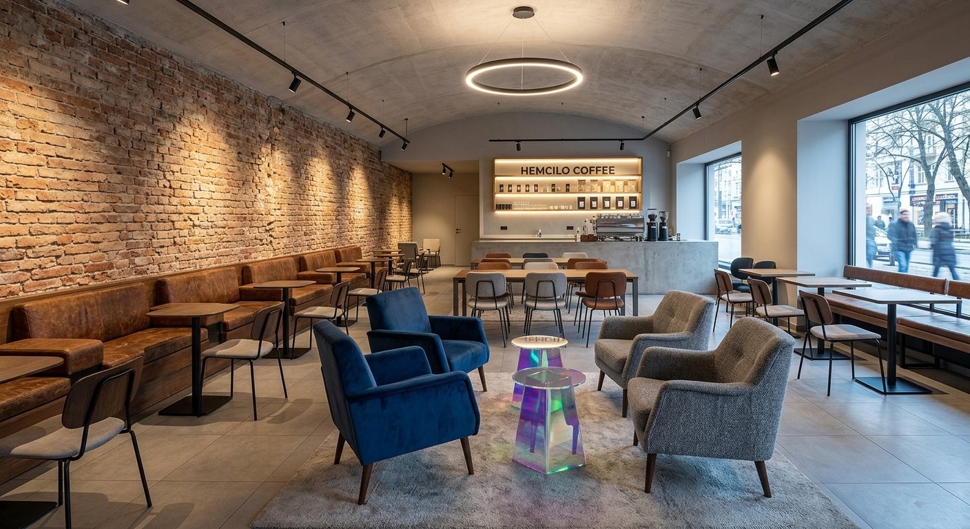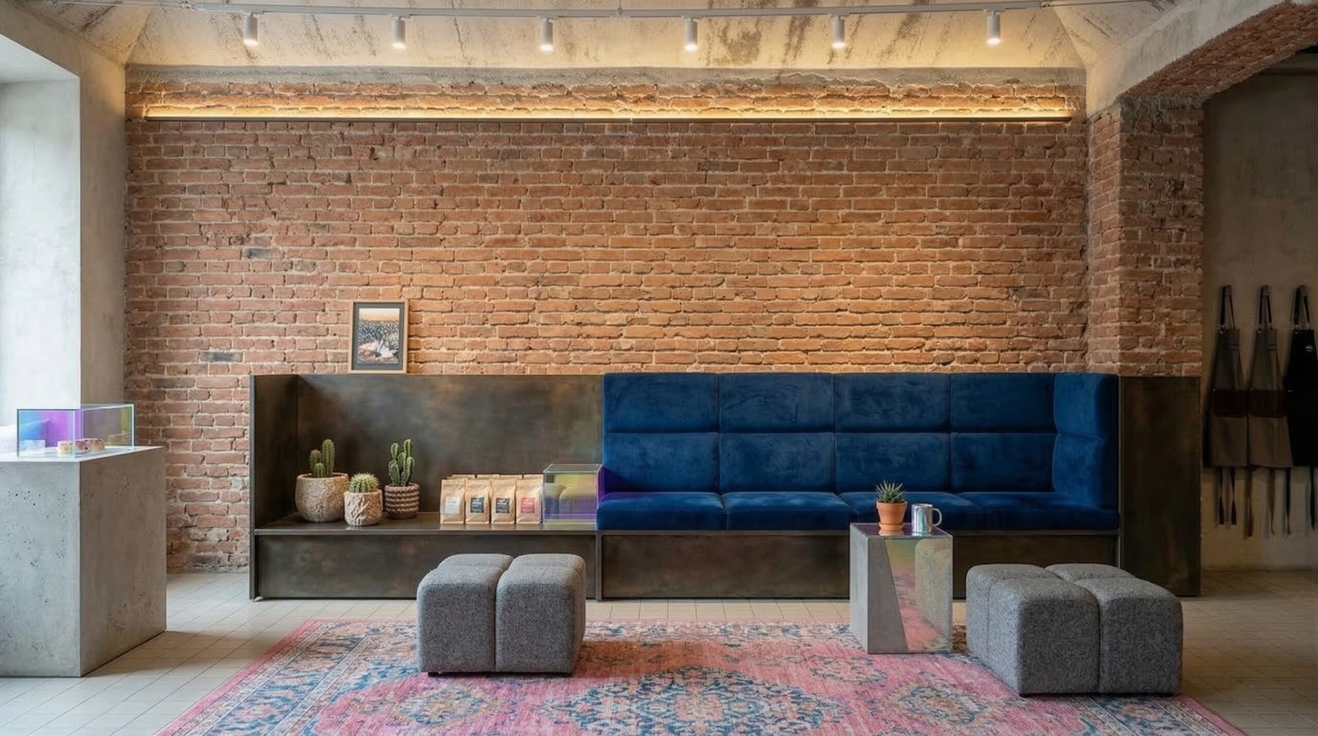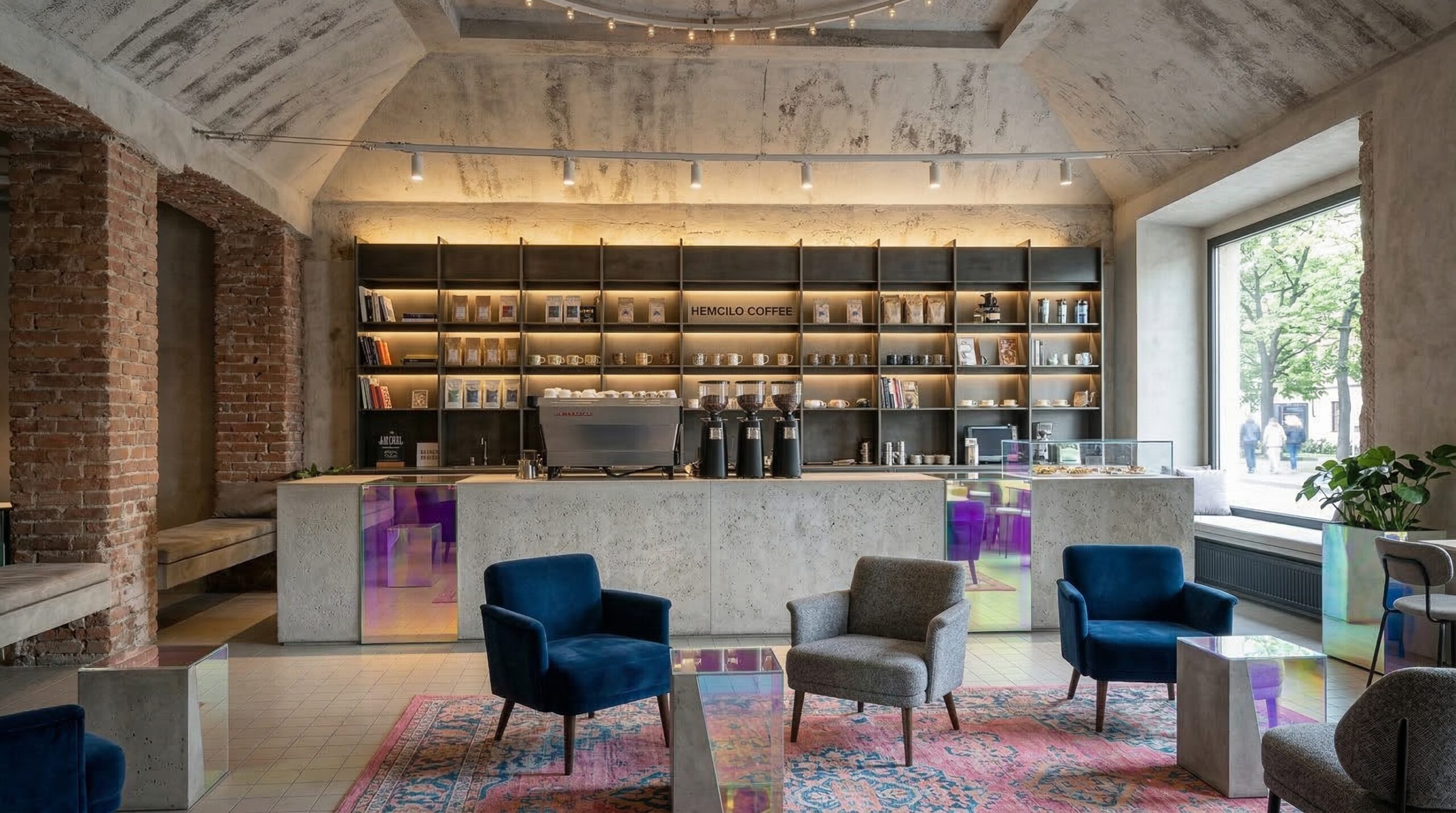 Endüstriyel kabuğun (tuğla duvarlar, ham beton tavan) çağdaş ve sanatsal dokunuşlarla yeniden yorumlandığı bir kafe tasarımı. Mekânda nötr yüzeyler; prizmatik, yarı saydam renkli elemanlar ve tekstil detaylarıyla kontrast oluştururken, lineer aydınlatma ve raf sistemleri mekâna derinlik kazandırır. Oturma alanlarında kullanılan yumuşak formlar ve sıcak tonlar, sert endüstriyel kabuğu dengelerken; girişten bar alanına kadar açık ve akıcı bir mekânsal kurgu oluşturulmuştur.