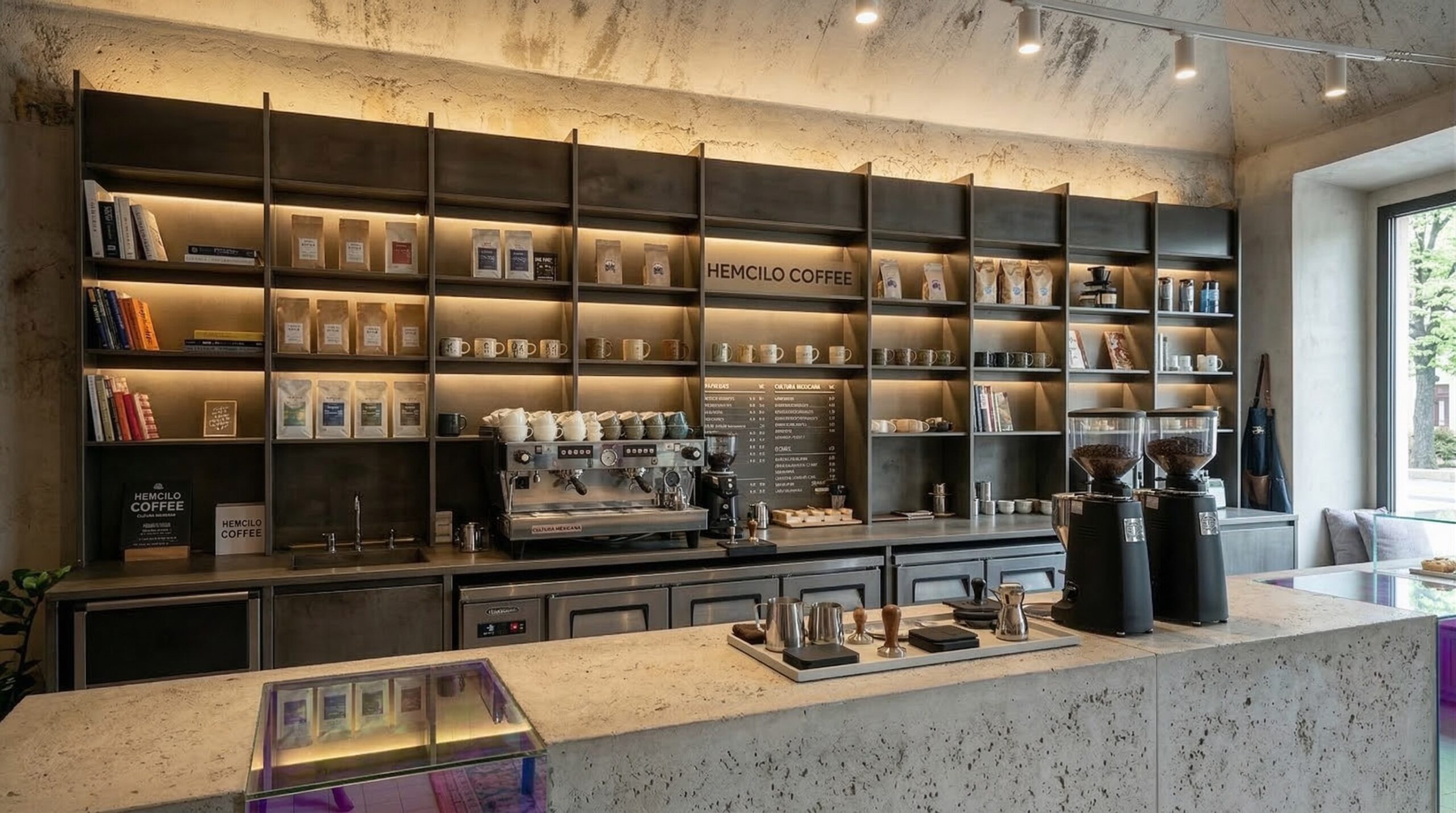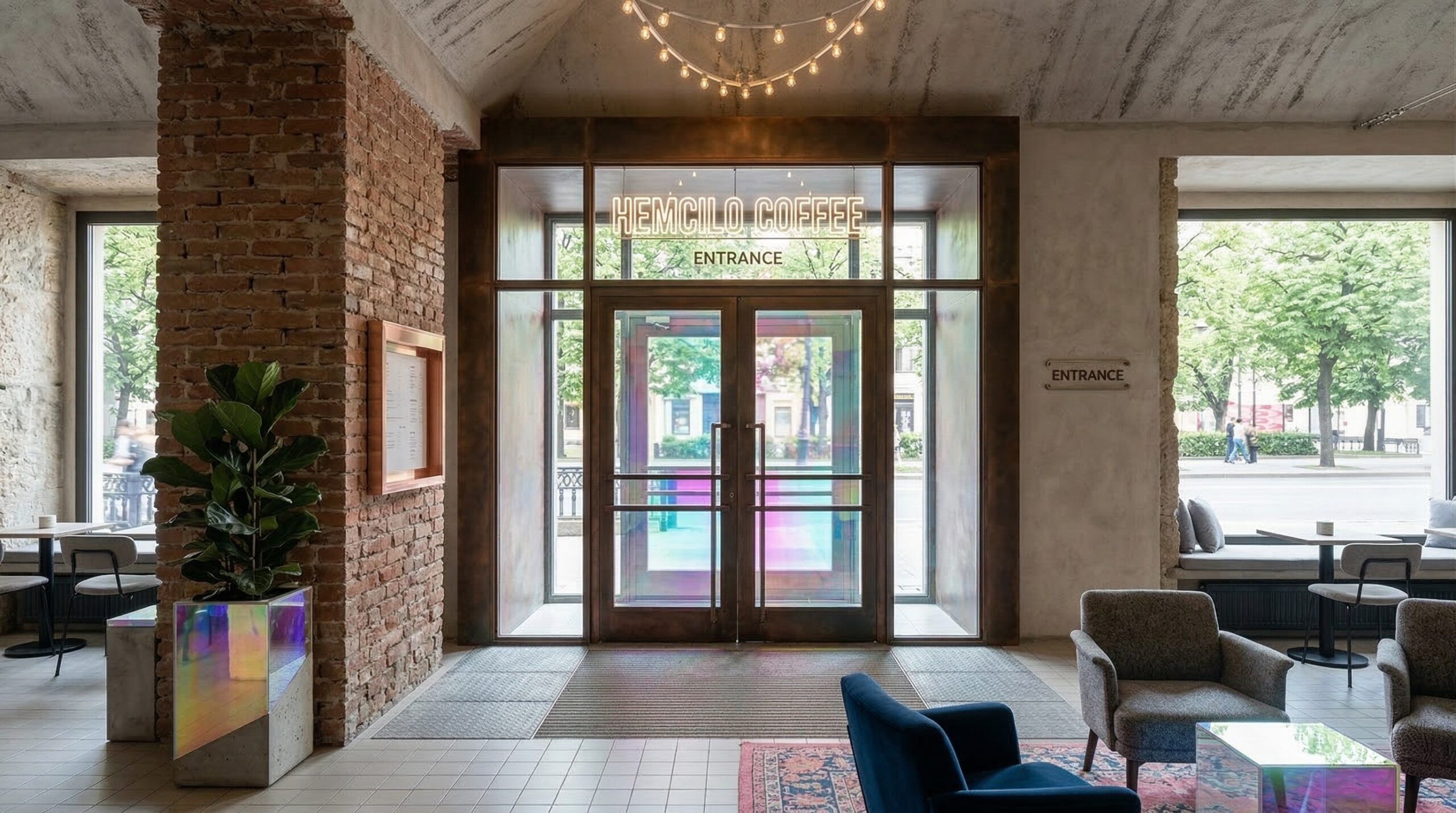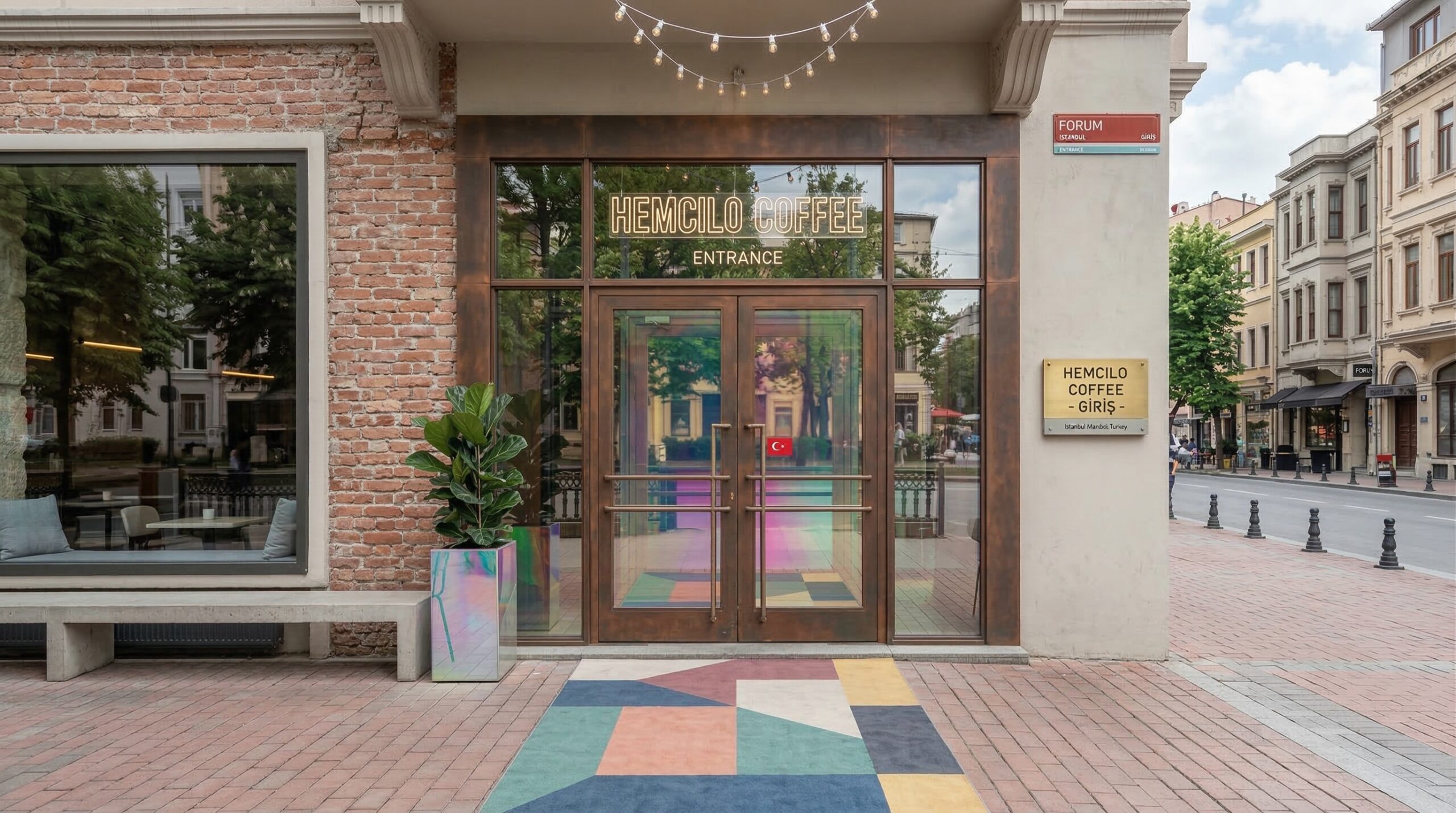 Endüstriyel kabuğun (tuğla duvarlar, ham beton tavan) çağdaş ve sanatsal dokunuşlarla yeniden yorumlandığı bir kafe tasarımı. Mekânda nötr yüzeyler; prizmatik, yarı saydam renkli elemanlar ve tekstil detaylarıyla kontrast oluştururken, lineer aydınlatma ve raf sistemleri mekâna derinlik kazandırır. Oturma alanlarında kullanılan yumuşak formlar ve sıcak tonlar, sert endüstriyel kabuğu dengelerken; girişten bar alanına kadar açık ve akıcı bir mekânsal kurgu oluşturulmuştur.