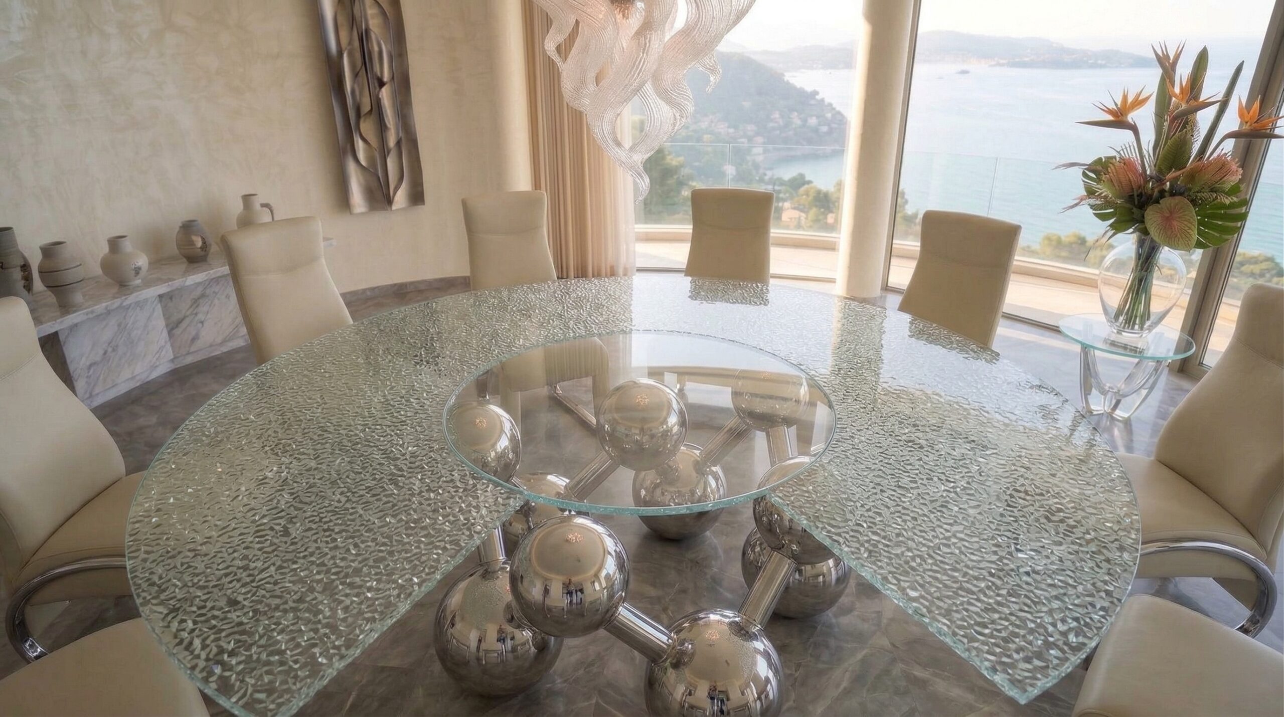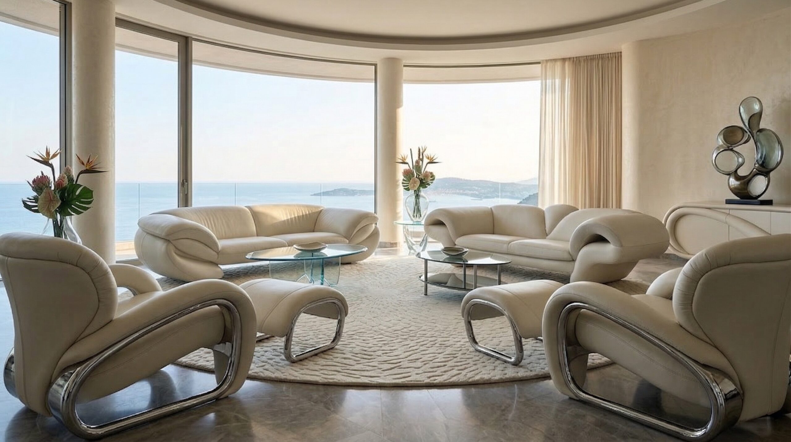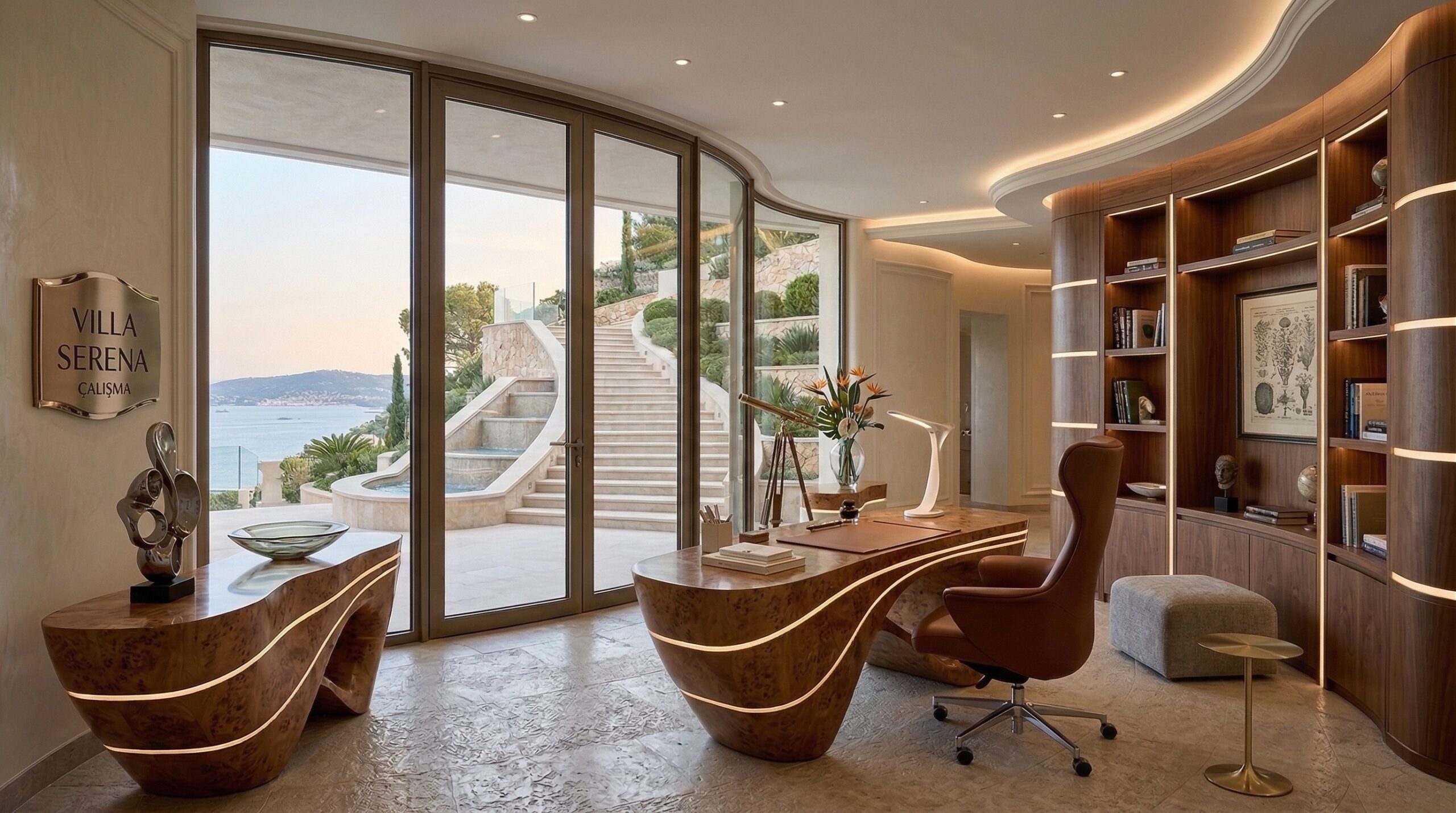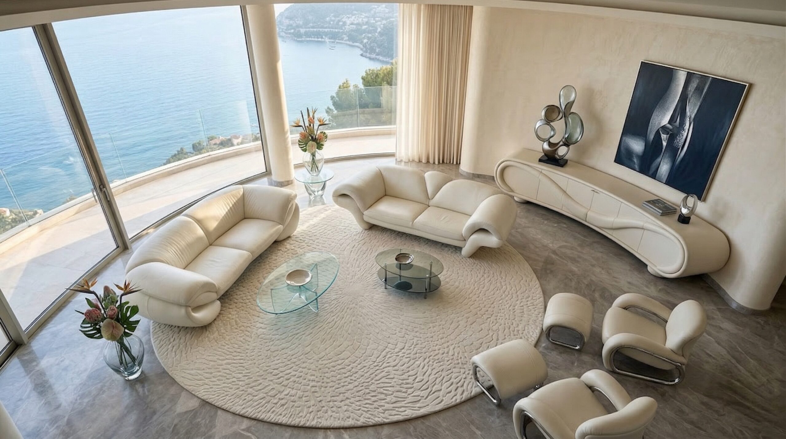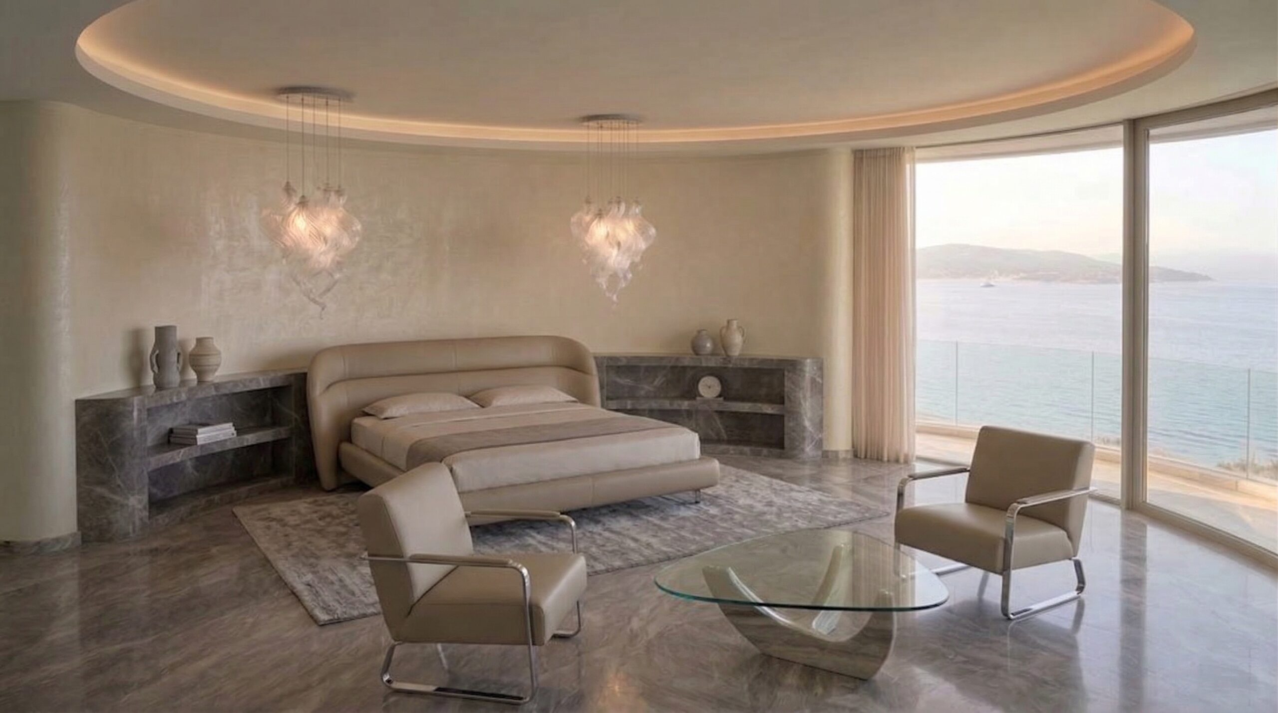 Kavisli cephe geometrisi ve kesintisiz cam yüzeyleri ile öne çıkan bu rezidans tasarımı, deniz manzarasını mekânın ana odağı haline getirir. Yarım daire formunda çözülen plan kurgusu, tüm yaşam alanlarının manzaraya yönlenmesini sağlayarak mekânsal sürekliliği güçlendirir.