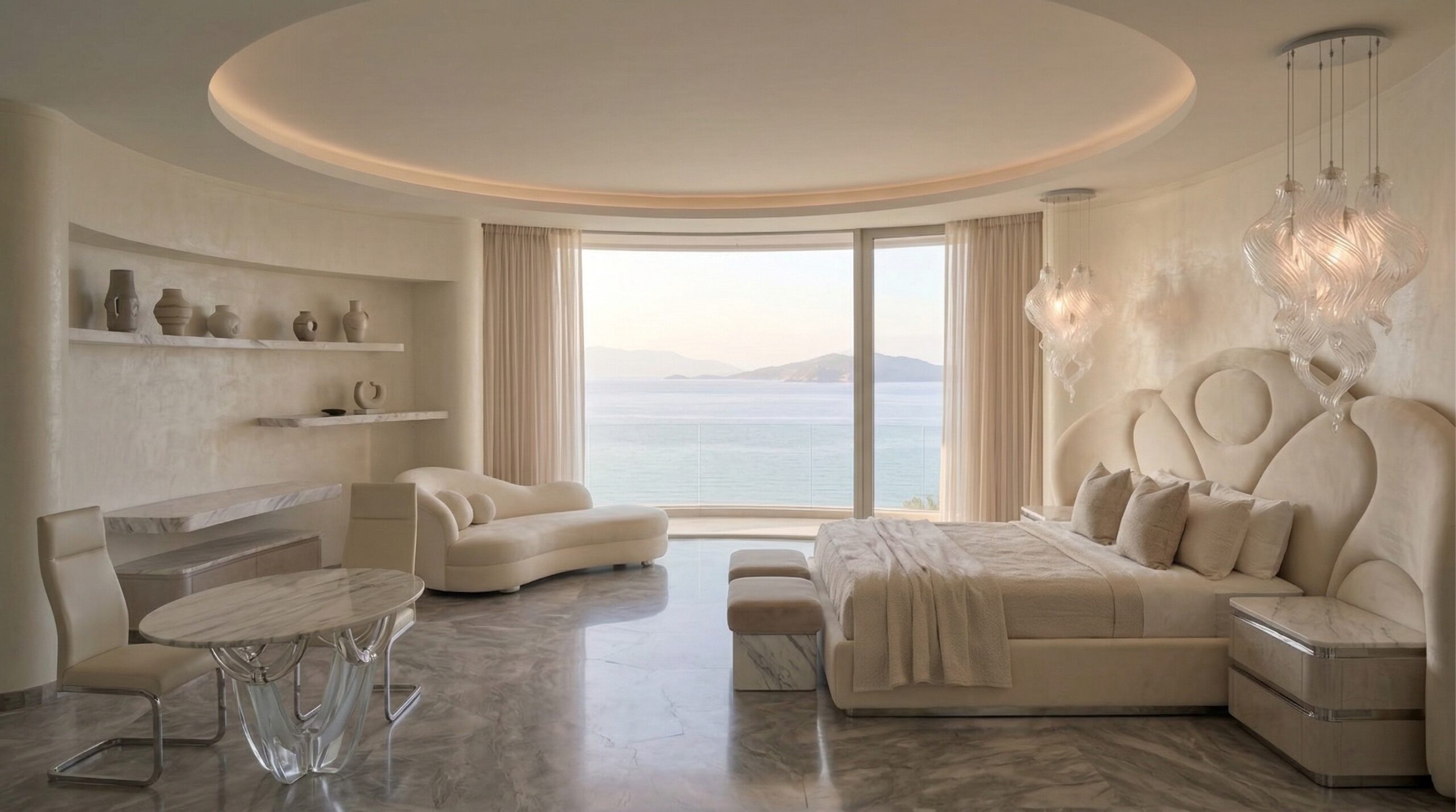 İç mekânlarda açık bej tonları, doğal taş yüzeyler ve yumuşak dokular hâkimdir. Heykelsi mobilya formları ve dairesel aydınlatma elemanları, mimari dil ile uyumlu bir bütünlük oluşturur. Işık, yüzey ve form ilişkisi, mekânın algısını sürekli olarak dönüştüren dinamik bir atmosfer yaratır.