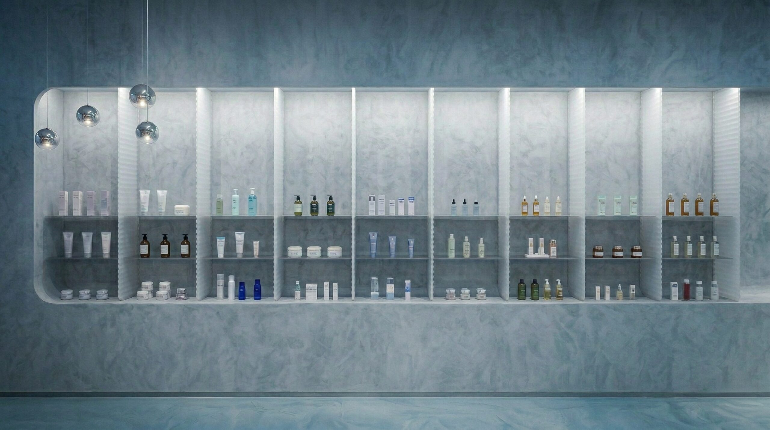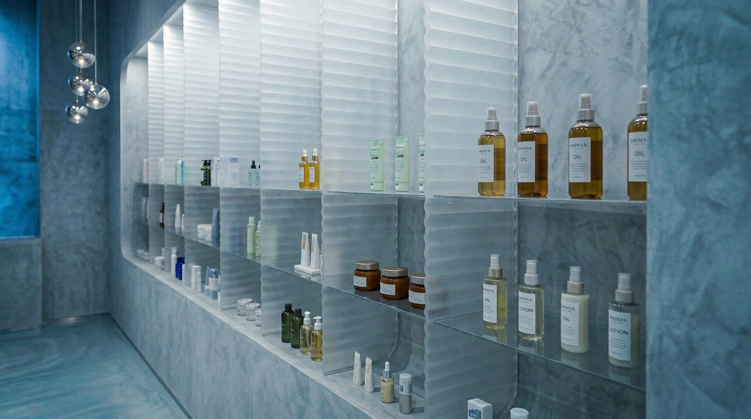 Minimalist yaklaşım ve sınırlı renk paleti, mekânsal sadeliği ön plana çıkarırken; ışık, yansıma ve malzeme ilişkisi üzerinden güçlü bir atmosfer üretir. Tasarım dili, perakende mekânını duyusal bir “laboratuvar” deneyimine dönüştürerek kullanıcıya sakin ve akışkan bir keşif sunar.