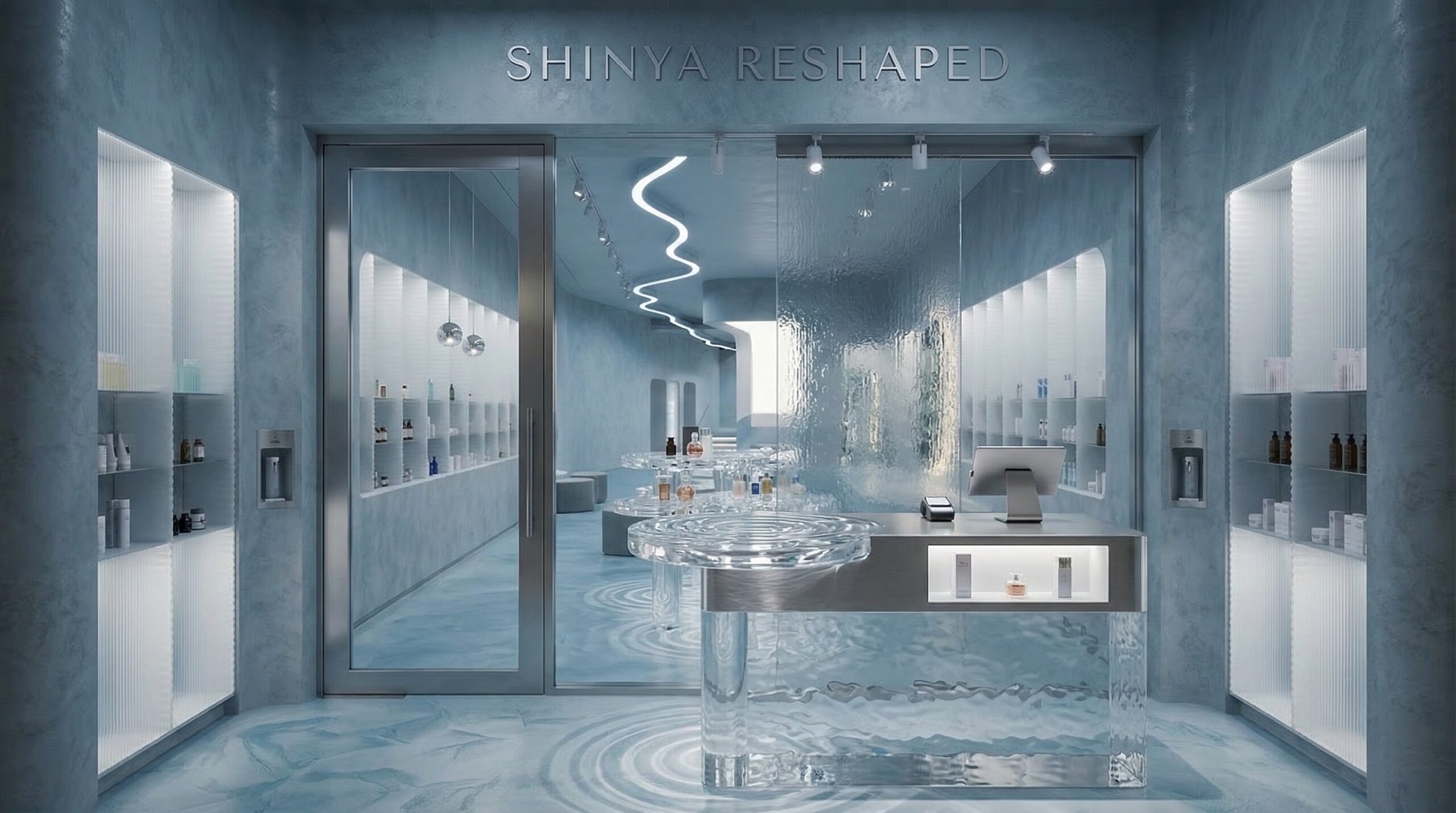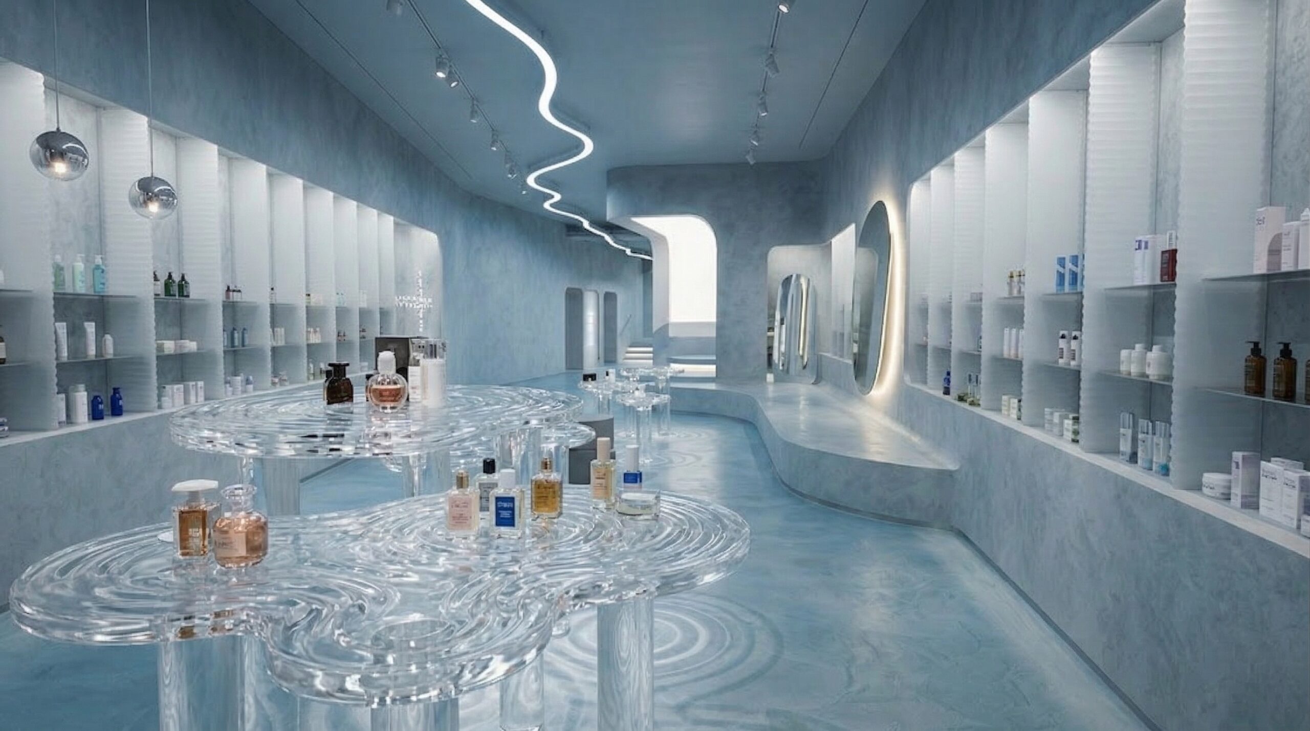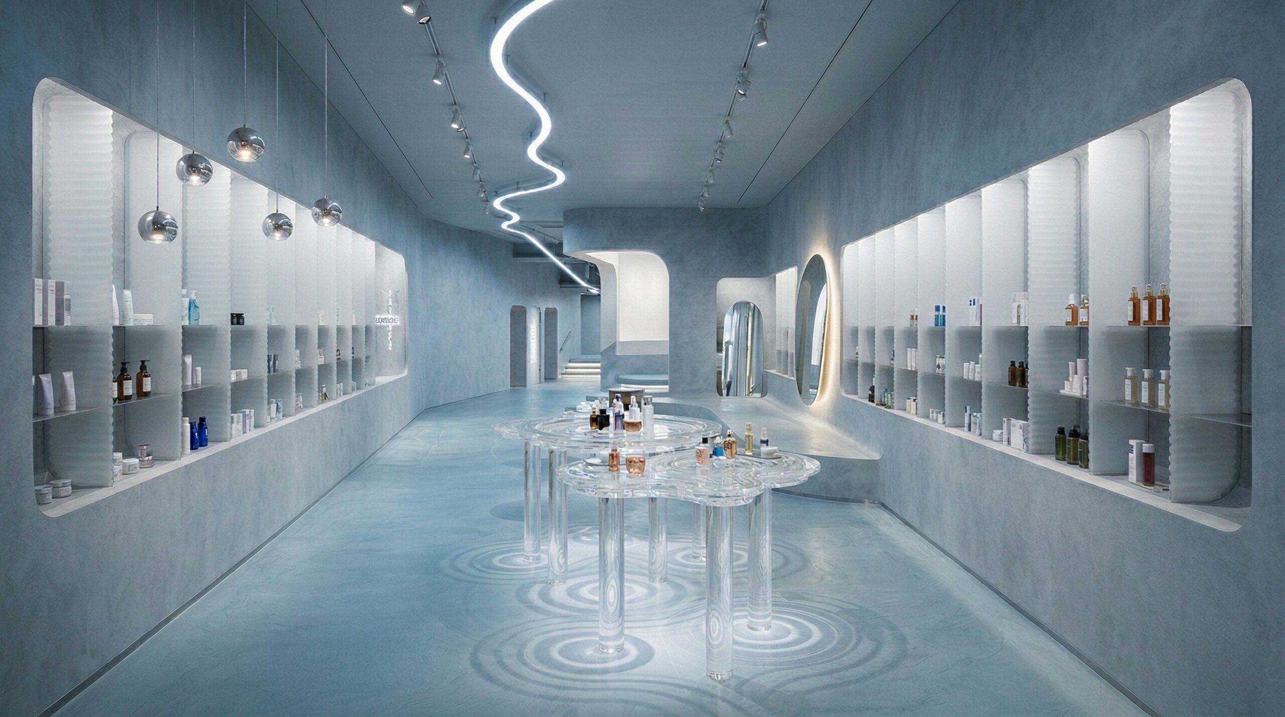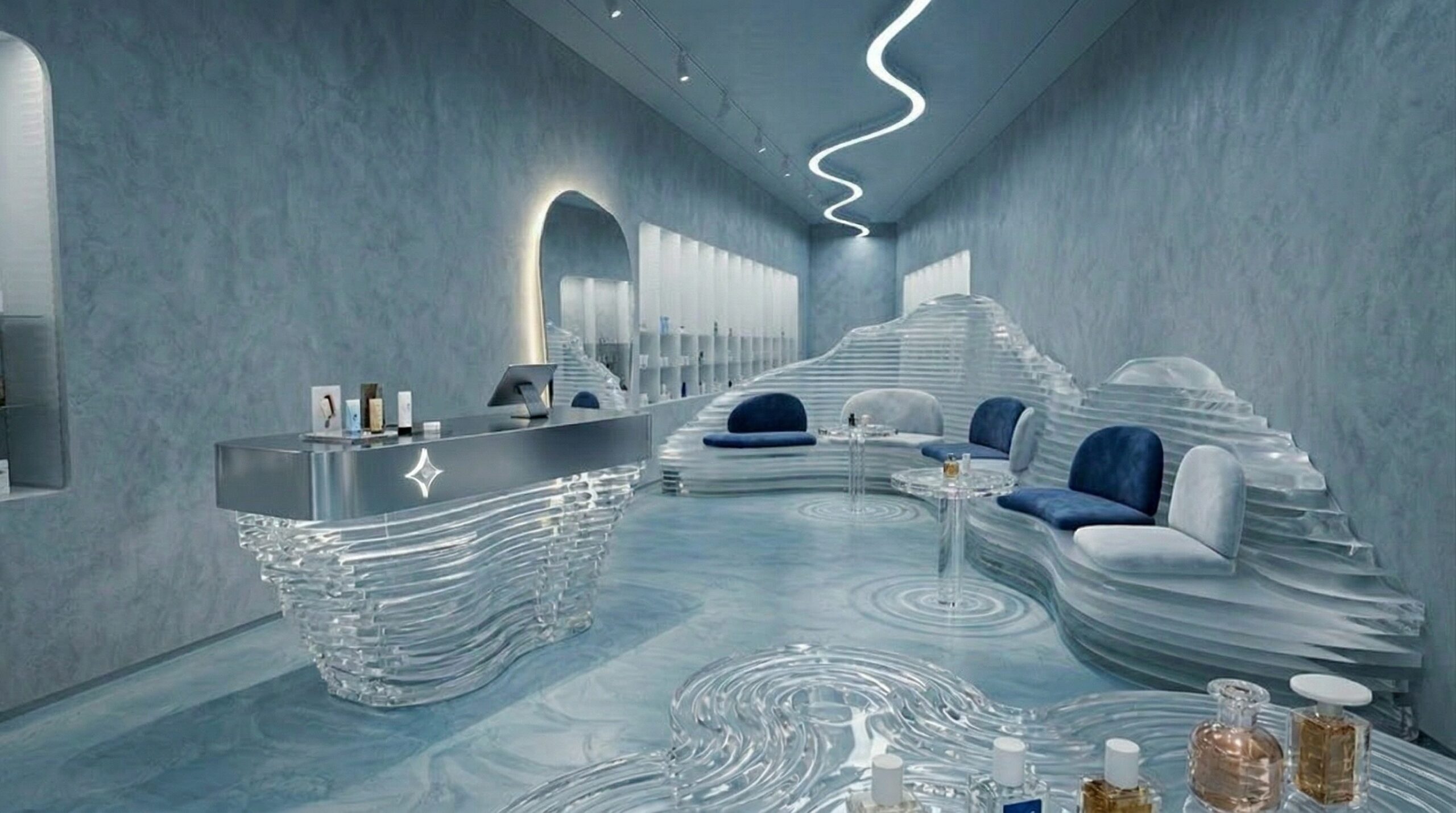 Akışkan yüzeyler ve monokrom mavi tonların hâkim olduğu bu mağaza tasarımı, kullanıcıyı suyun hareketinden ilham alan duyusal bir atmosfere davet eder. Duvar, zemin ve tavan boyunca süreklilik gösteren yumuşak geçişli formlar, mekânda kesintisiz bir akış hissi yaratır.