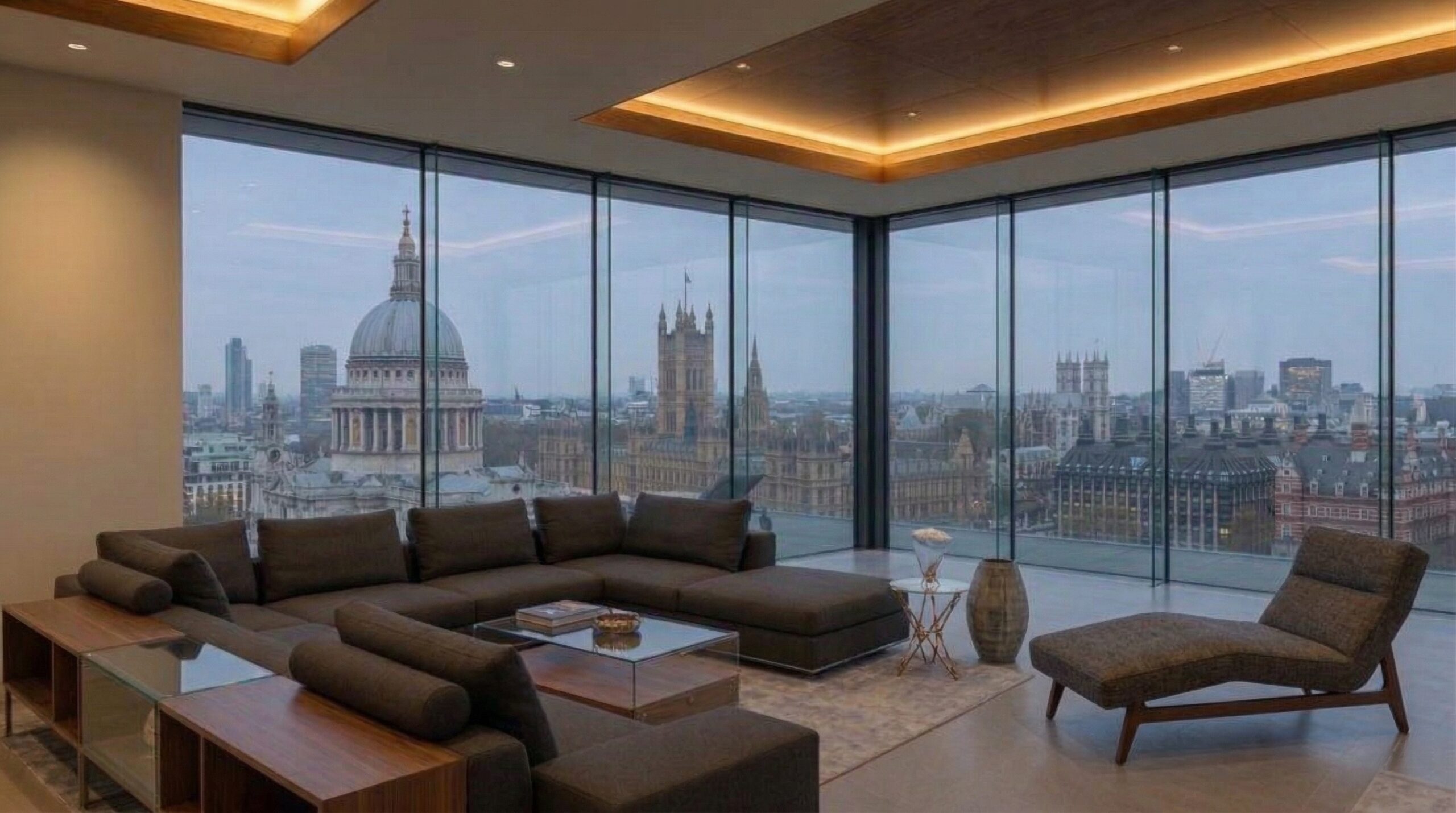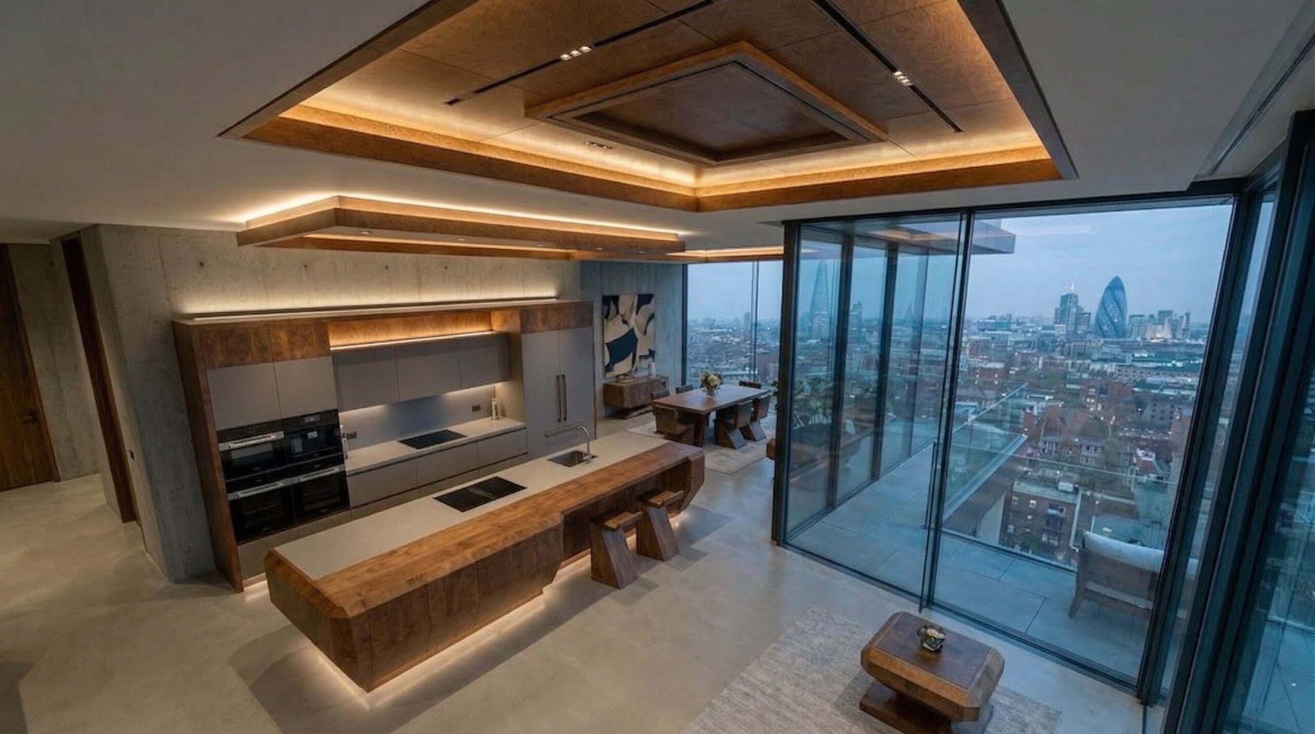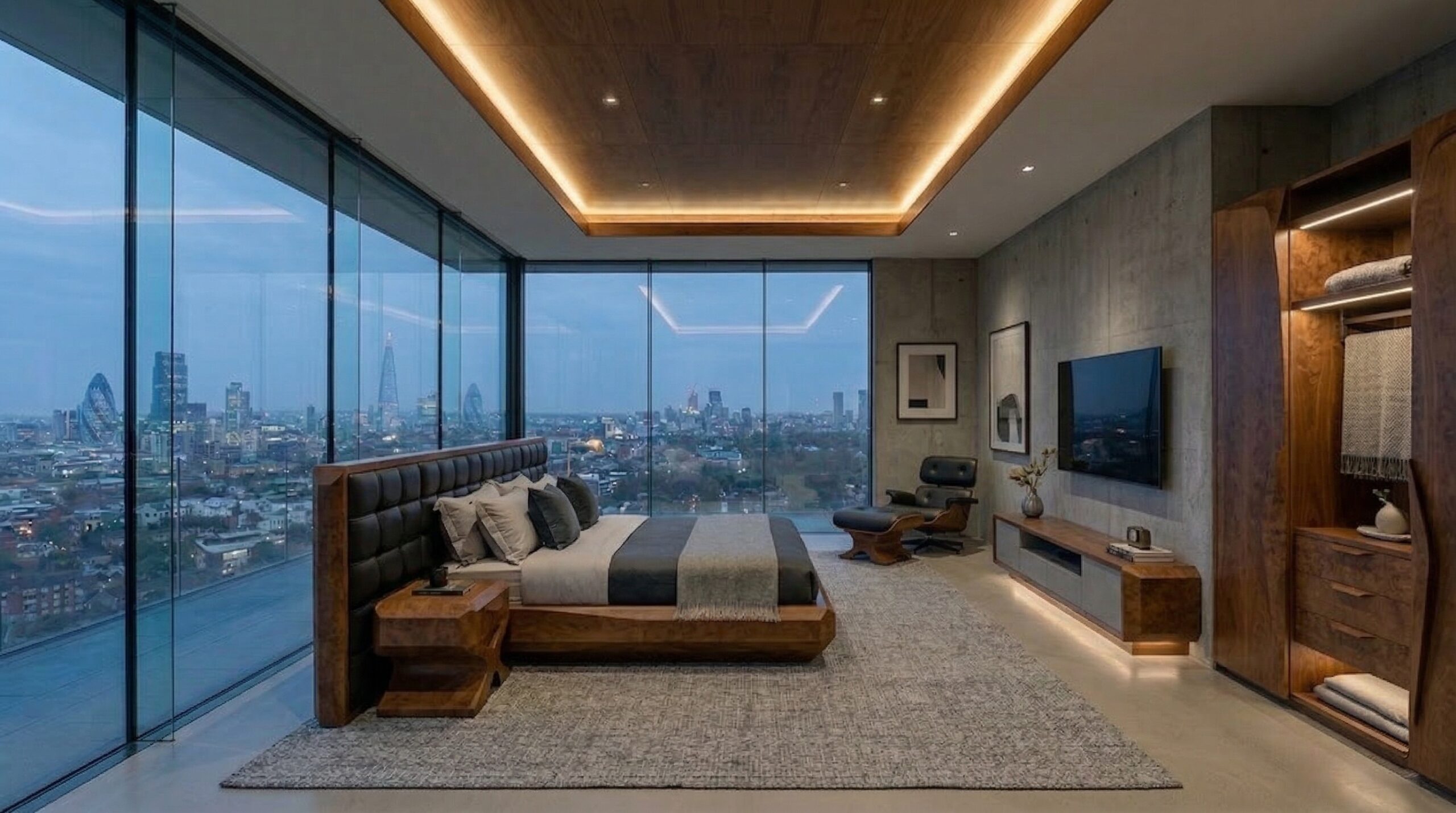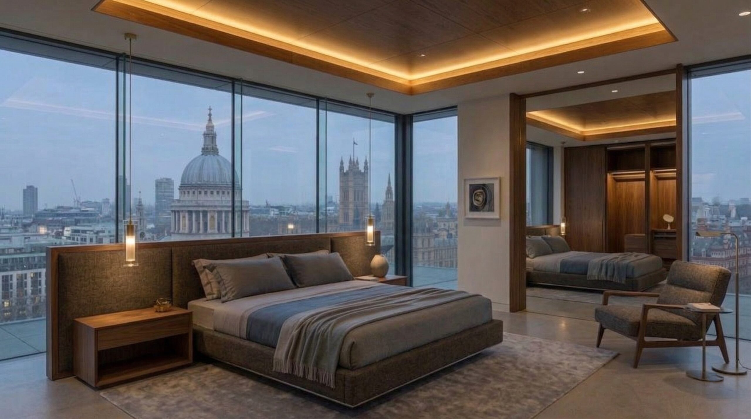 Tam boy cam cepheler ve köşe açıklıkları, Londra silüetini iç mekânın sürekli bir arka planına dönüştürürken; doğal taş yüzeyler ve sıcak ahşap kaplamalar mekâna dengeli bir sıcaklık kazandırır. Geniş mutfak adası, yekpare ahşap yemek masası ve düşük profilli modüler oturma grupları mekânsal akışı desteklerken; özel tasarım yatak, deri detaylı başlıklar ve lineer aydınlatmalar sakin bir lüks dili oluşturur. Bronz dokunuşlar, taş zeminler ve yumuşak dokulu tekstiller, modern minimal yaklaşımı malzeme derinliğiyle zenginleştiri