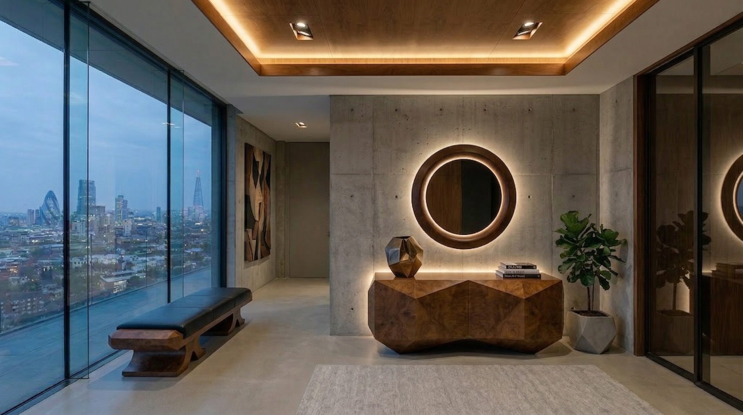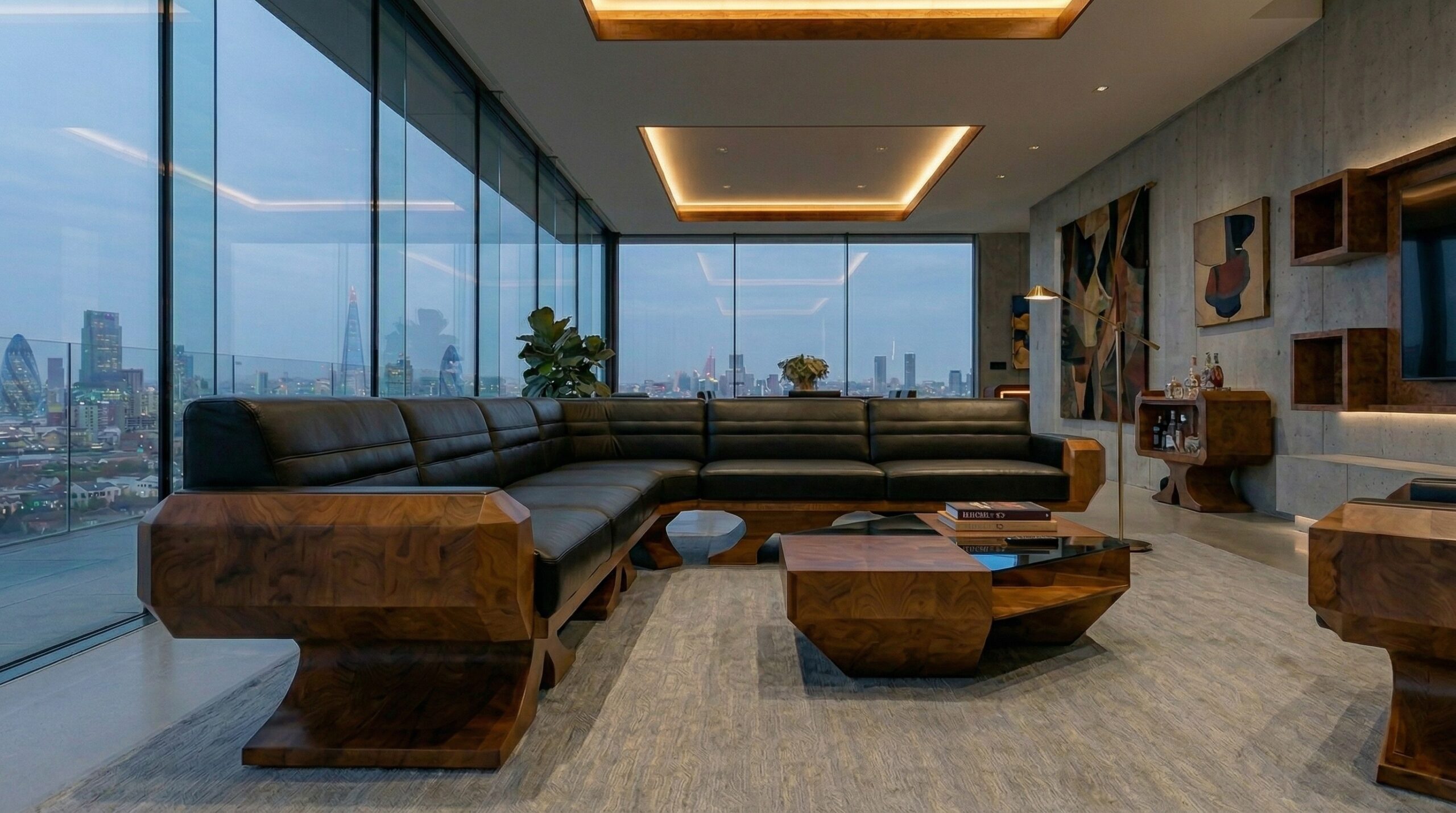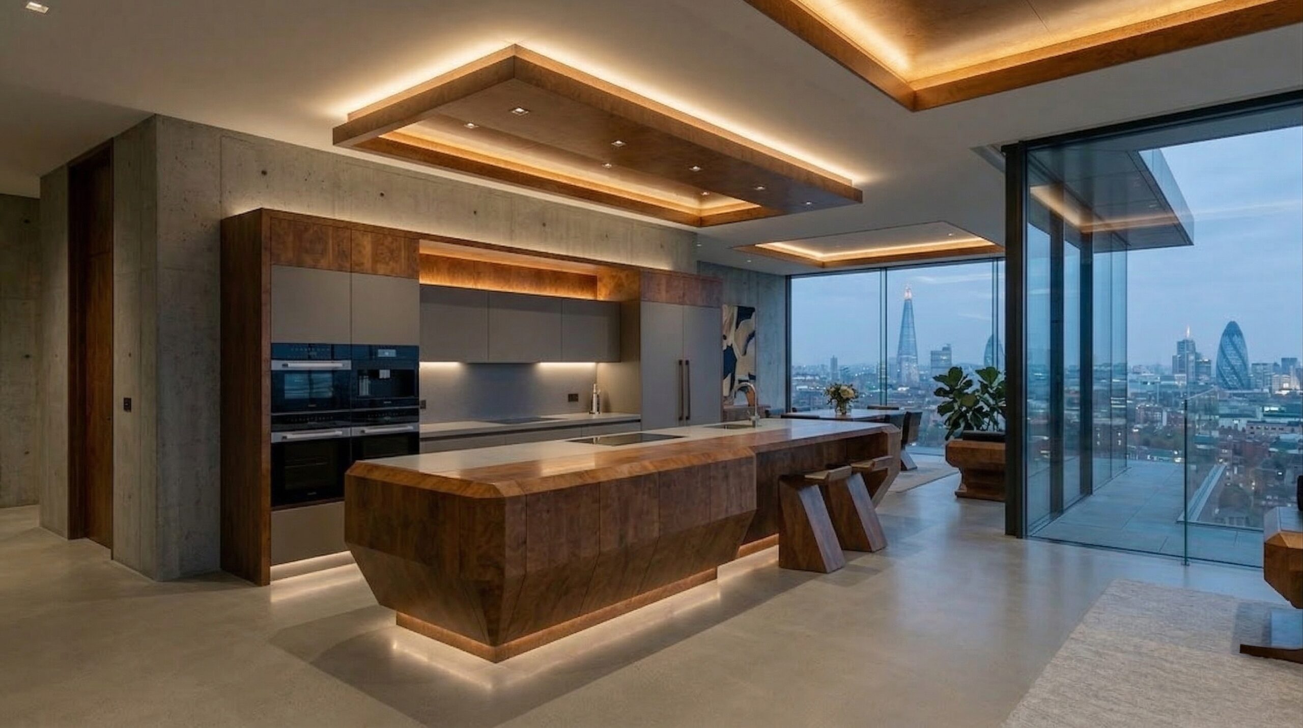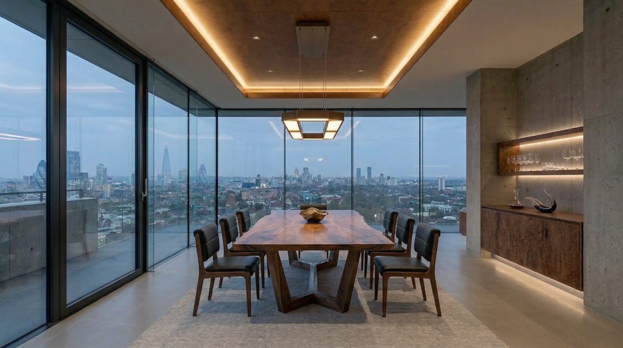 Tam boy cam cepheler ve köşe açıklıkları, Londra silüetini iç mekânın sürekli bir arka planına dönüştürürken; doğal taş yüzeyler ve sıcak ahşap kaplamalar mekâna dengeli bir sıcaklık kazandırır. Geniş mutfak adası, yekpare ahşap yemek masası ve düşük profilli modüler oturma grupları mekânsal akışı desteklerken; özel tasarım yatak, deri detaylı başlıklar ve lineer aydınlatmalar sakin bir lüks dili oluşturur. Bronz dokunuşlar, taş zeminler ve yumuşak dokulu tekstiller, modern minimal yaklaşımı malzeme derinliğiyle zenginleştiri