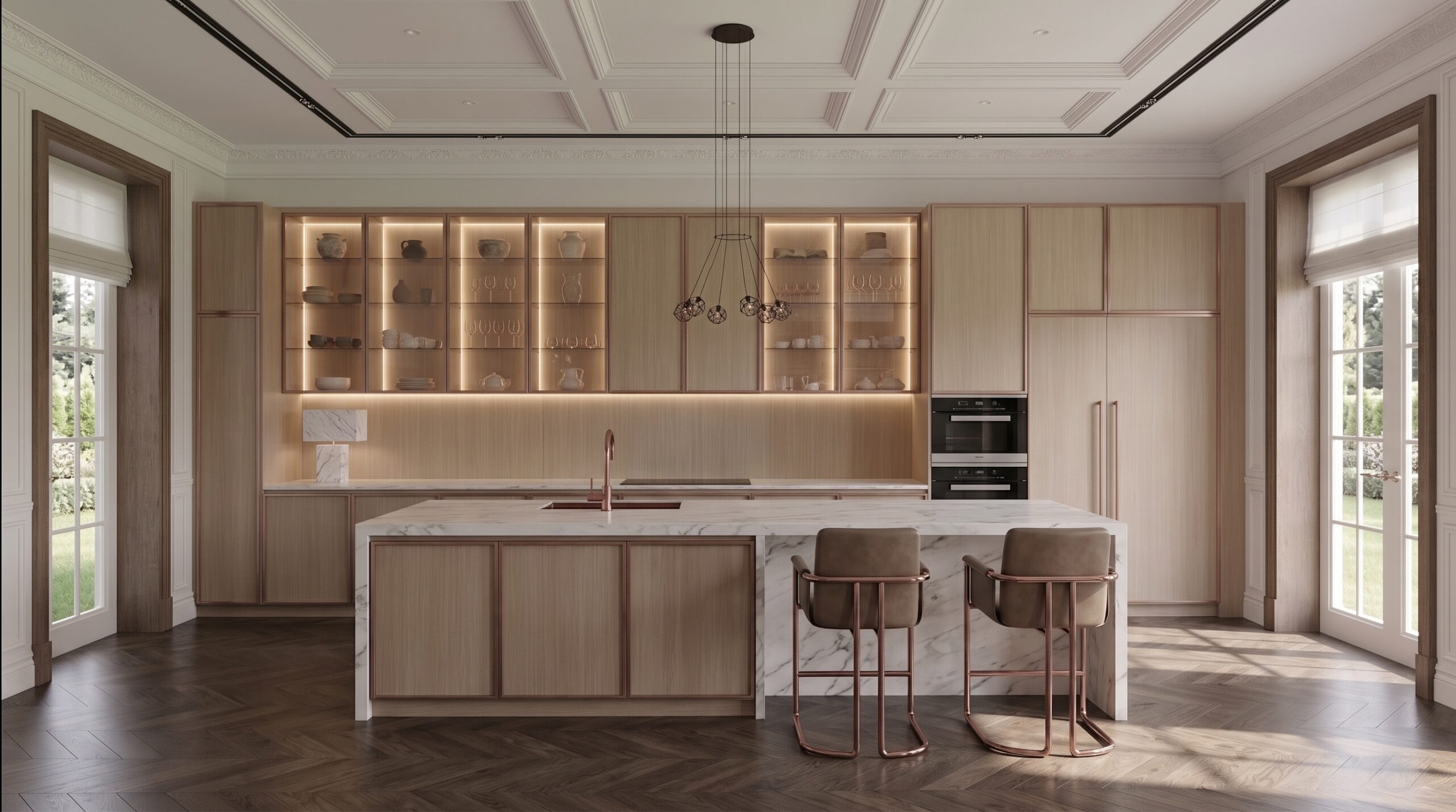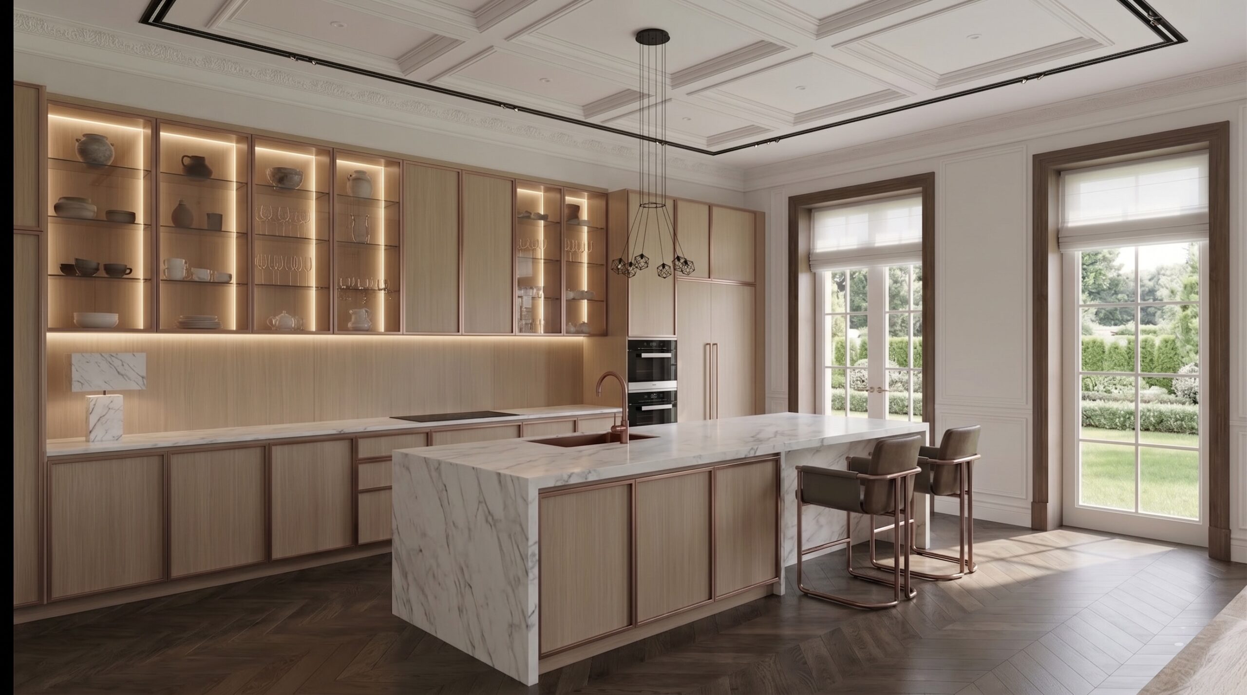 Döşemeli yatak başlıkları, masif ahşap yemek masası, açık ton kumaş ve deri kombinasyonlu oturma grupları ile birlikte mermer yüzeyli orta sehpalar mekânın ana elemanlarını oluşturur. Mutfakta kullanılan açık renk taş ada, entegre dolap sistemleri ve zarif aydınlatmalar, yaşam alanı ile uyumlu bir süreklilik kurar.