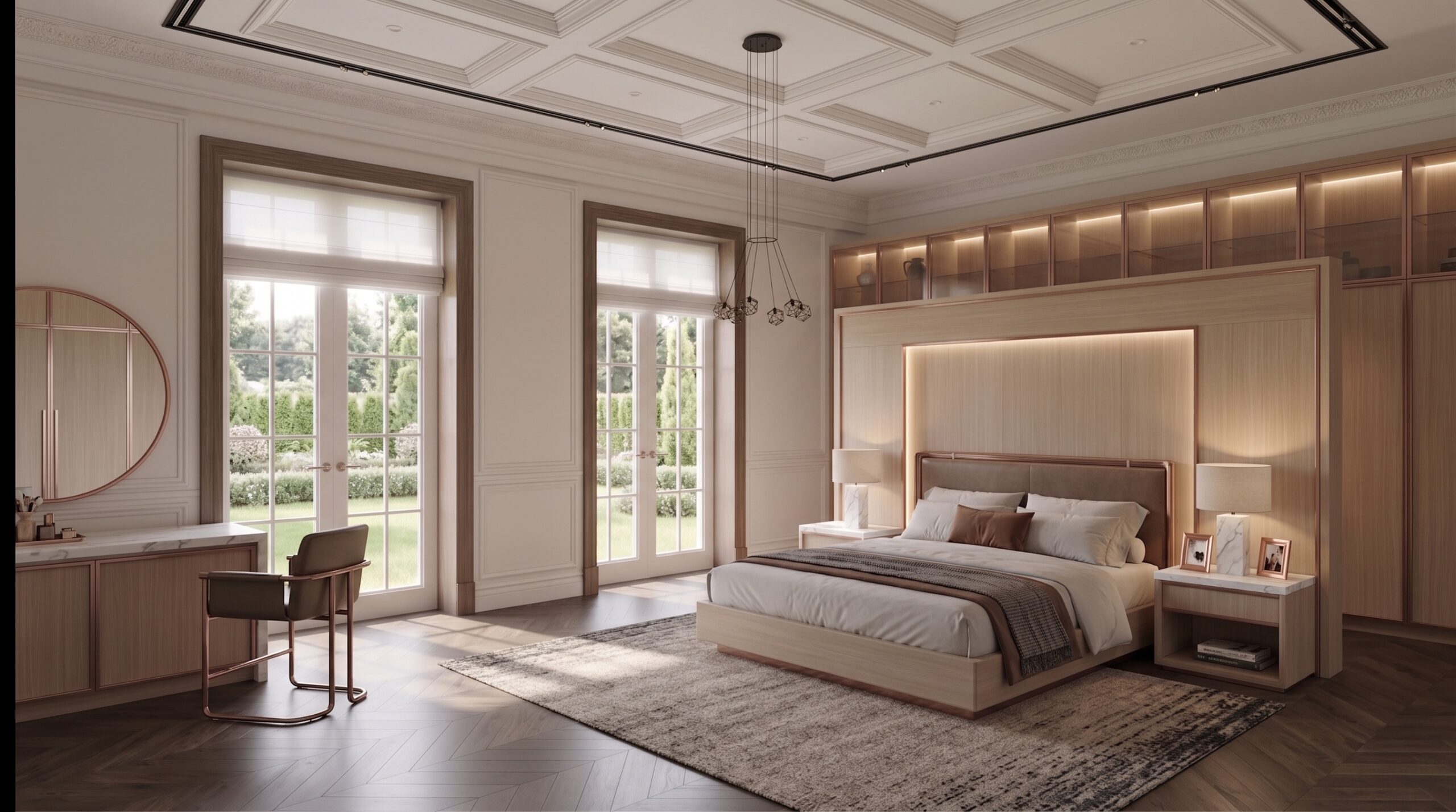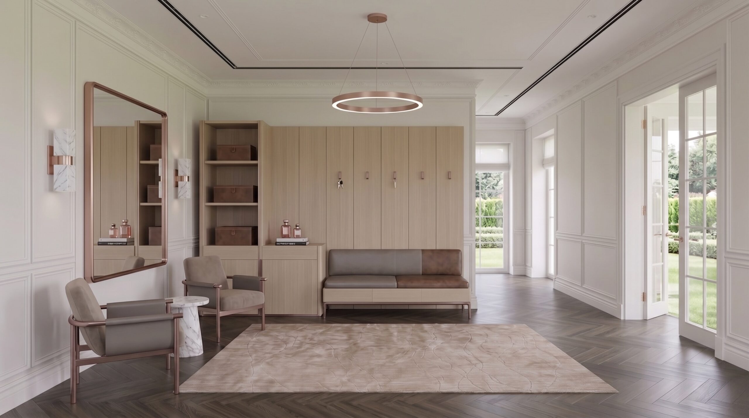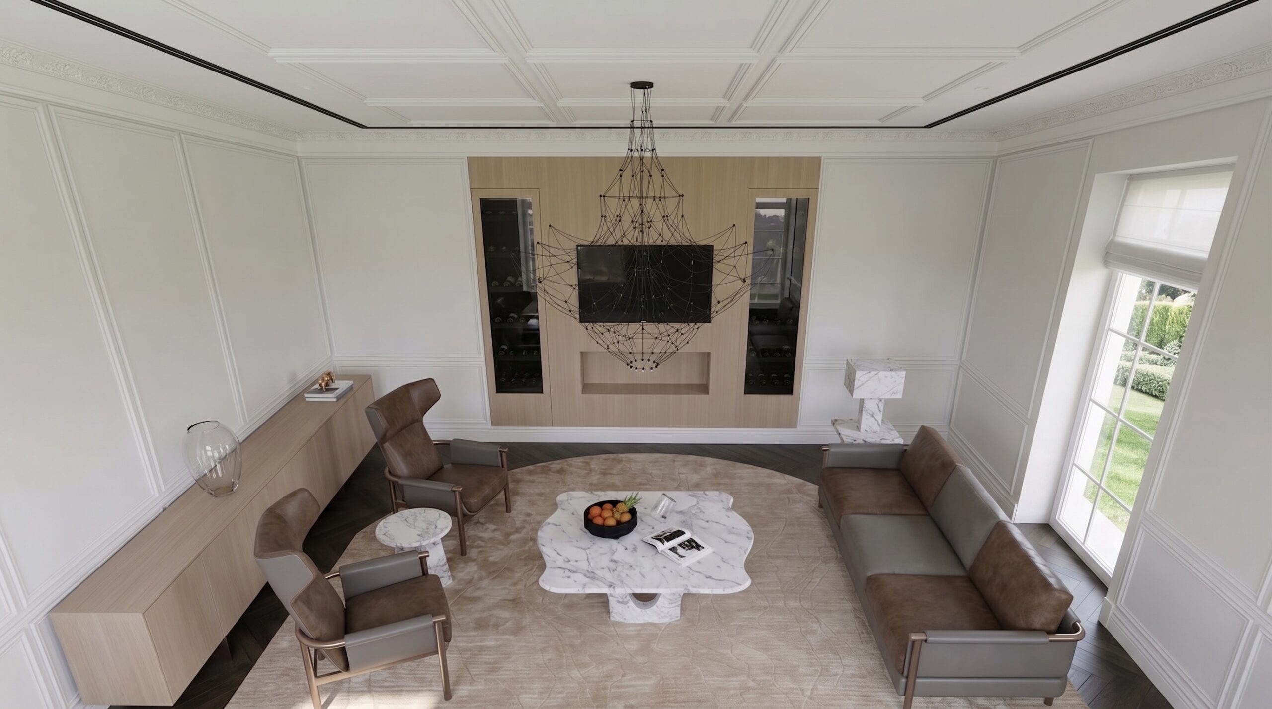 Minimal klasik yaklaşım ile doğal malzeme ve özel üretim mobilya tasarımlarının birleşimi, mekânı yalın, dengeli ve yüksek konforlu bir yaşam alanına dönüştürür.