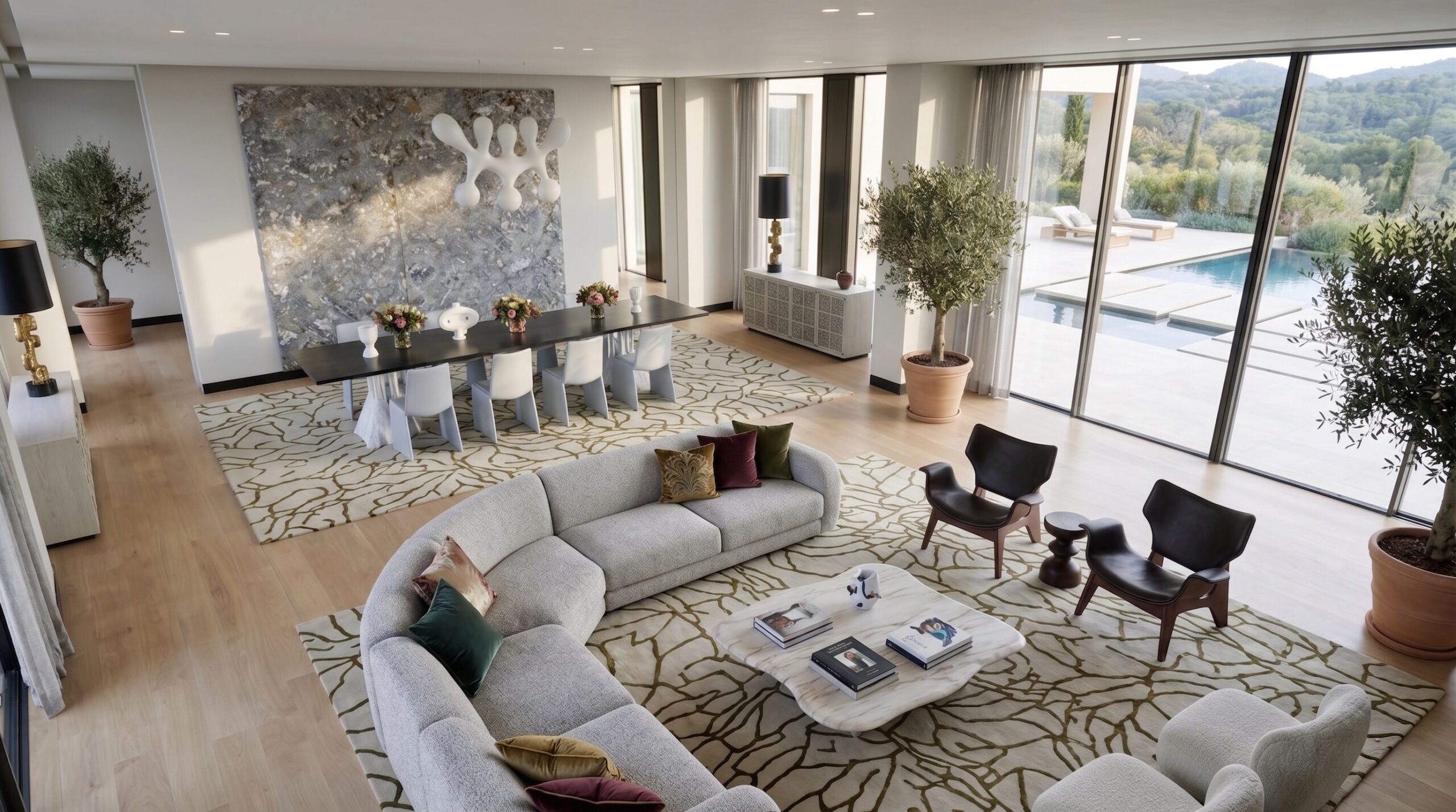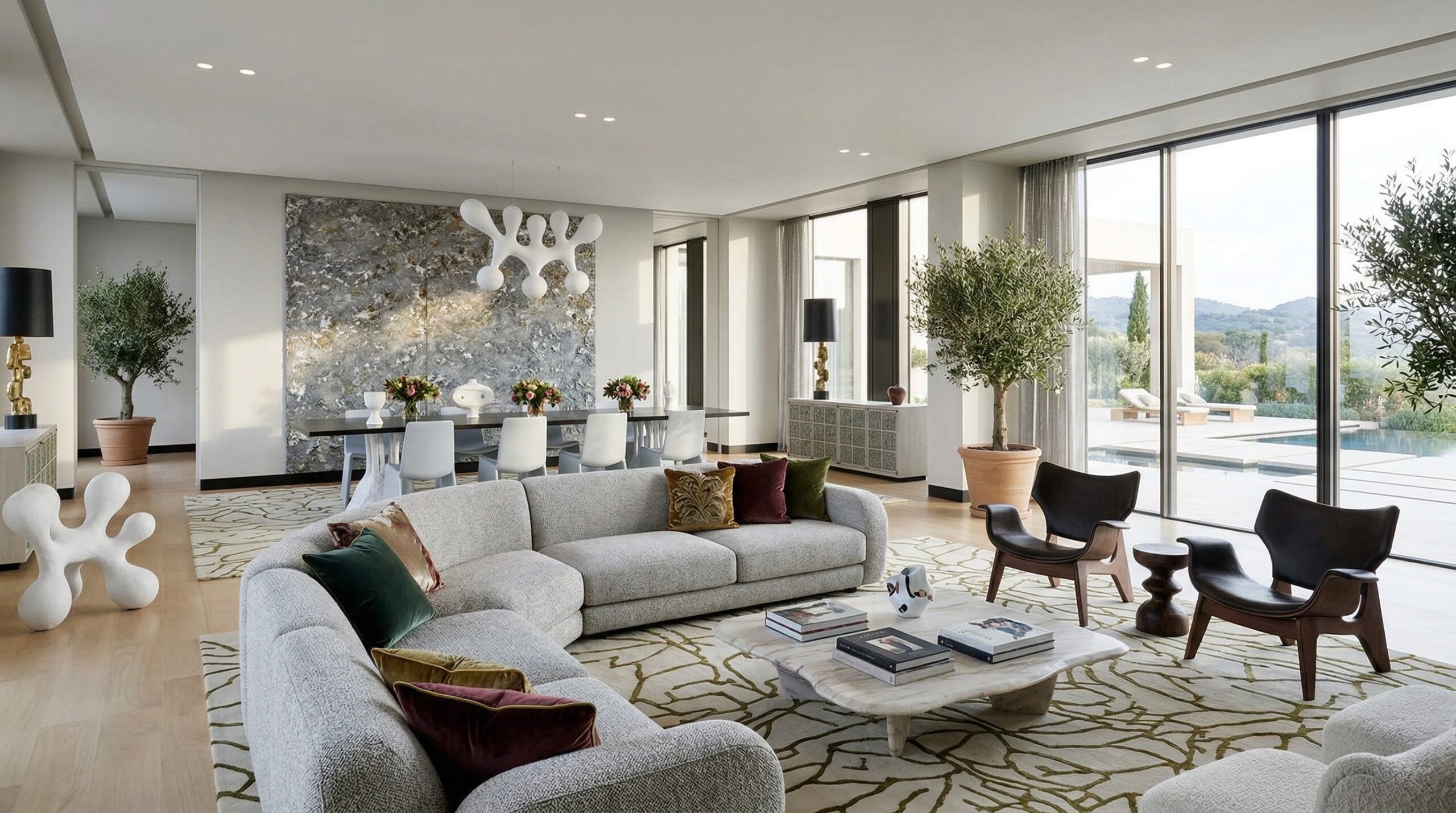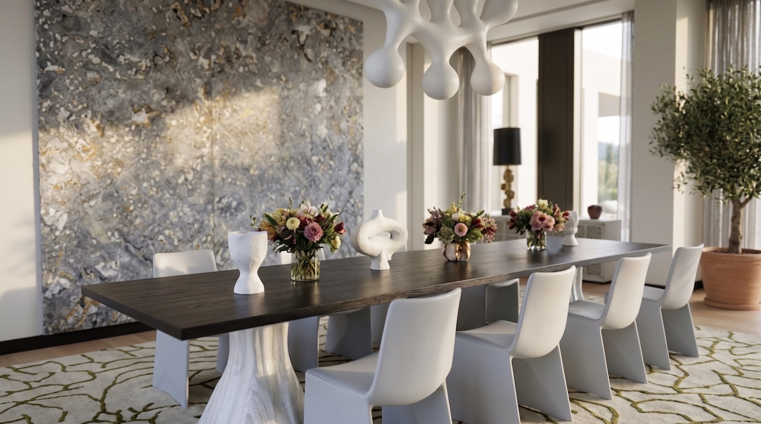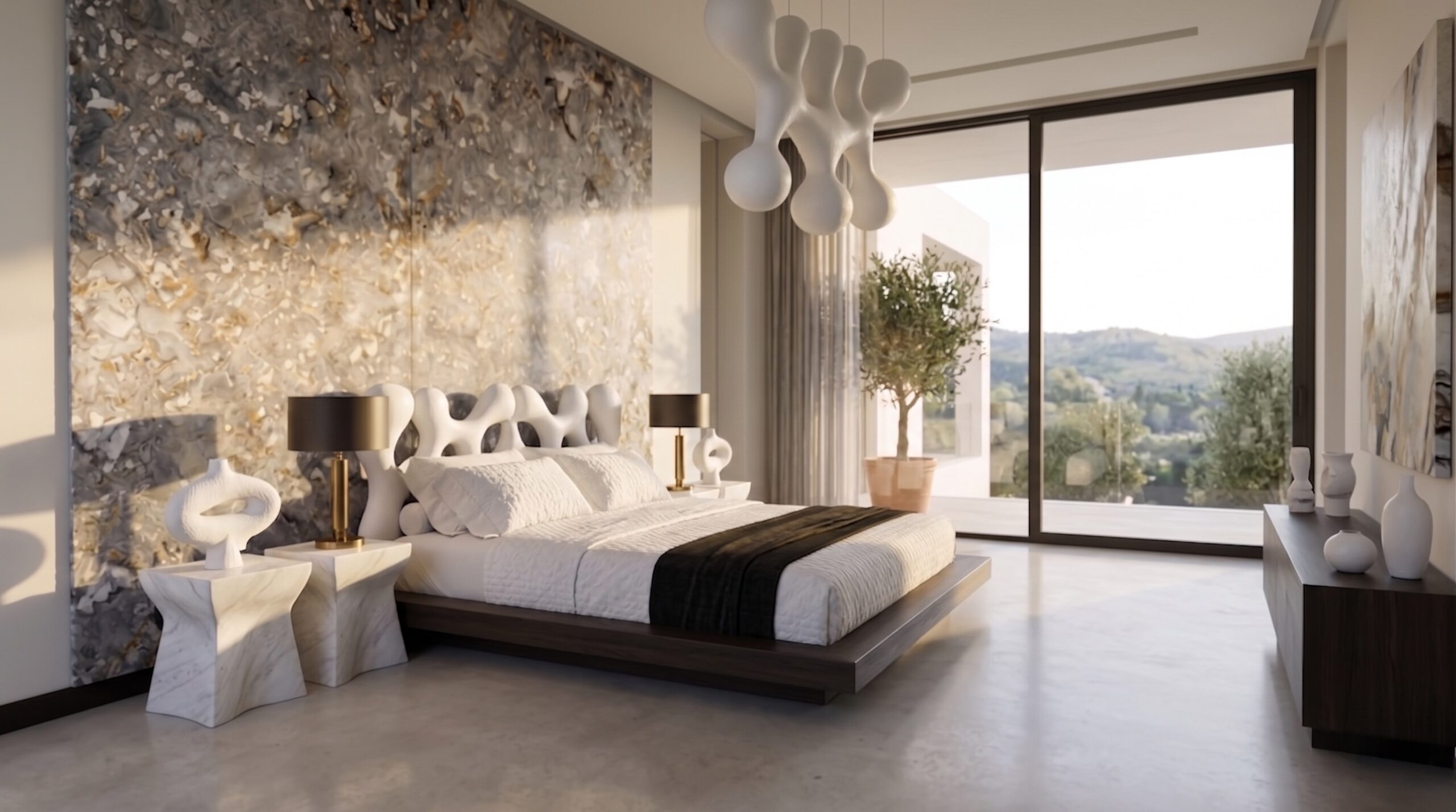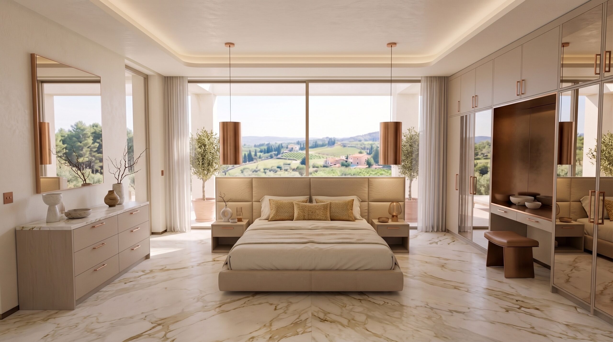 Mermer yüzeyler, açık renk tekstiller ve doğal ahşap dokular birbiriyle uyumlu bir bütünlük kurarken; kavisli oturma grupları, uzun yemek masası ve sade yatak tasarımı mekânın karakterini belirler. Materyaller arasındaki geçişler yumuşak ve dengeli tutulmuş, parlak ve mat yüzeylerin birlikteliği mekâna derinlik kazandırmıştır.