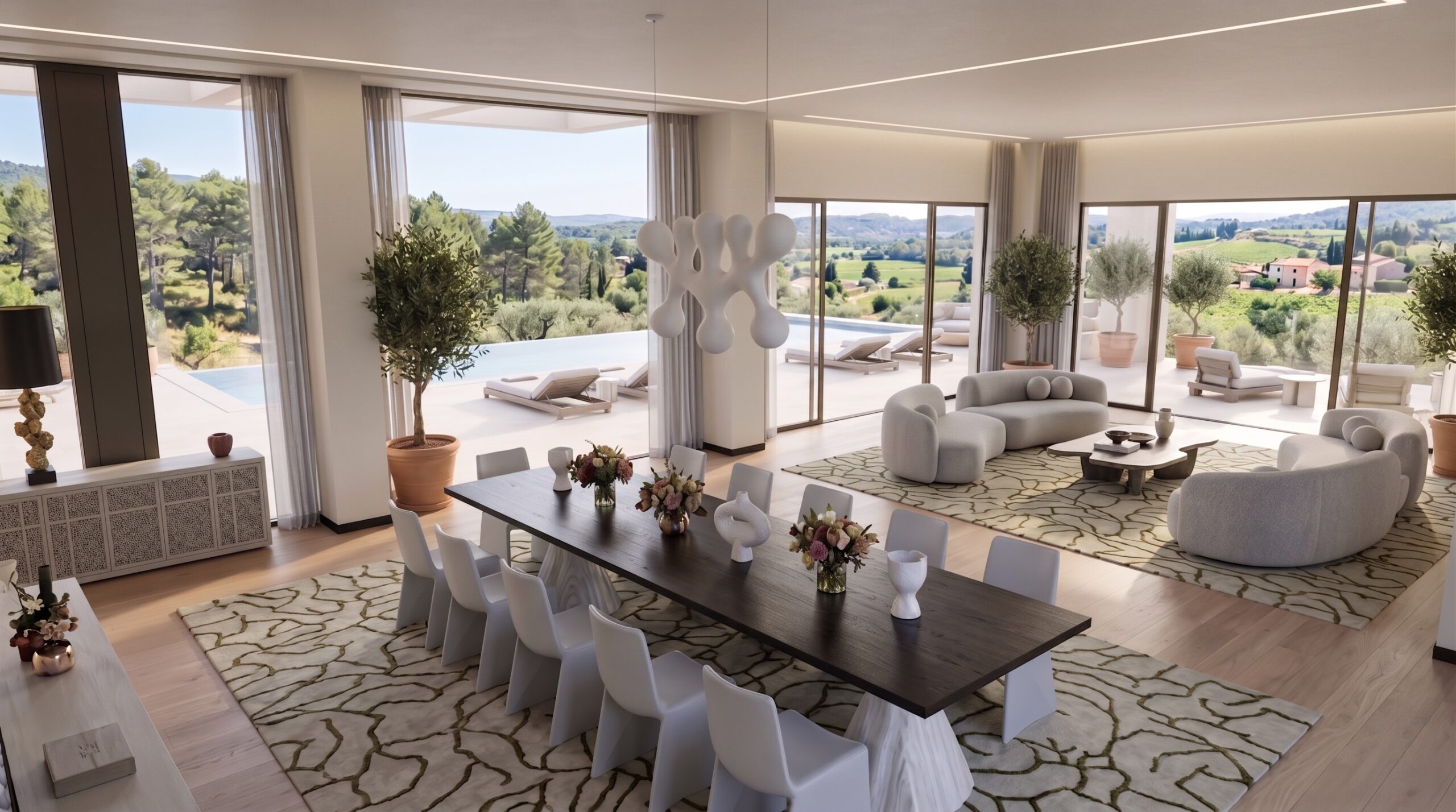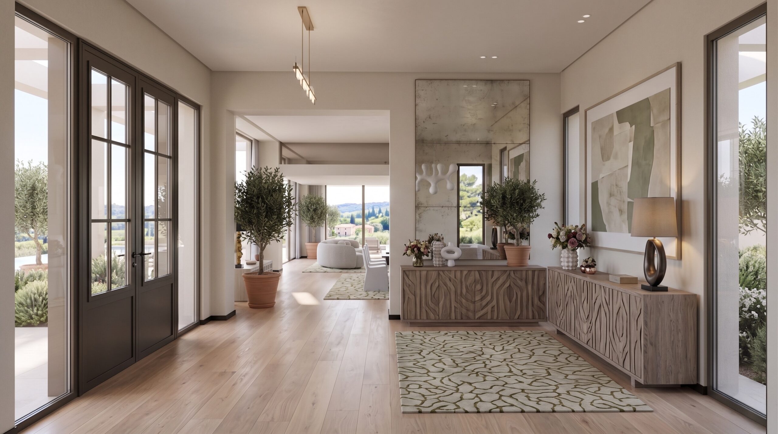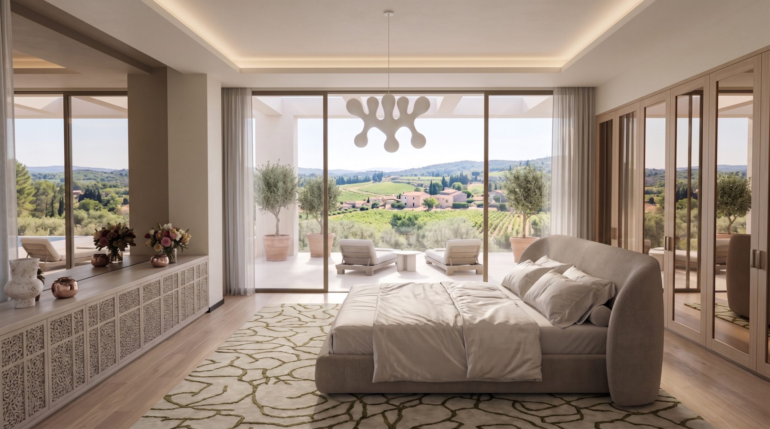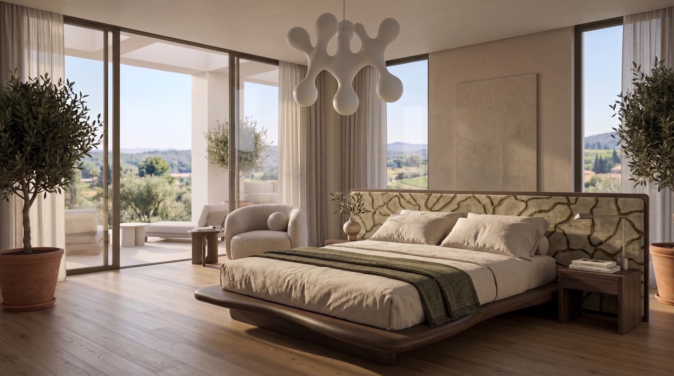 Geniş panoramik açıklıklar, Akdeniz peyzajını iç mekâna taşıyarak gün ışığını mekânın ana bileşeni haline getirir. Açık tonlu yüzeyler ve doğal ışık, ferah ve dengeli bir atmosfer oluşturur.