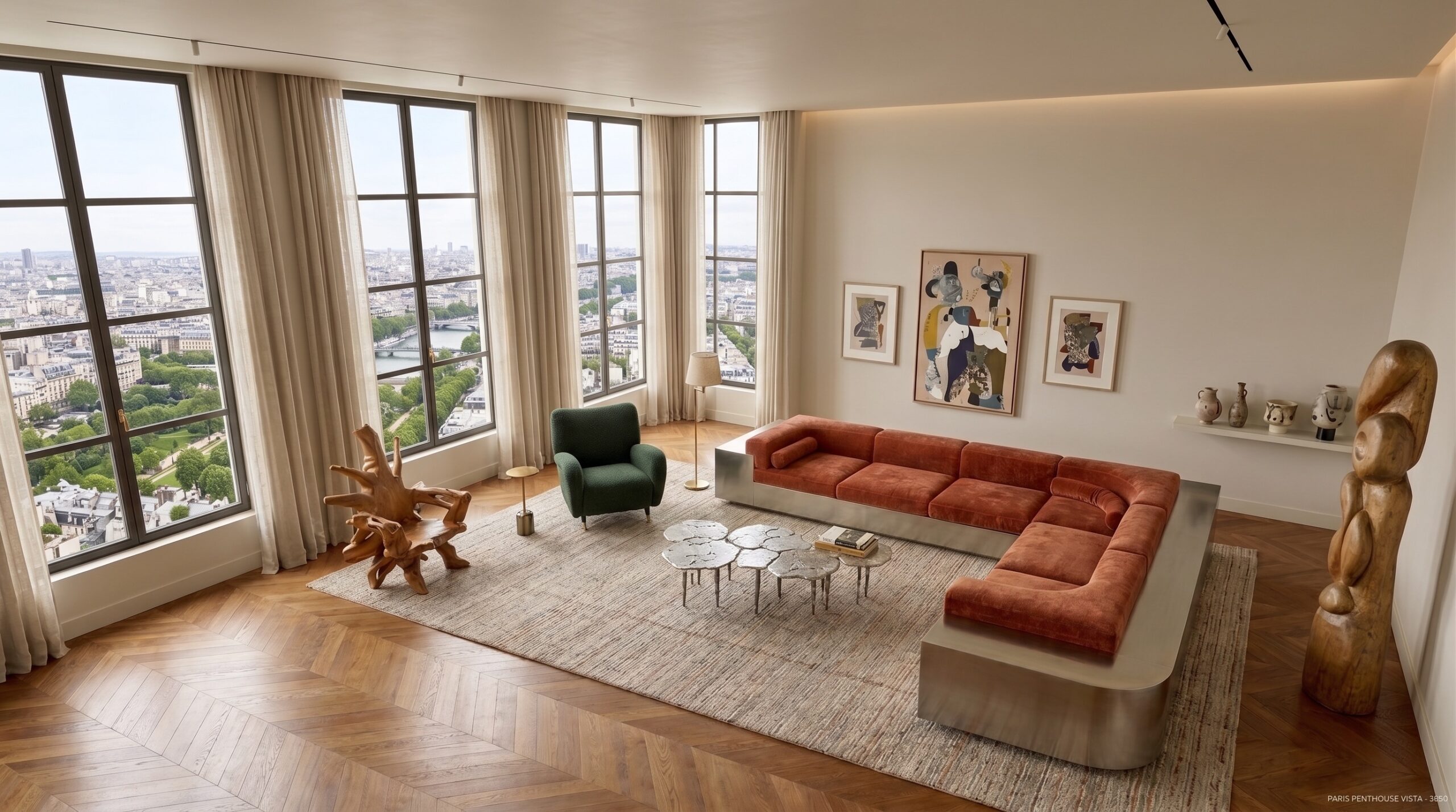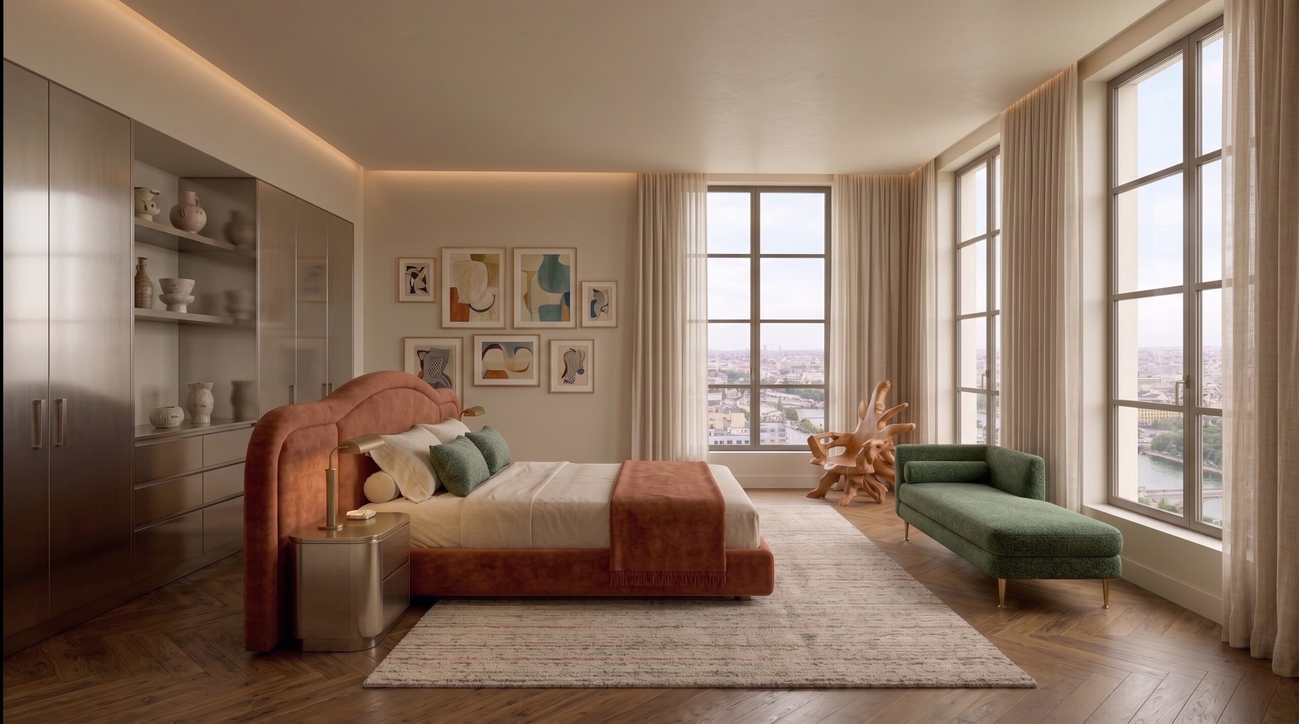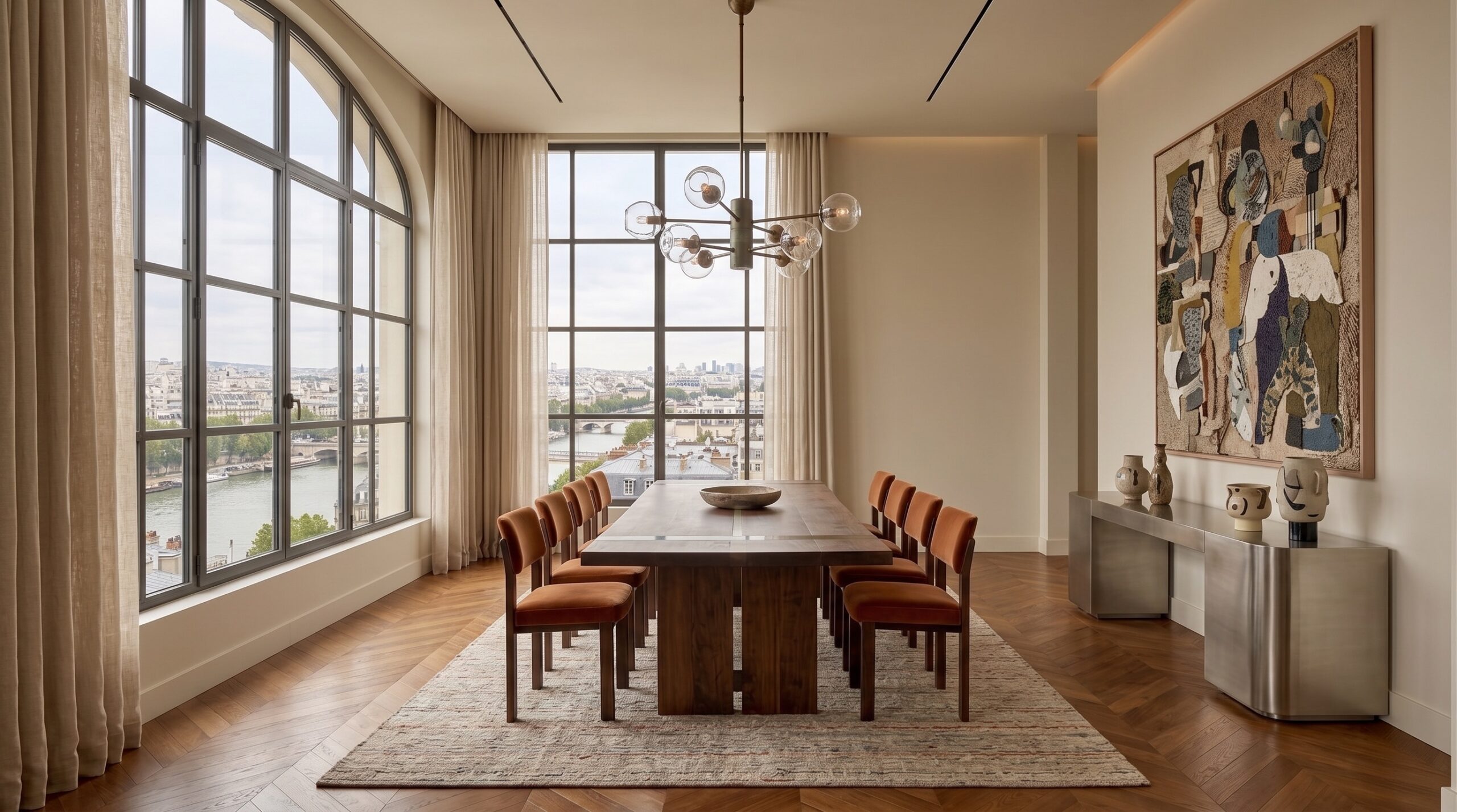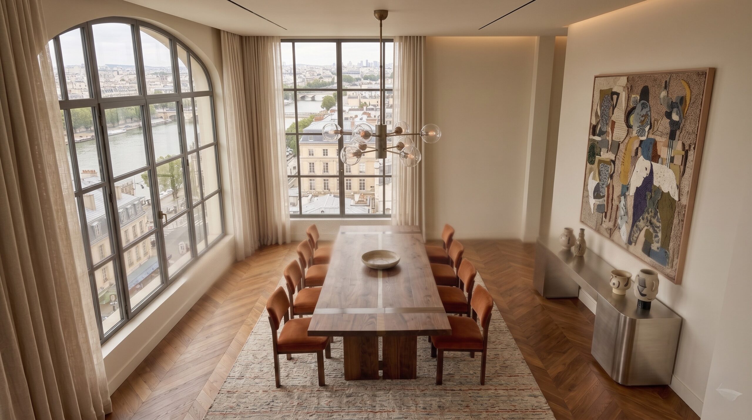 Geniş kemerli pencere açıklıkları, Paris şehir dokusunu iç mekâna taşıyarak gün ışığını mekânın ana unsuru haline getirir. Sıcak terracotta tonları ve açık renk duvar yüzeyleri, mekânda dengeli ve karakterli bir atmosfer oluşturur.