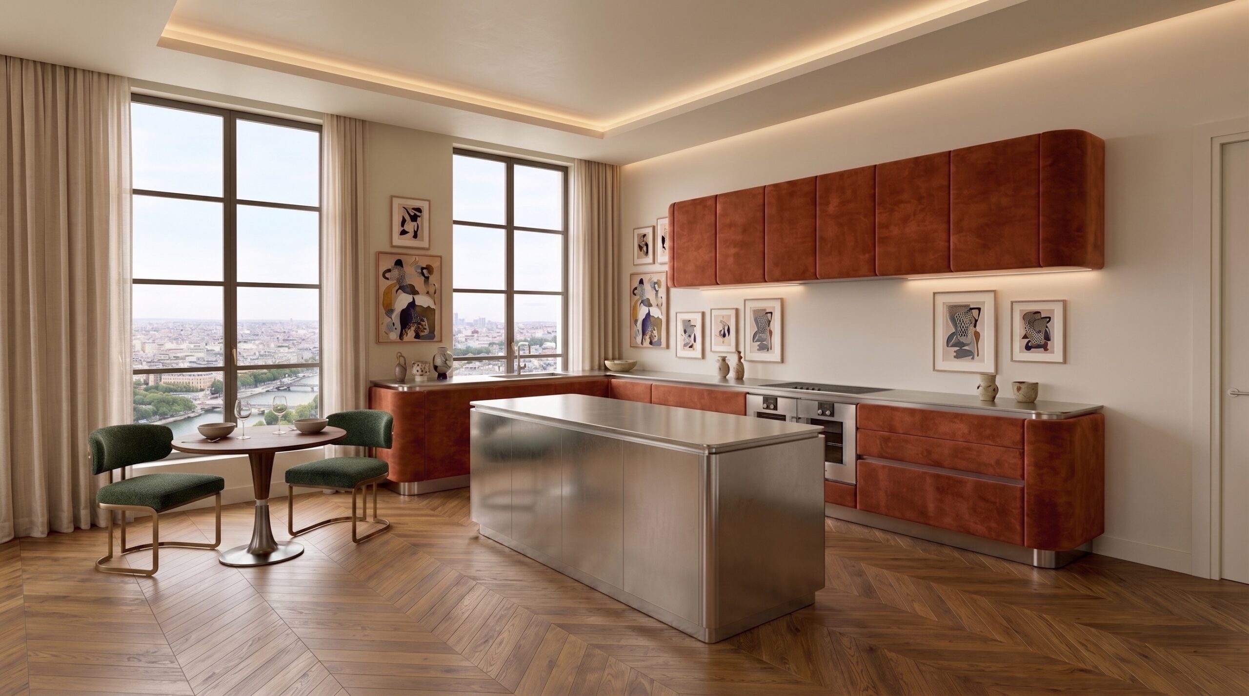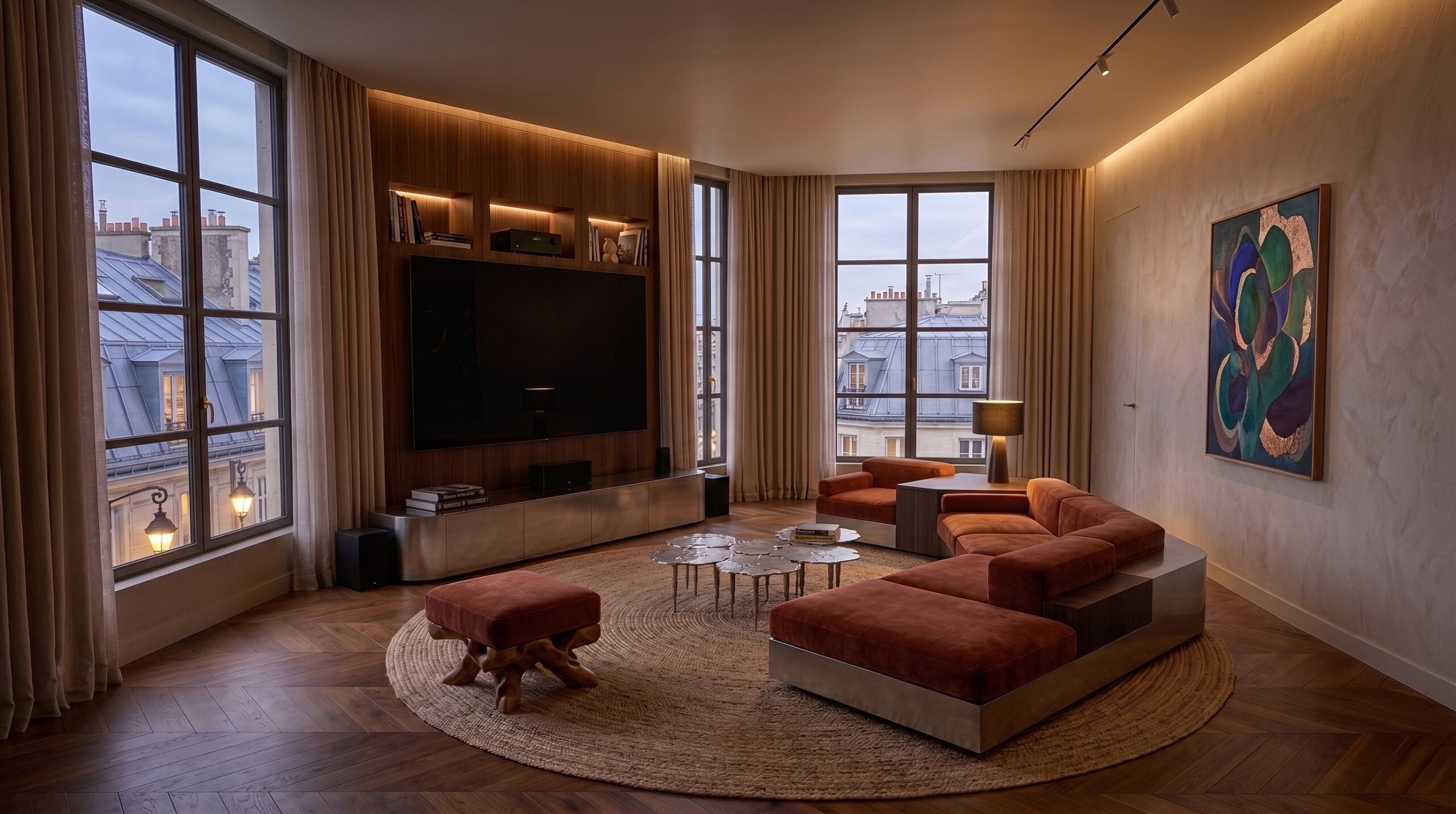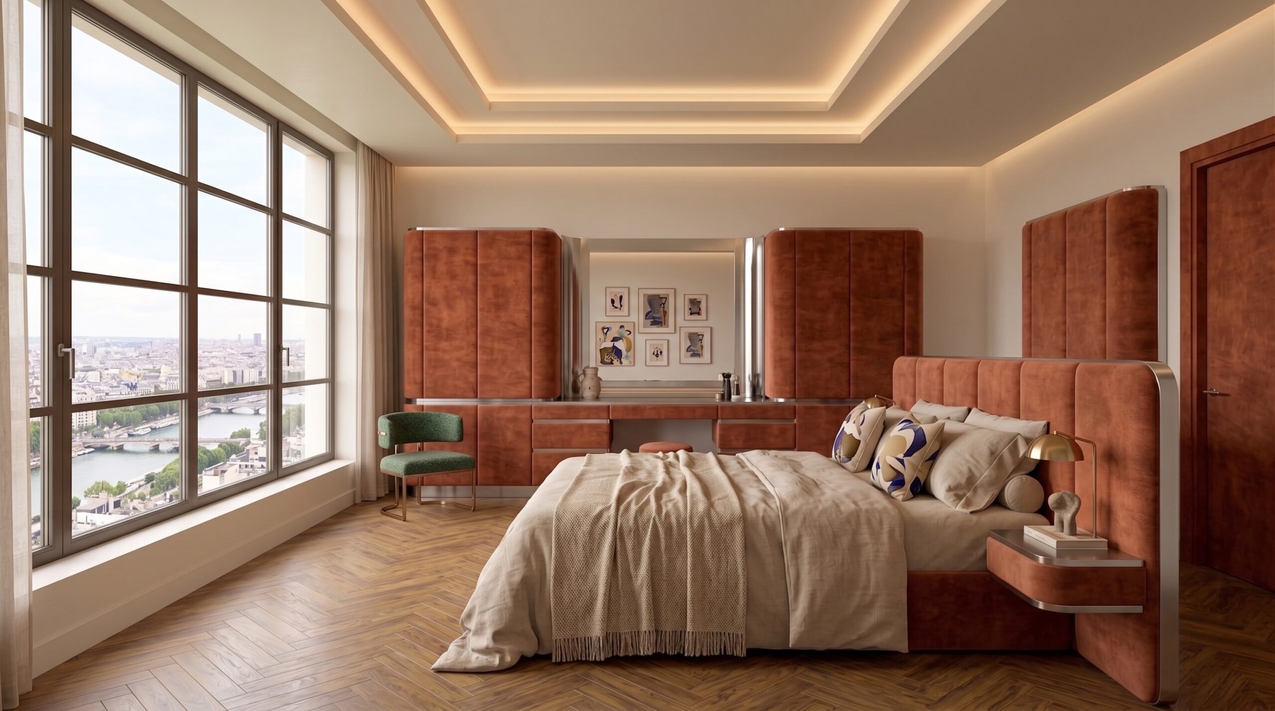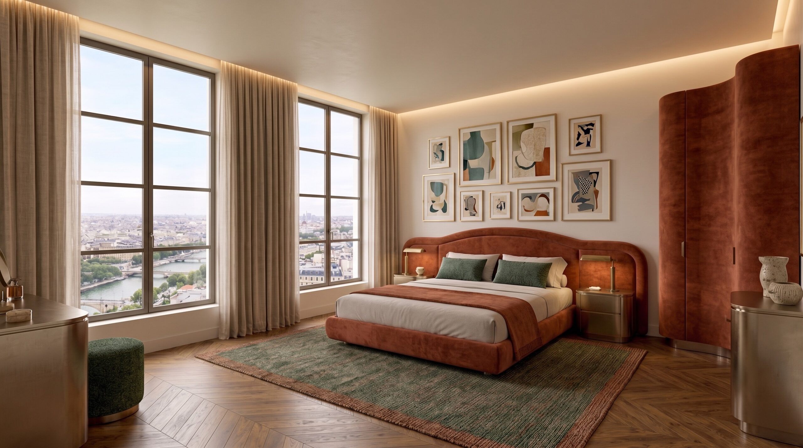 Geniş kemerli pencere açıklıkları, Paris şehir dokusunu iç mekâna taşıyarak gün ışığını mekânın ana unsuru haline getirir. Sıcak terracotta tonları ve açık renk duvar yüzeyleri, mekânda dengeli ve karakterli bir atmosfer oluşturur.