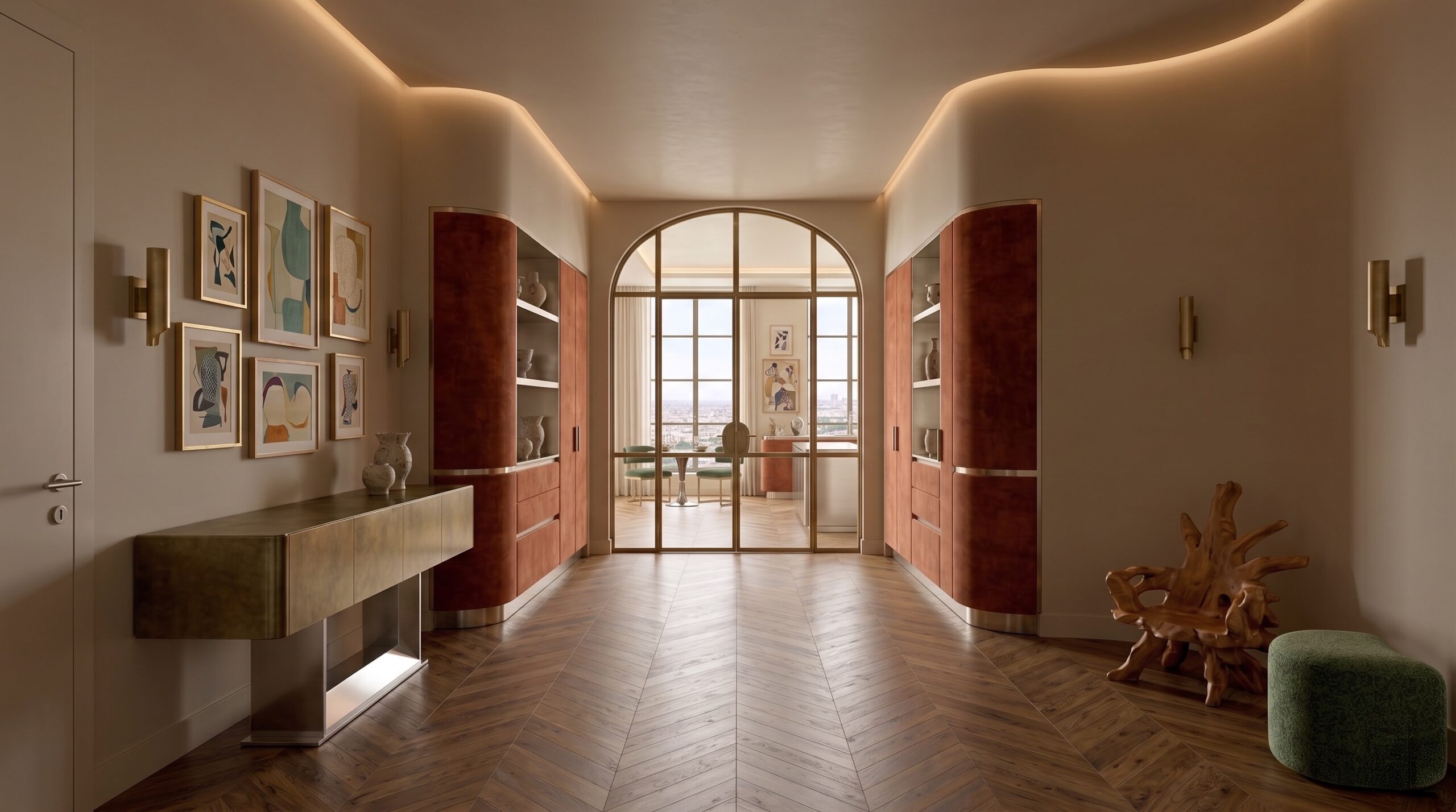 Sanat eserleri ve heykelsi aydınlatmalar ile desteklenen bu konut, klasik şehir mimarisini çağdaş bir yorumla yeniden ele alan rafine bir yaşam deneyimi sunar.