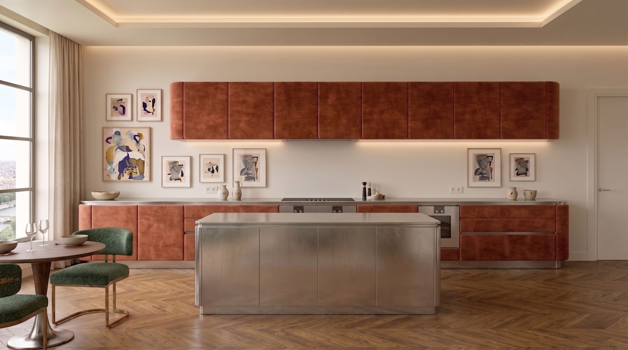 Kavisli başlıklı yatak, lineer mutfak adası, uzun yemek masası ve modüler oturma grupları mekânın ana karakterini belirler. Ahşap yüzeyler, lake detaylar ve tekstil dokular arasındaki uyum, mekânda bütüncül bir malzeme dili oluşturur.