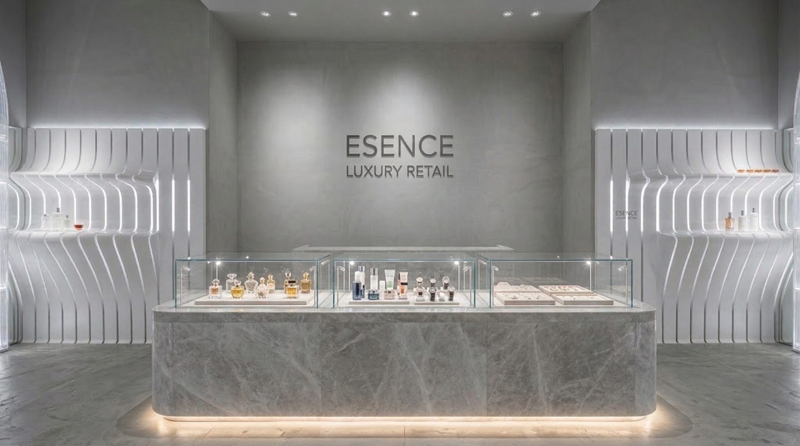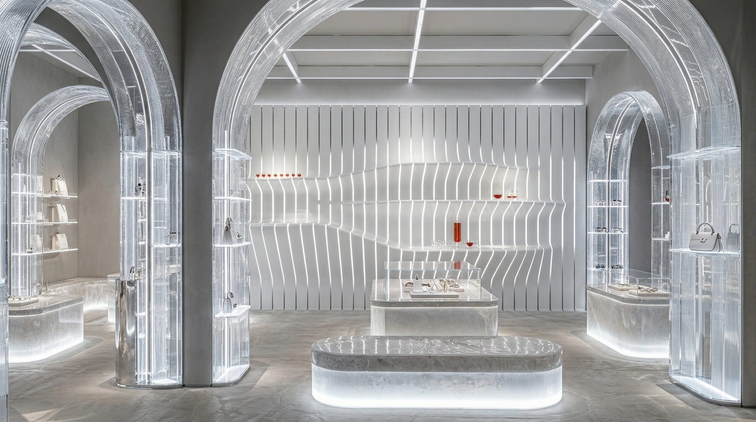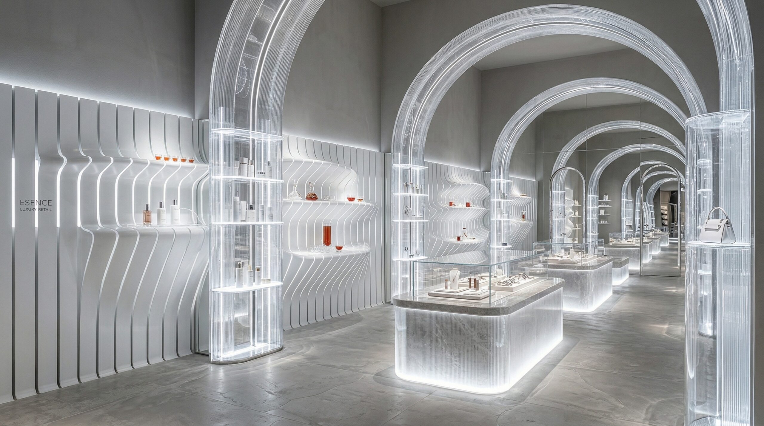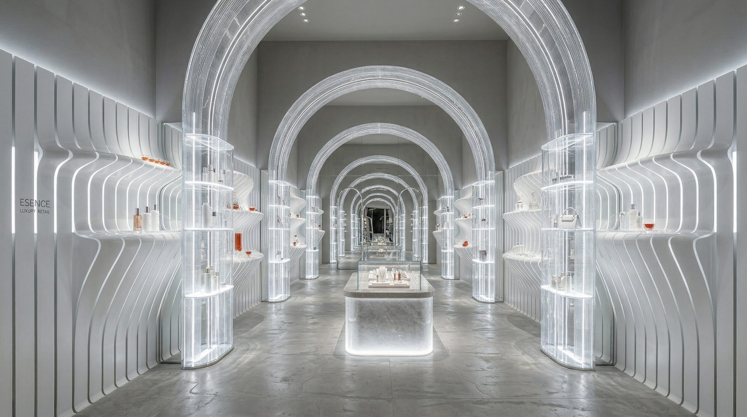 Monokrom beyaz yüzeyler ve ışıkla tanımlanan mimari elemanlar üzerinden kurgulanan bu mağaza tasarımı, mekânı neredeyse soyut bir galeri deneyimine dönüştürür. Parametrik yüzey dili ile şekillenen duvarlar, ritmik tekrarlar oluşturarak mekâna derinlik ve akış kazandırır.