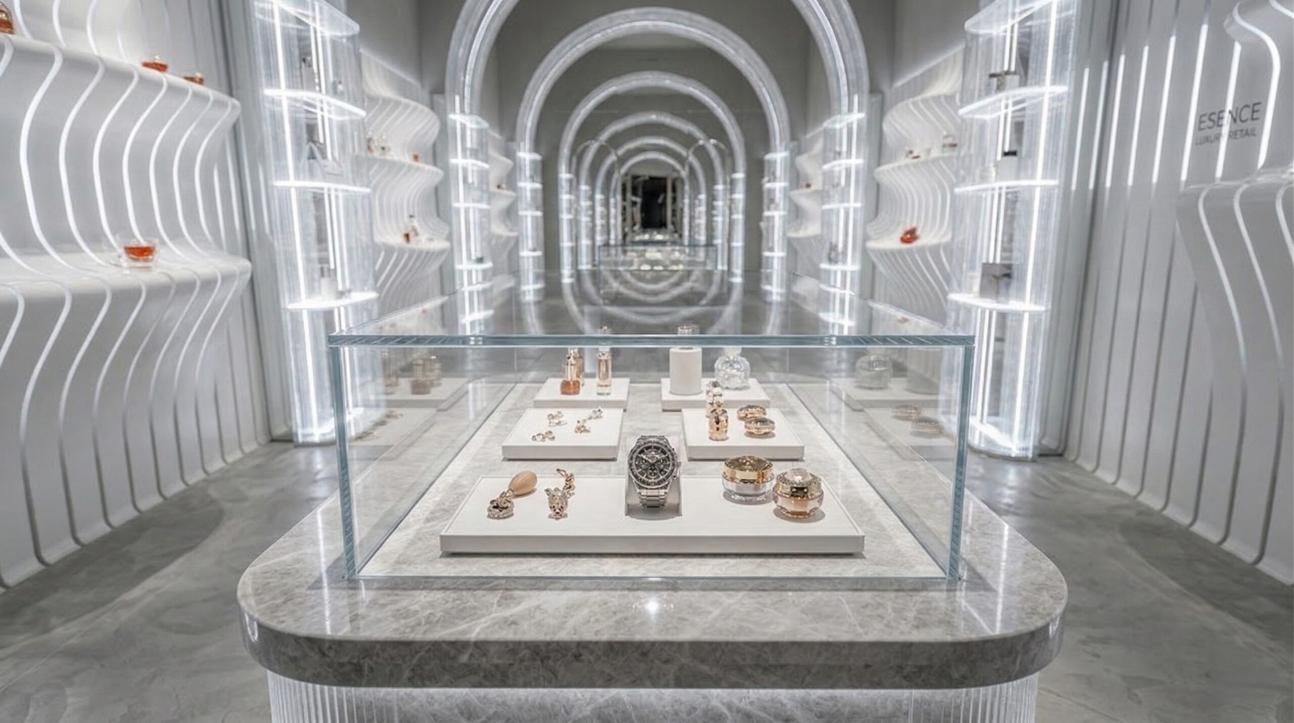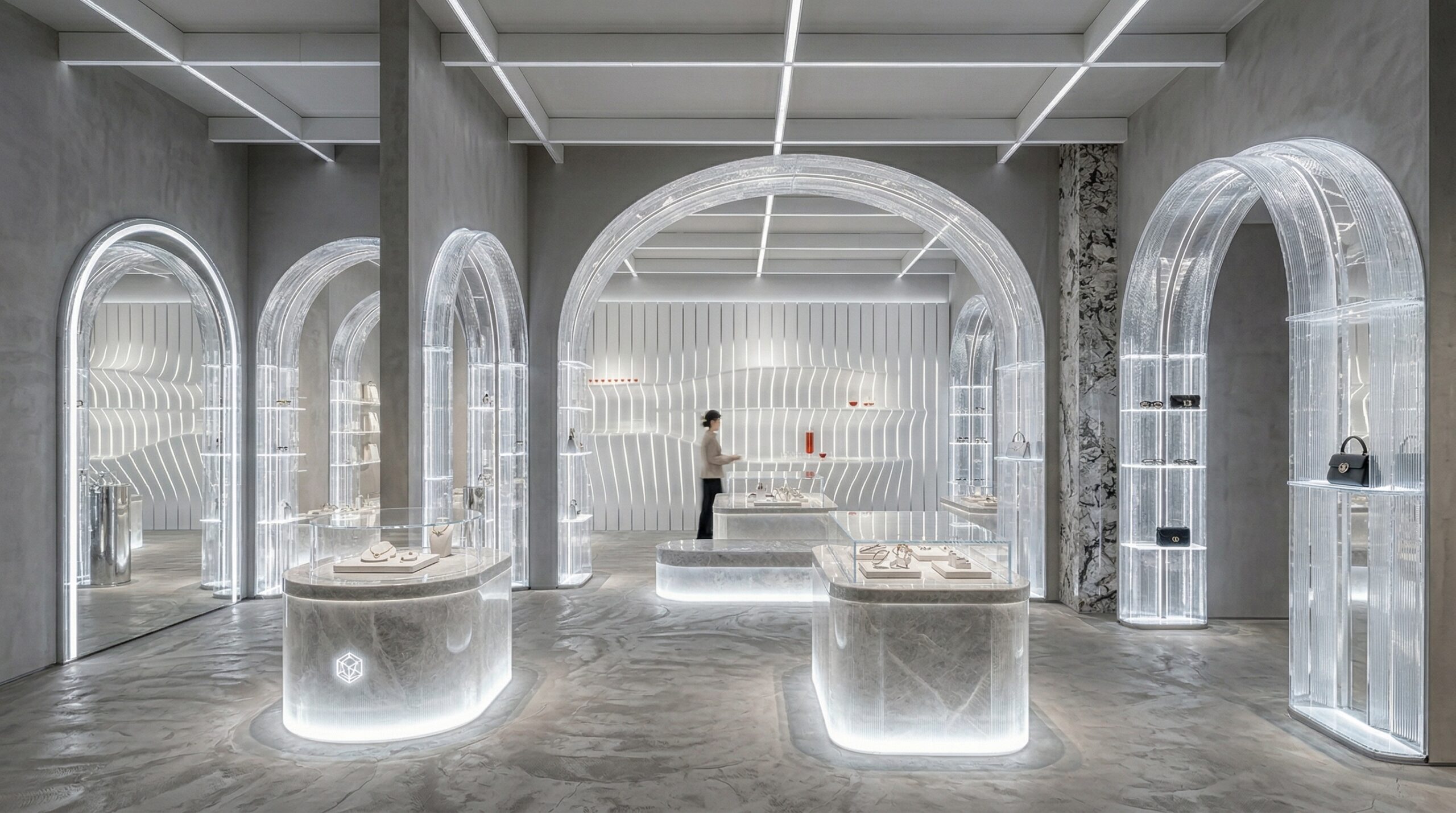 Kemerli geçişler ve ardışık perspektifler, kullanıcıyı iç mekânda yönlendiren güçlü bir aks yaratırken; şeffaf ve aydınlatmalı sergileme üniteleri ürünleri adeta “havada asılı” bir etkiyle sunar.