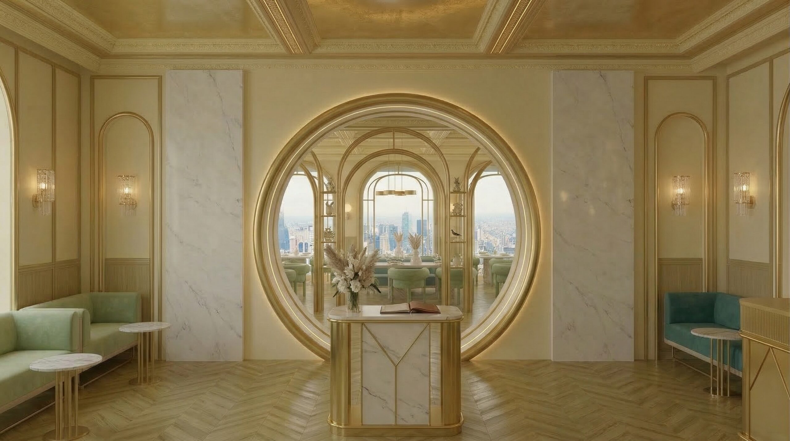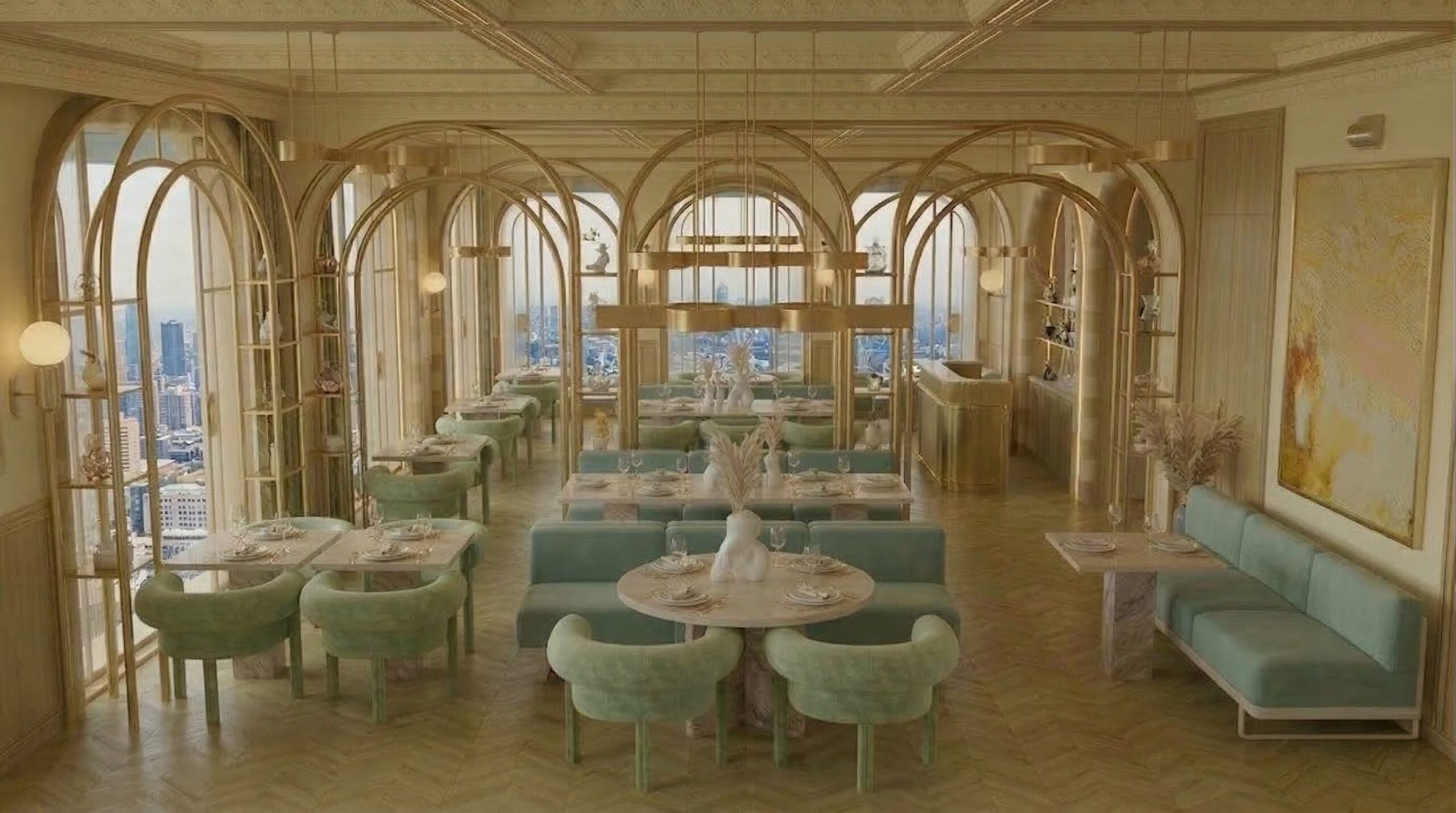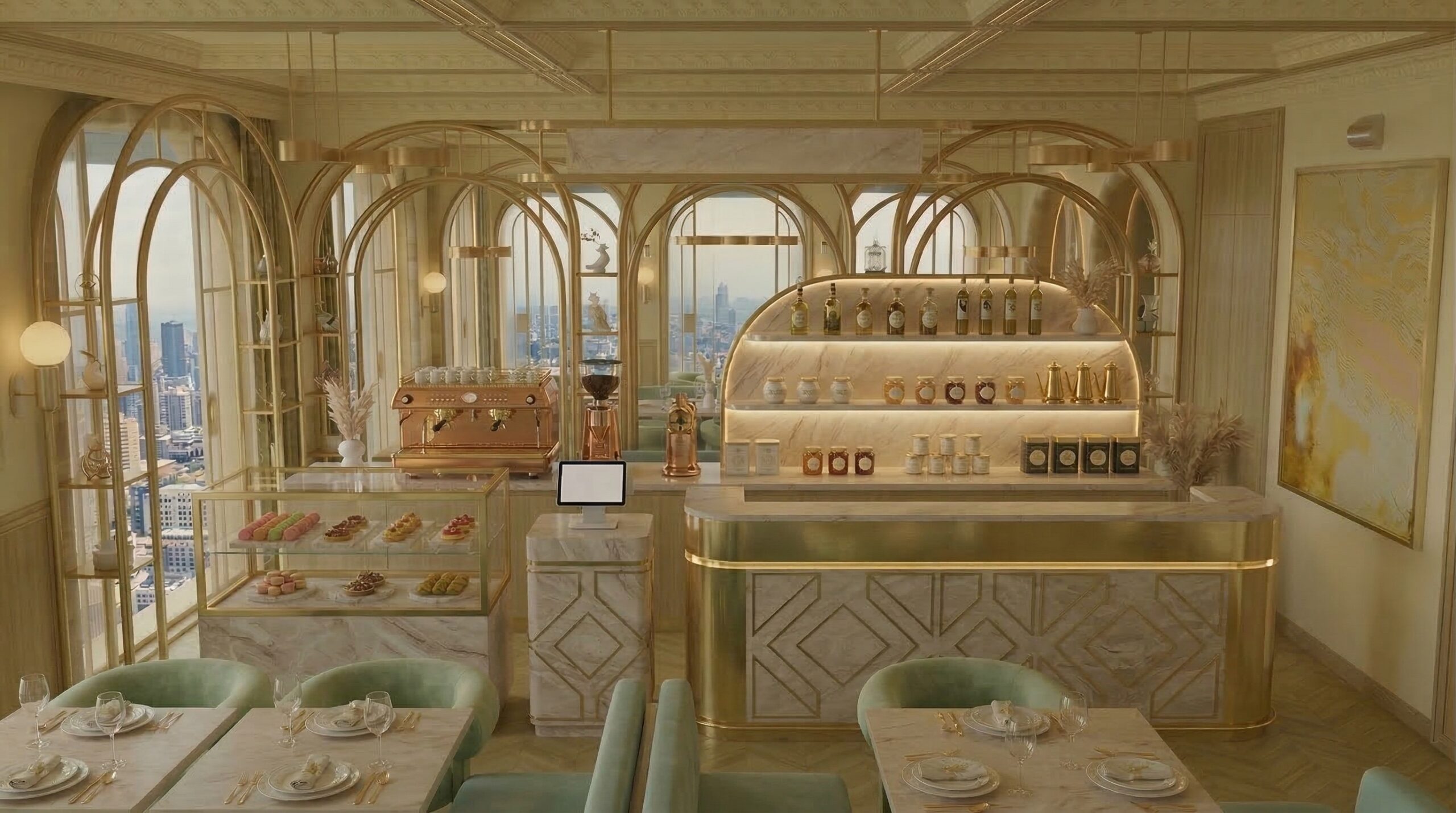 Yeşil tonlu kadife oturma elemanları ve mermer yüzeyler, altın detaylarla kontrast oluşturarak güçlü bir görsel denge yaratır. Merkezi servis ve teşhir alanı, mekânın odak noktası olurken; geniş açıklıklar ve şehir manzarasına açılan pencereler iç mekân ile dış çevre arasında akışkan bir ilişki kurar. Genel tasarım dili, klasik lüks anlayışını modern bir sadelik ve ritim ile harmanlayarak zamansız bir atmosfer sunar.
