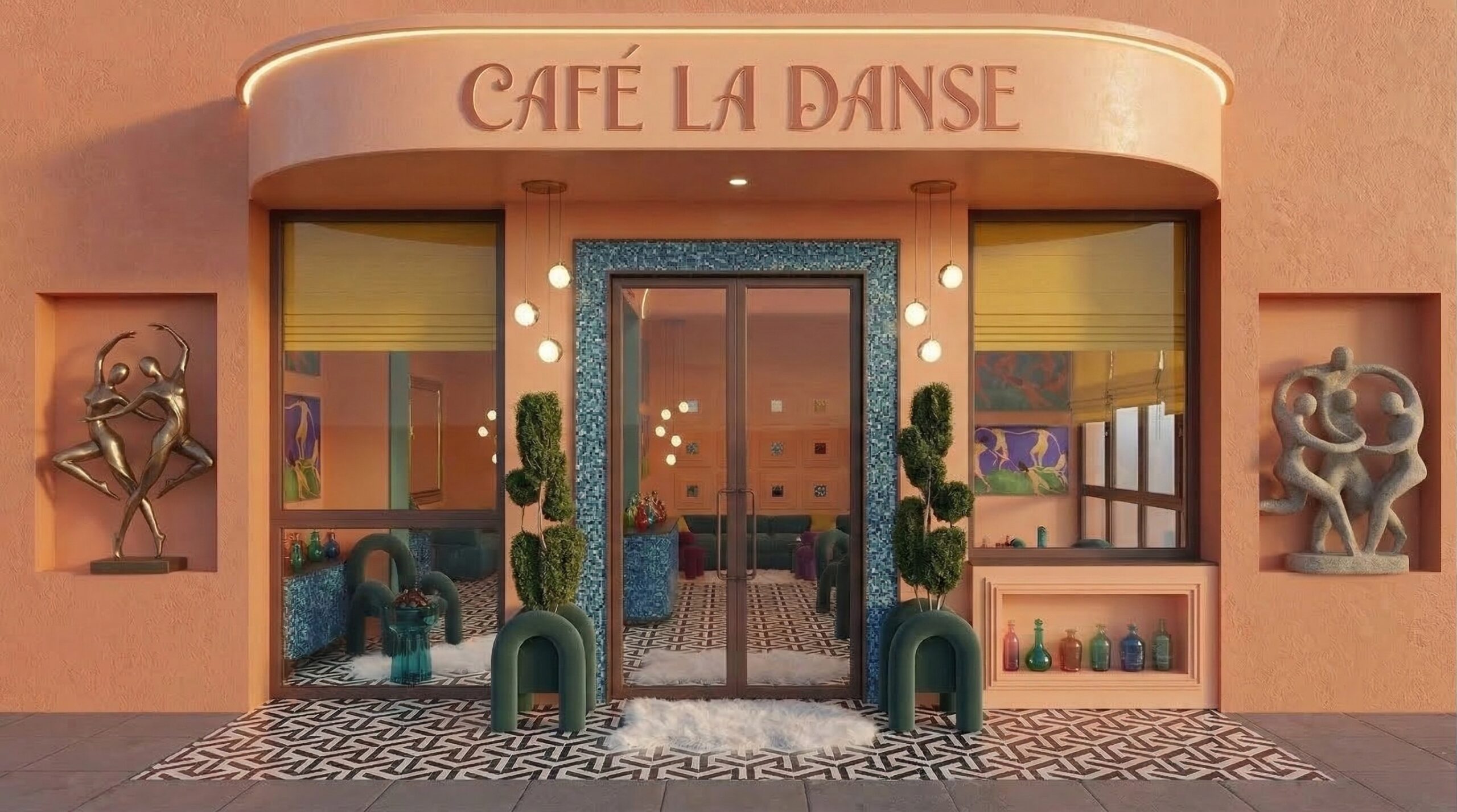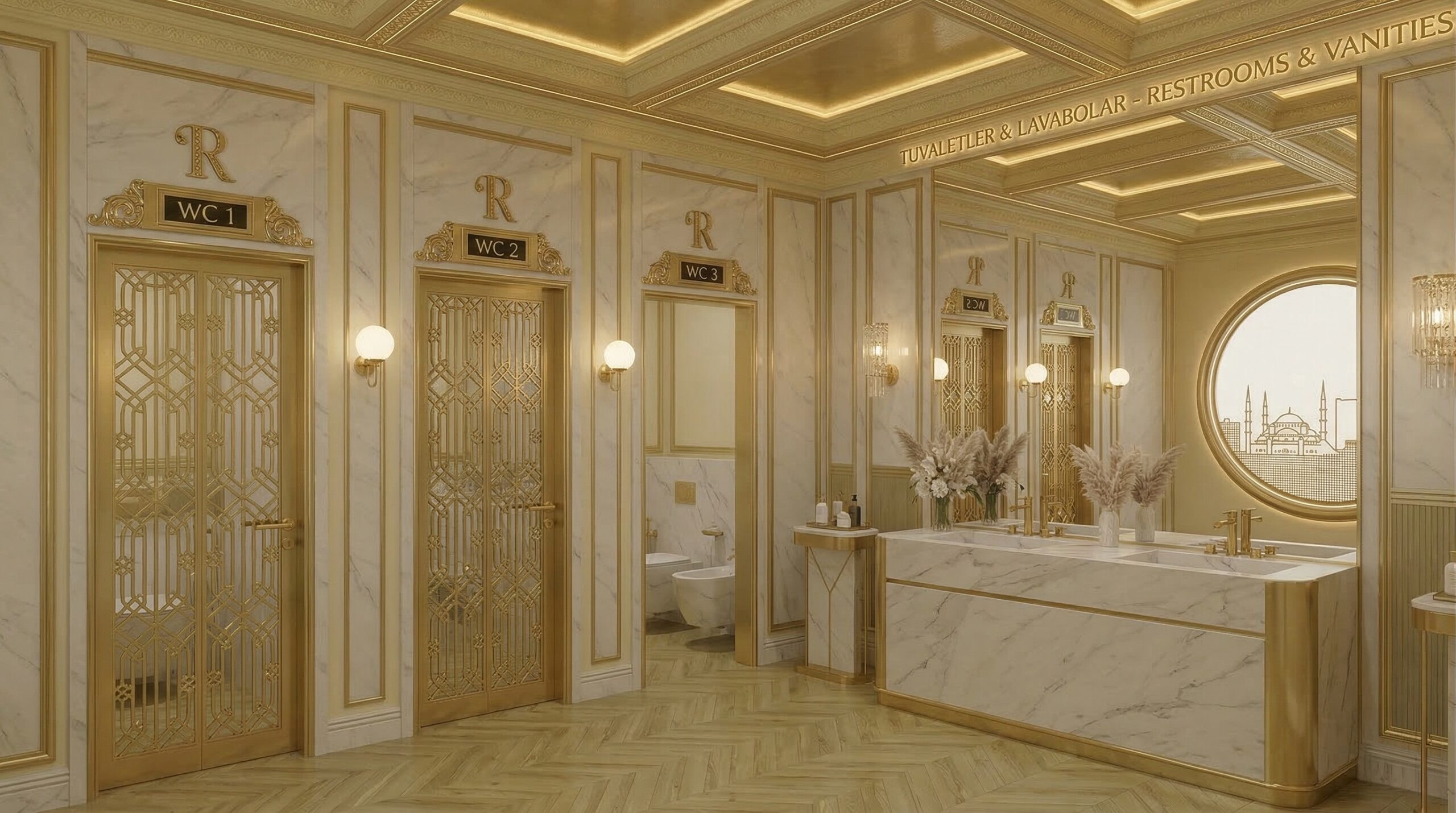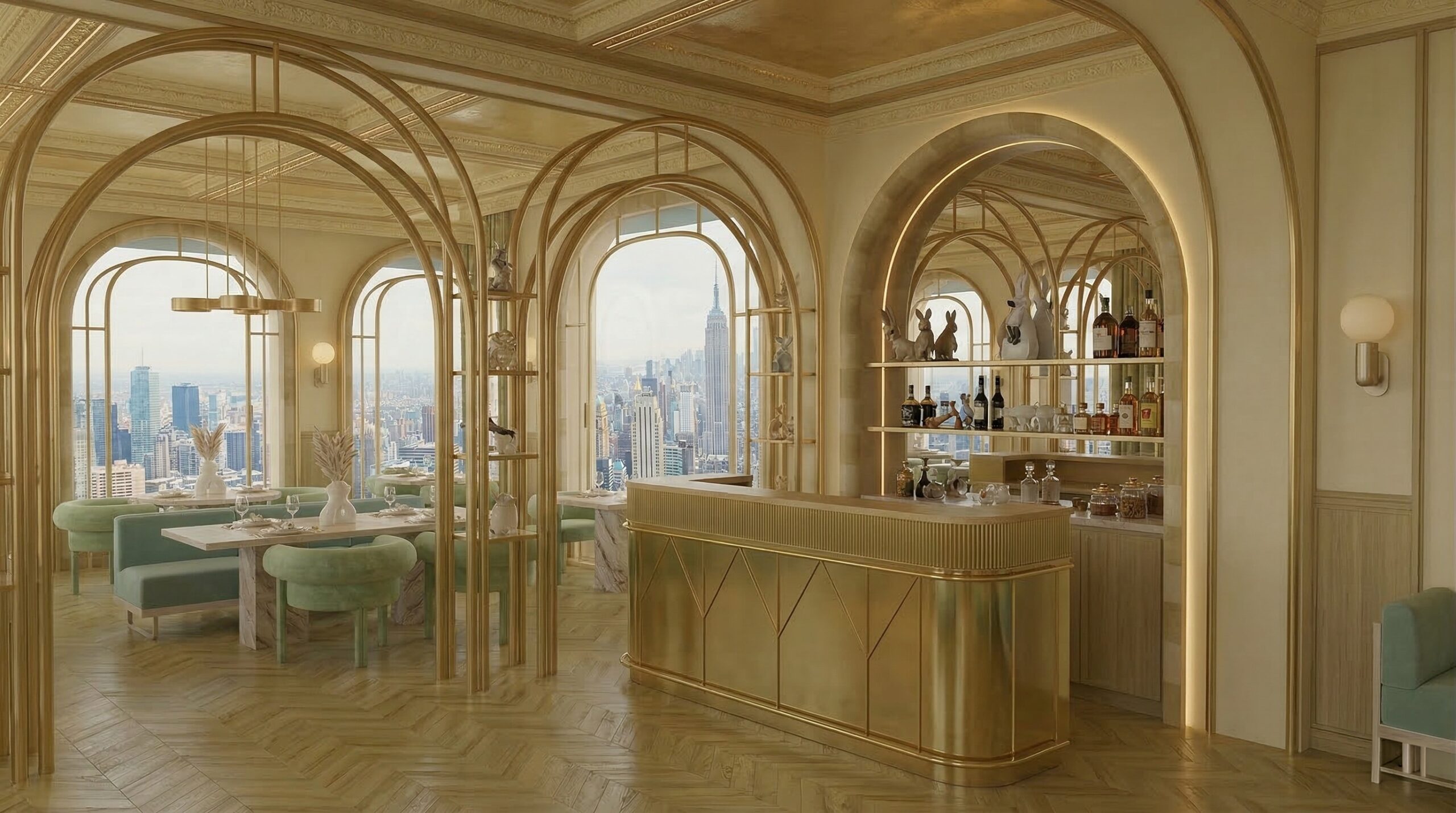 Altın tonlarının baskın olduğu, kemerli strüktürler ve simetrik mekân kurgusu ile şekillenen bu proje, Art Deco etkilerini çağdaş bir yorumla yeniden ele alır. Mekân boyunca devam eden metal çerçeveli kemerler, hem mekânsal süreklilik sağlar hem de farklı kullanım alanlarını zarif bir şekilde ayrıştırır.