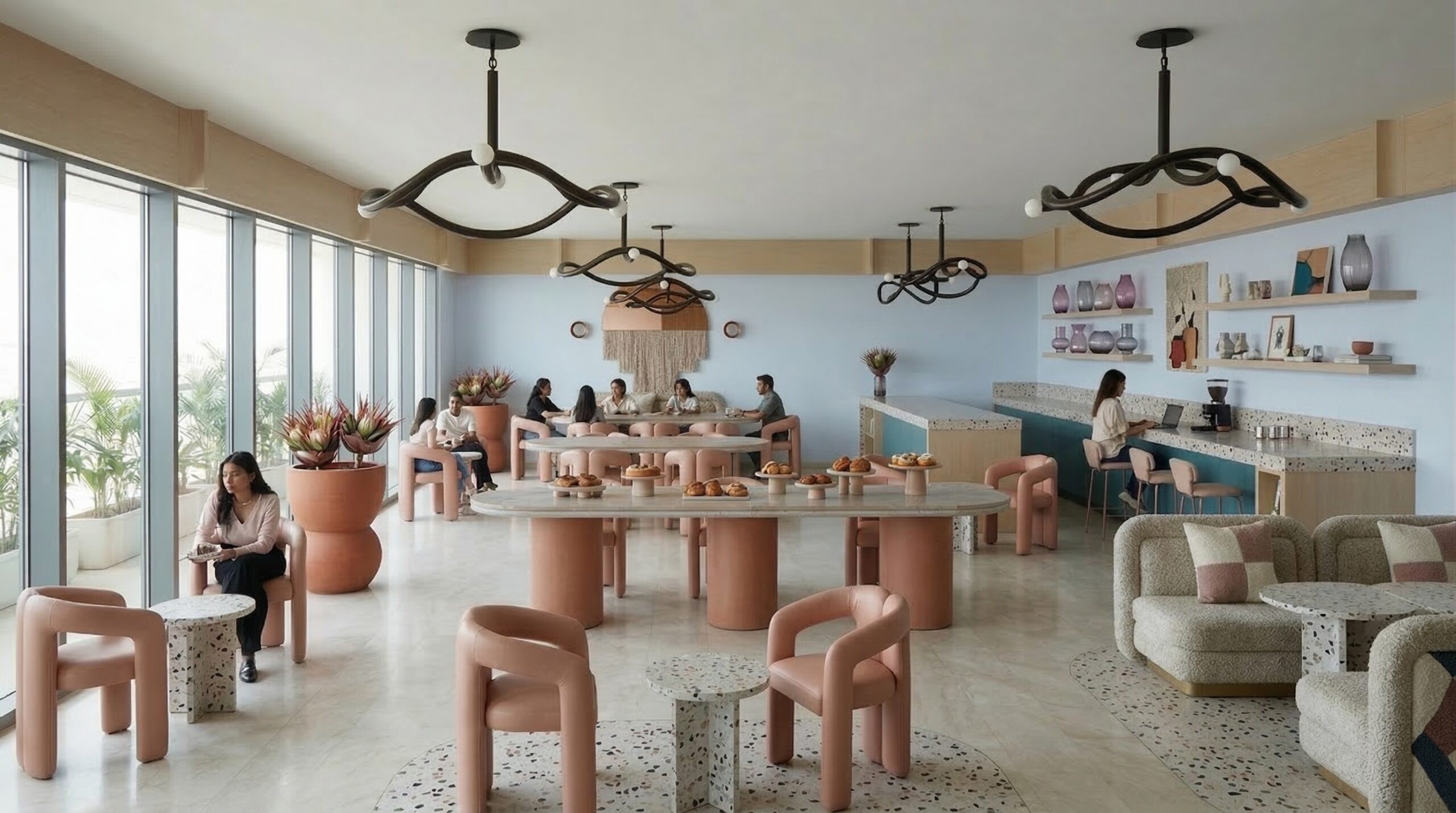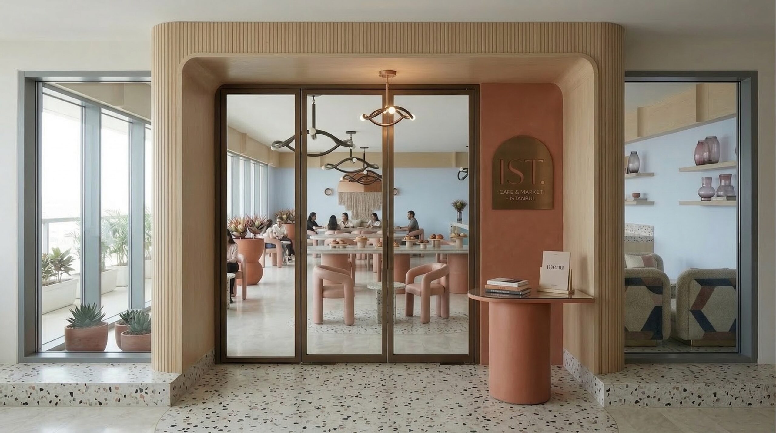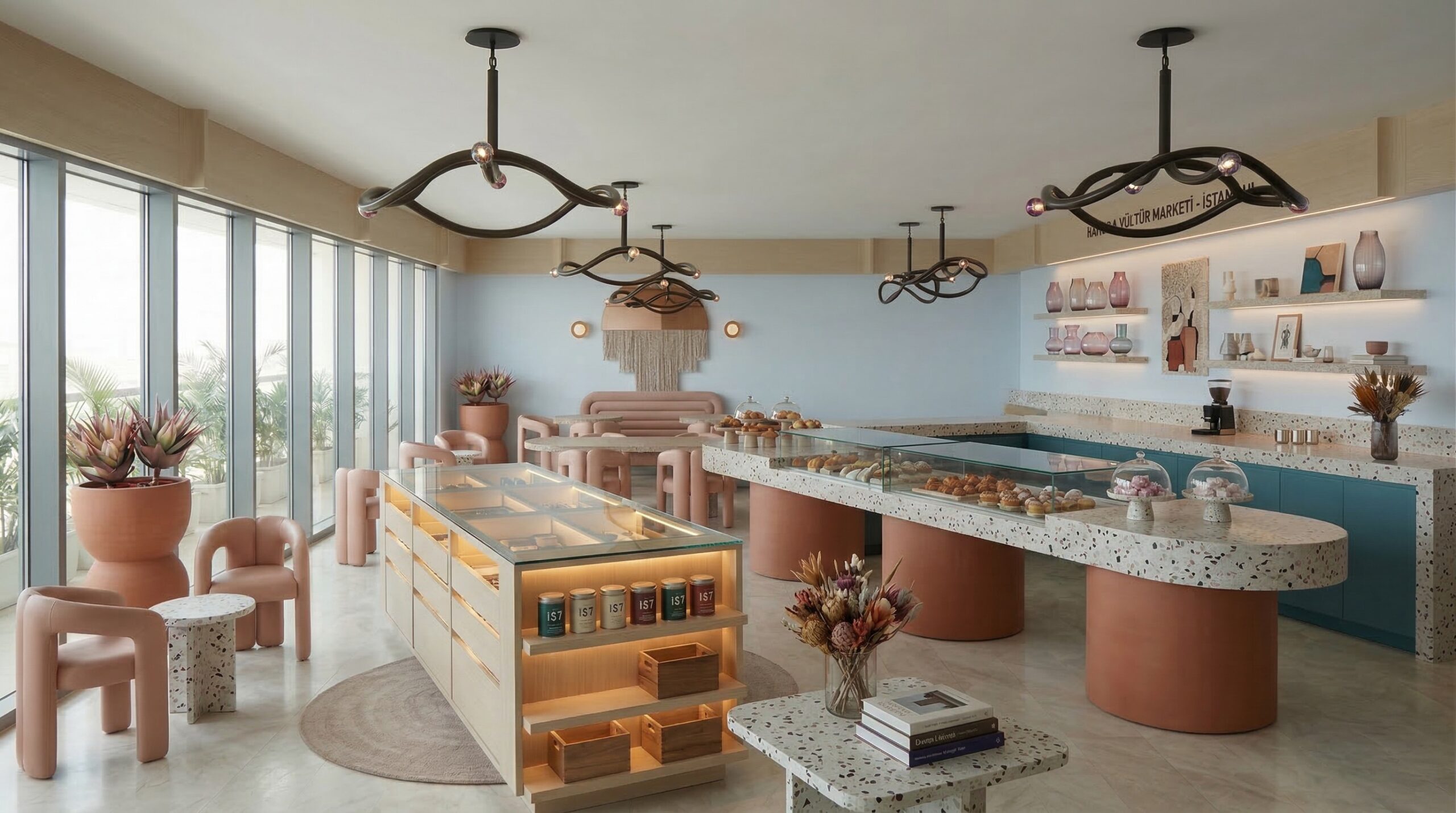 Kavisli oturma elemanları ve modüler düzenler, kullanıcıya esnek kullanım senaryoları sunarken; doğal ışık ile desteklenen açık renk paleti mekânın ferahlığını artırır. Terracotta tonlarındaki detaylar ve yumuşak dokulu yüzeyler, sade tasarım diline sıcaklık katmanları ekler. Genel tasarım, modern kafe anlayışını sade, akışkan ve kullanıcı odaklı bir mekânsal deneyime dönüştürür.