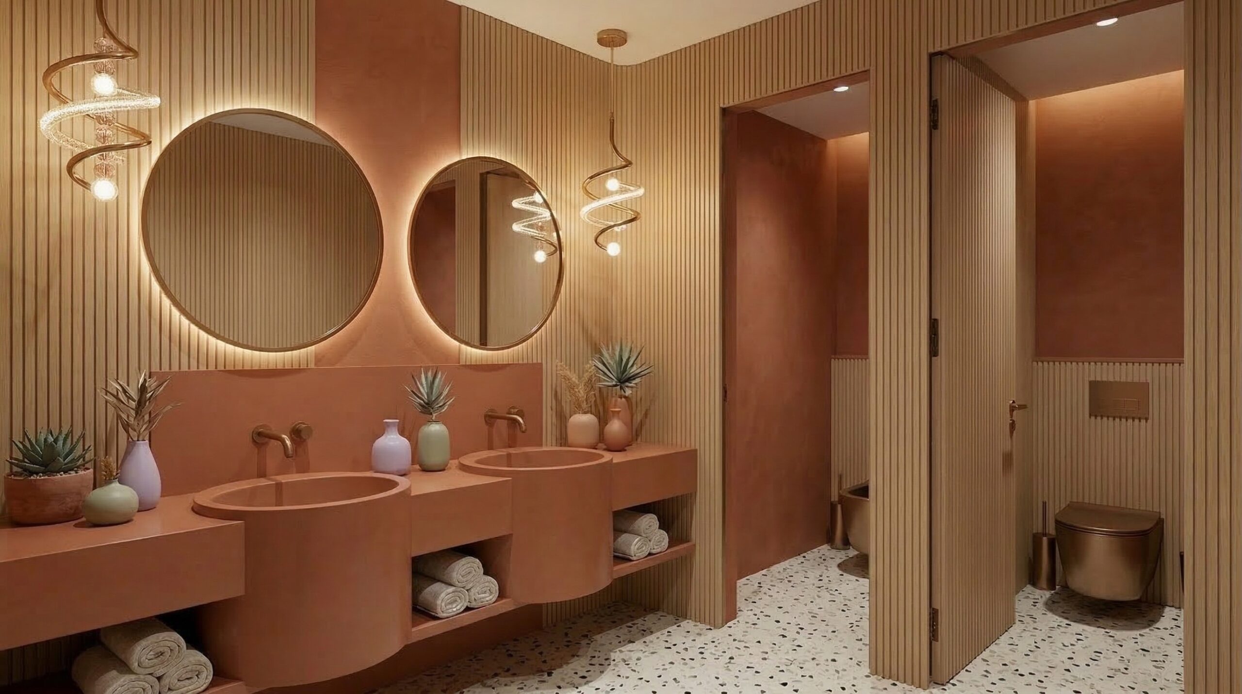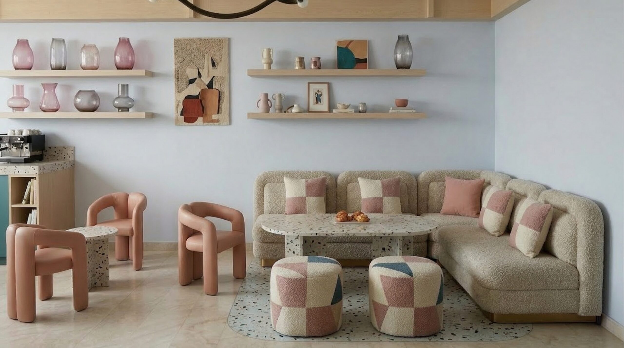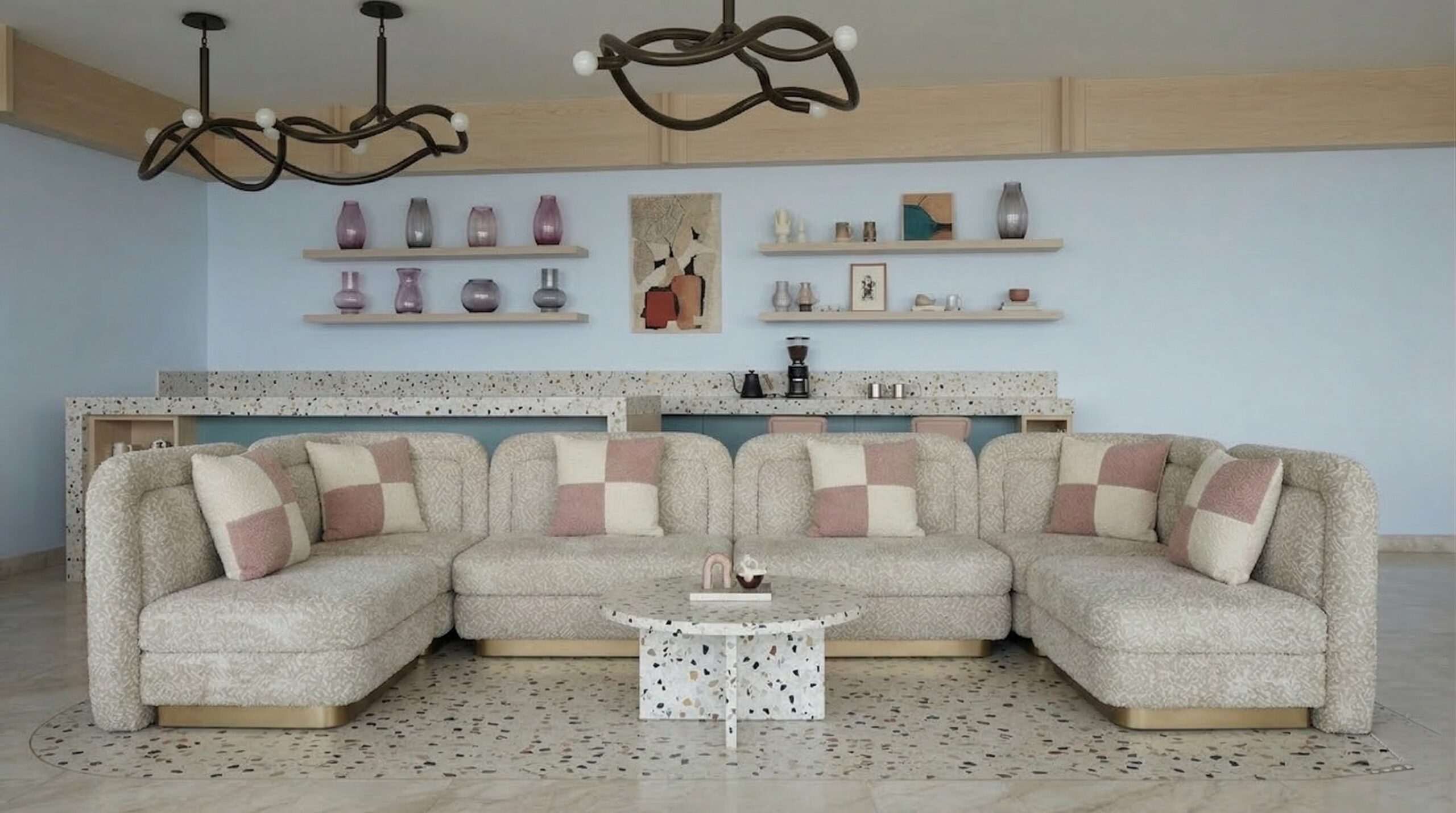 Kavisli oturma elemanları ve modüler düzenler, kullanıcıya esnek kullanım senaryoları sunarken; doğal ışık ile desteklenen açık renk paleti mekânın ferahlığını artırır. Terracotta tonlarındaki detaylar ve yumuşak dokulu yüzeyler, sade tasarım diline sıcaklık katmanları ekler. Genel tasarım, modern kafe anlayışını sade, akışkan ve kullanıcı odaklı bir mekânsal deneyime dönüştürür.