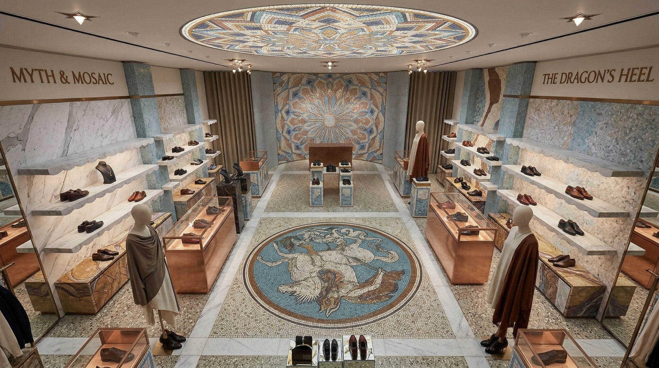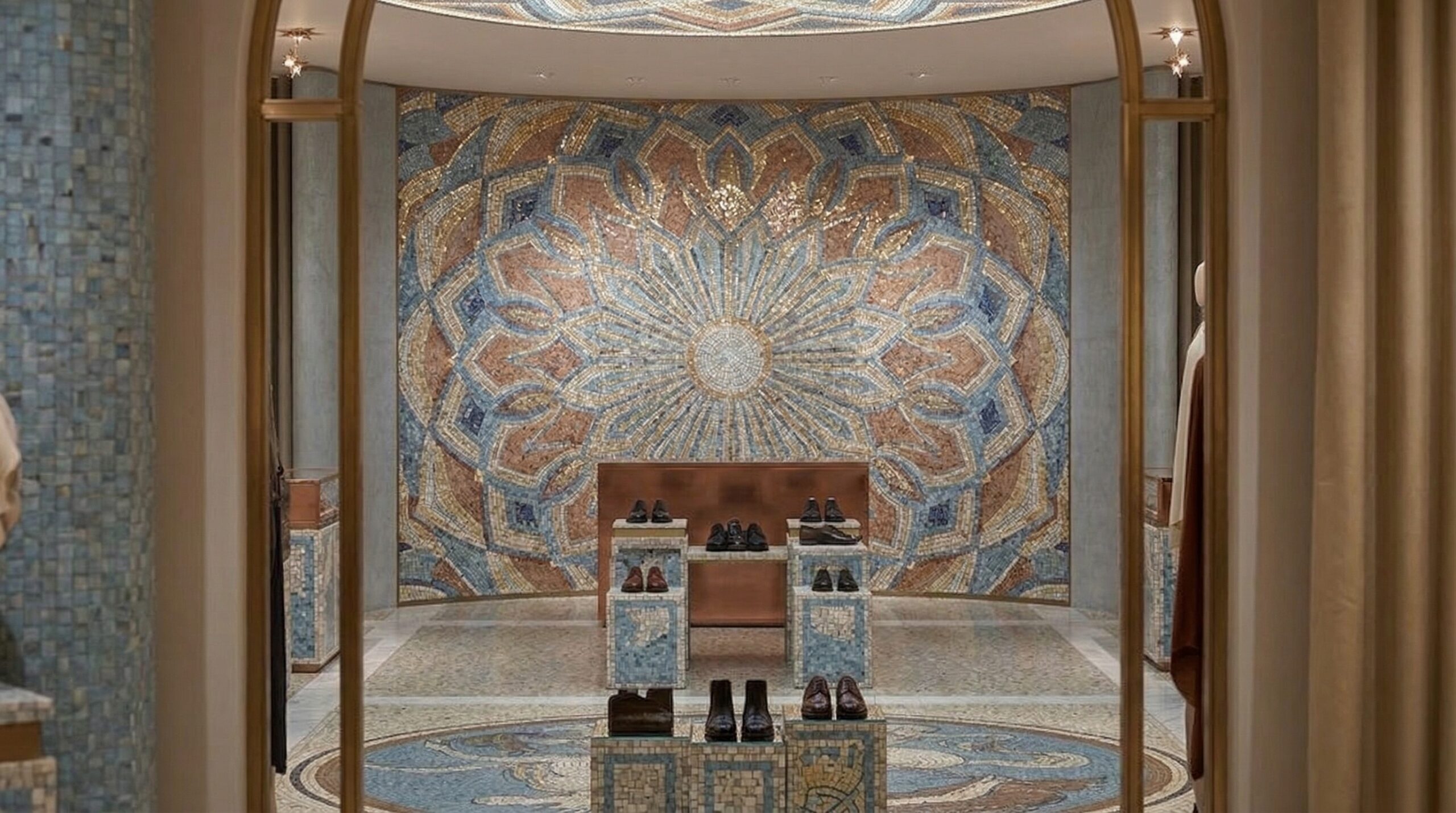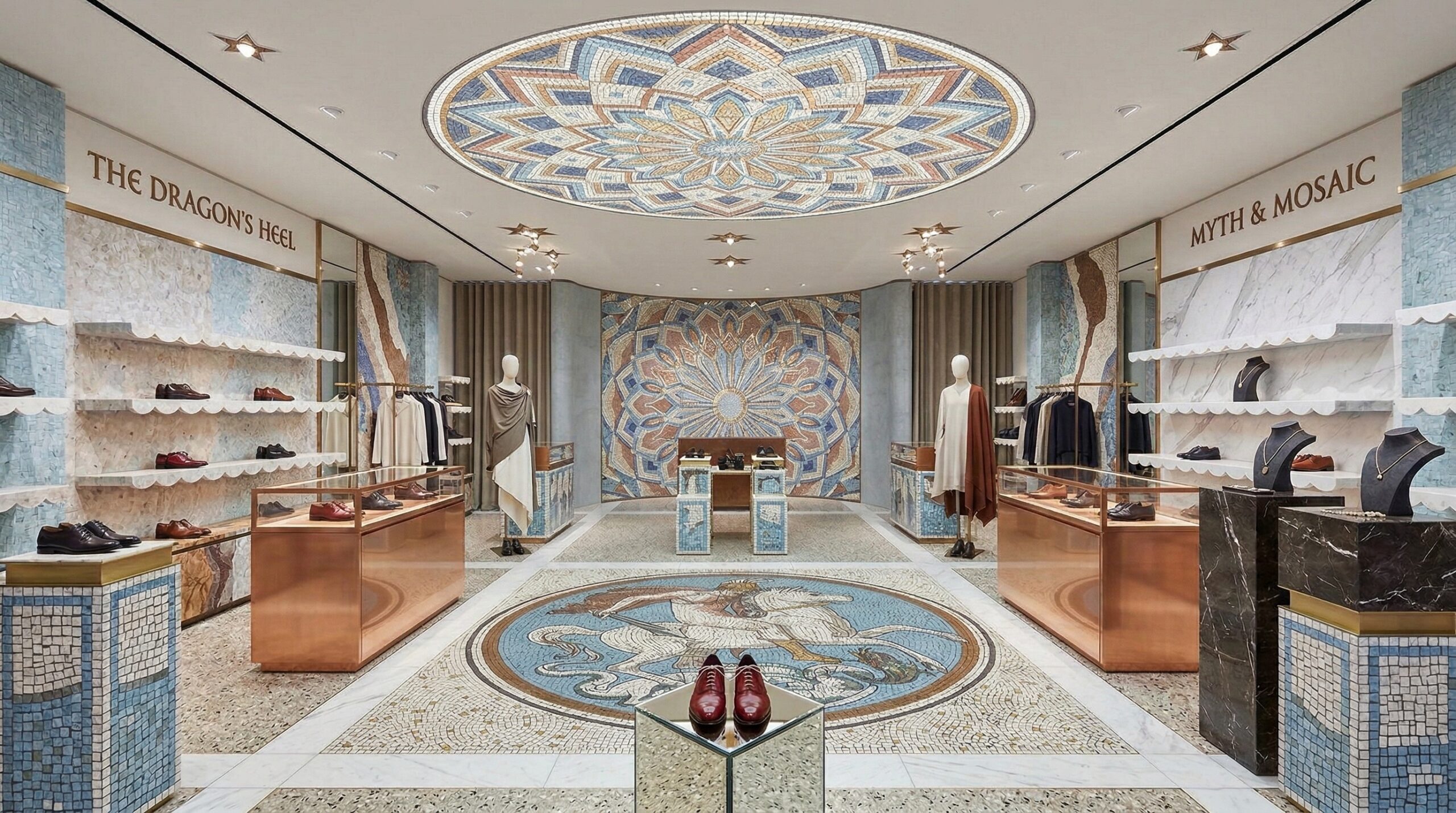 Klasik sanat ve zanaatkârlık mirasını çağdaş perakende kurgusu ile birleştiren bu mağaza tasarımı, mekânı adeta bir kültürel sahneye dönüştürür. Mozaik yüzeyler, detaylı tavan kompozisyonları ve mermer dokular, mekâna güçlü bir tarihsel referans kazandırırken; ürünler bu zengin arka plan üzerinde öne çıkar.