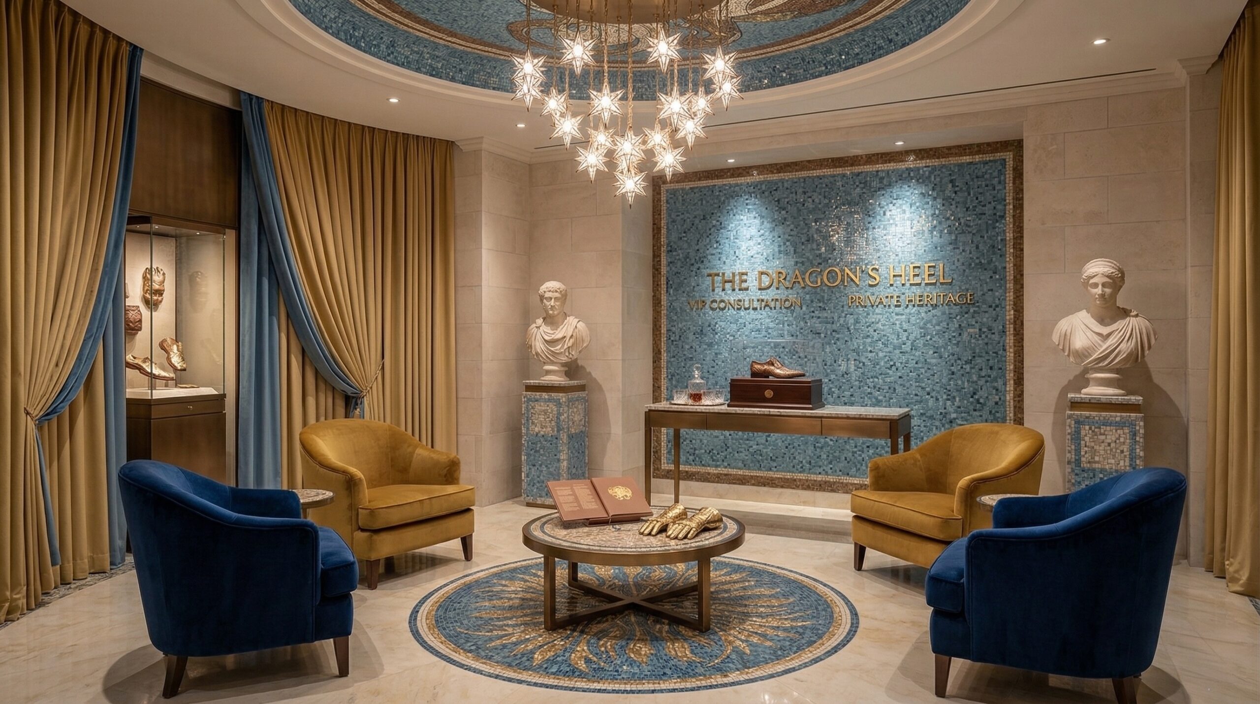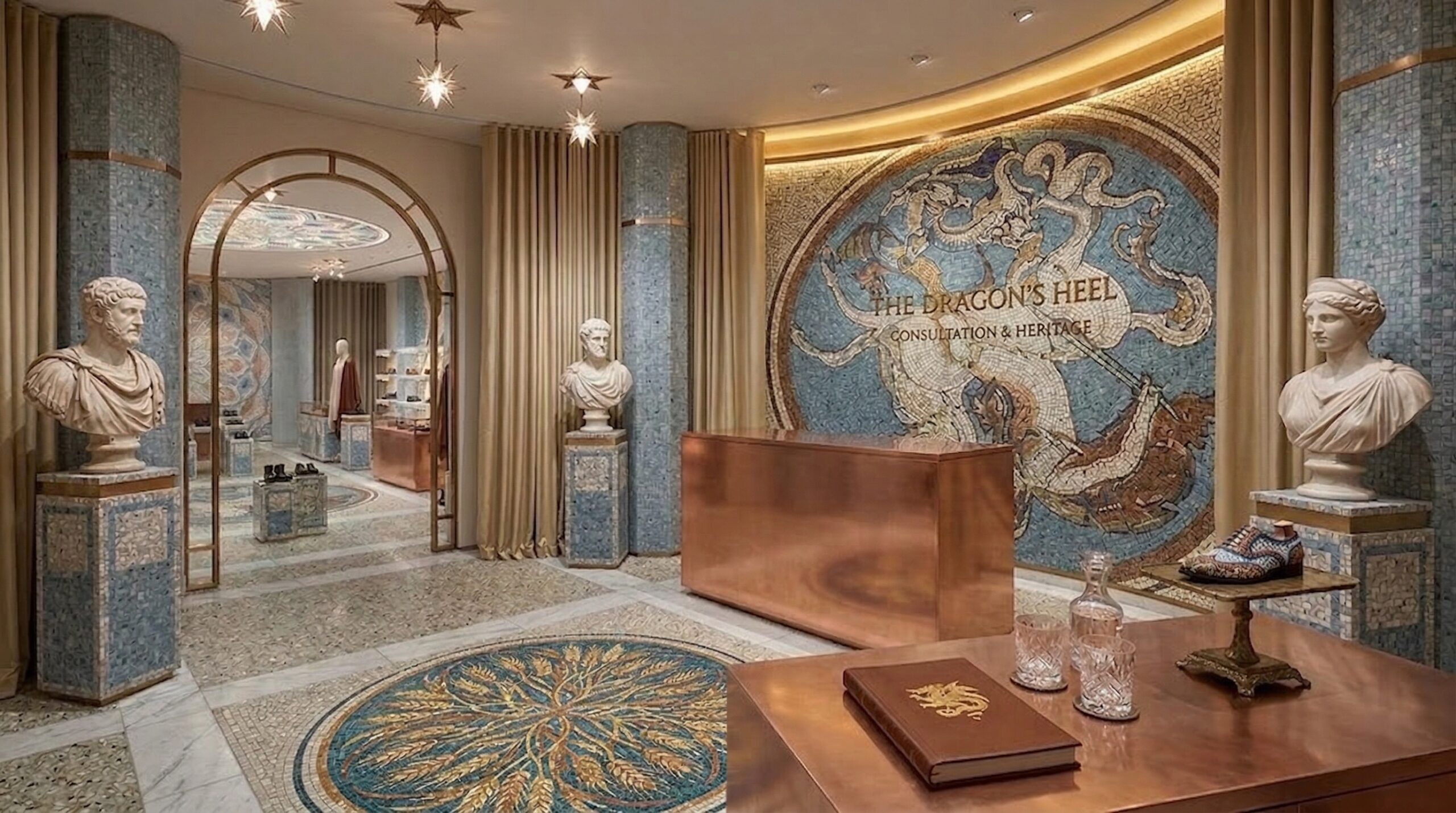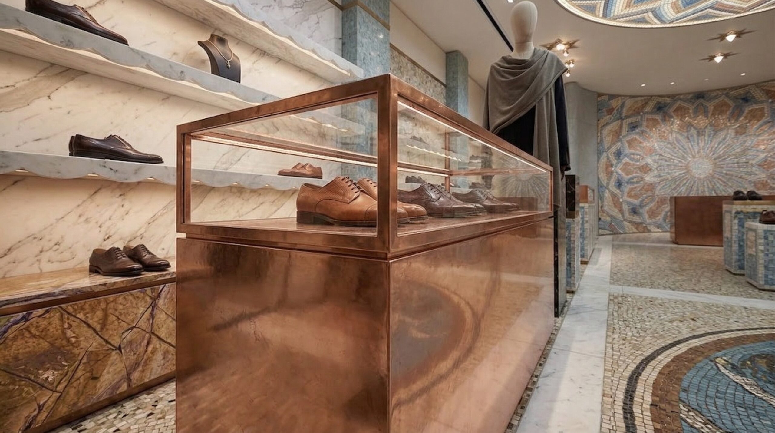 Klasik sanat ve zanaatkârlık mirasını çağdaş perakende kurgusu ile birleştiren bu mağaza tasarımı, mekânı adeta bir kültürel sahneye dönüştürür. Mozaik yüzeyler, detaylı tavan kompozisyonları ve mermer dokular, mekâna güçlü bir tarihsel referans kazandırırken; ürünler bu zengin arka plan üzerinde öne çıkar.