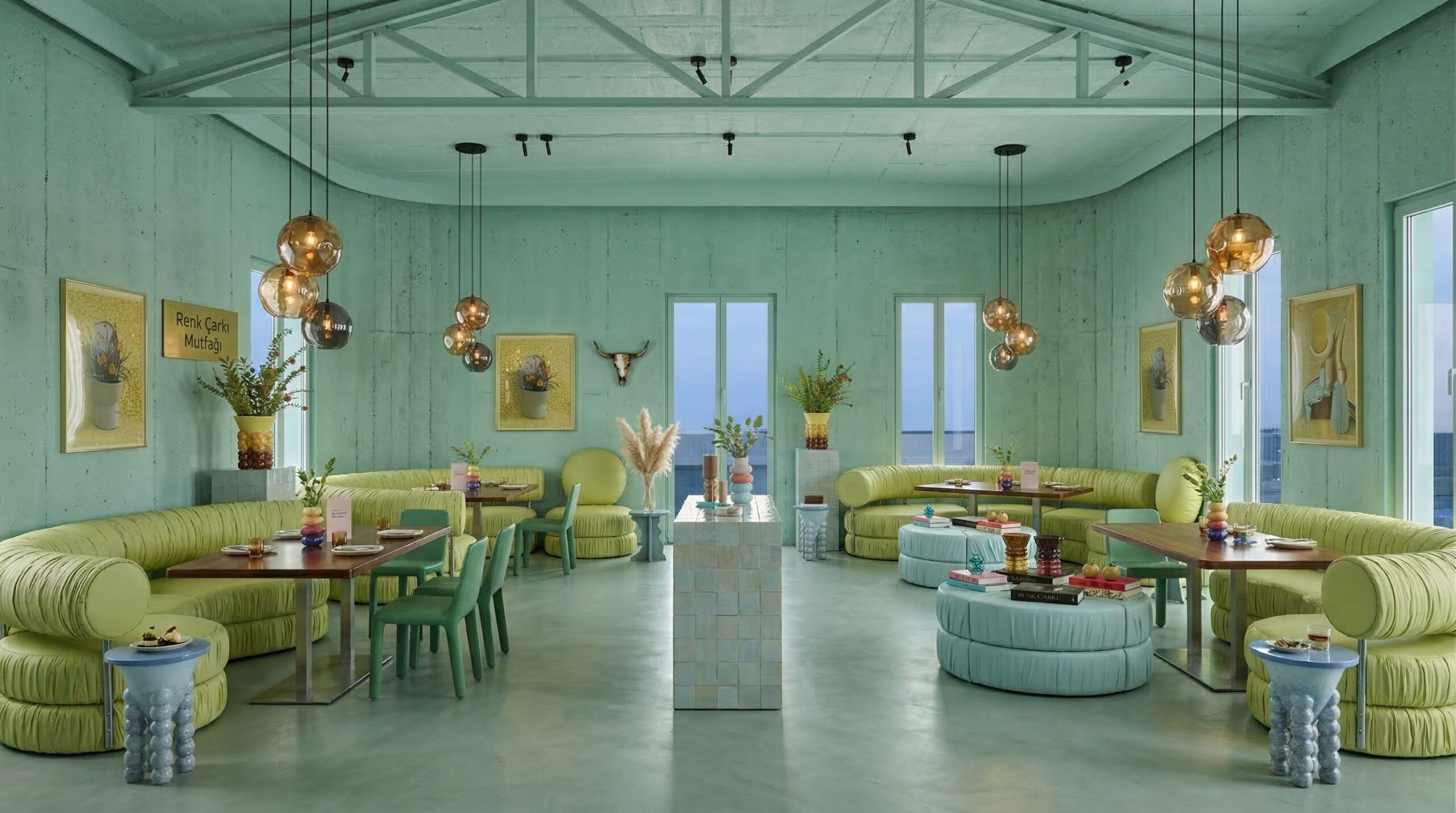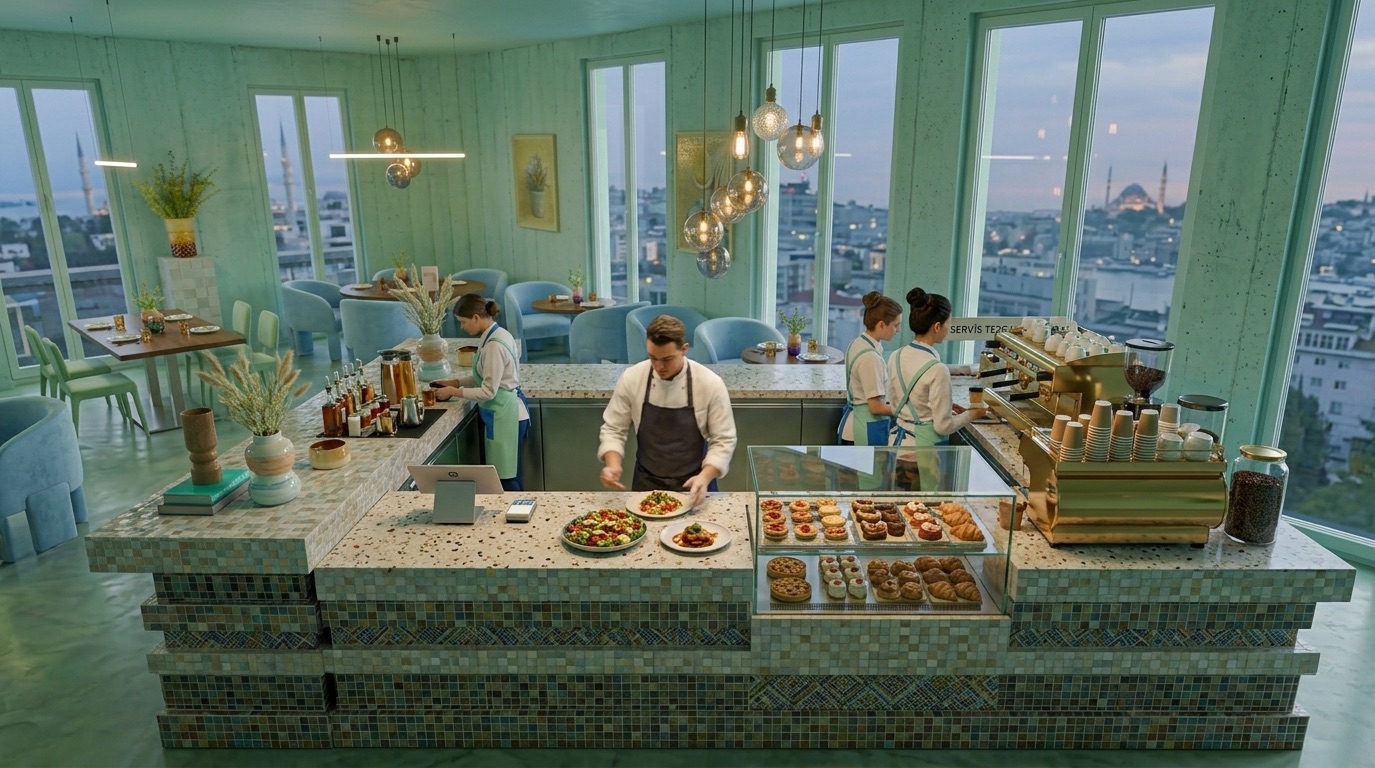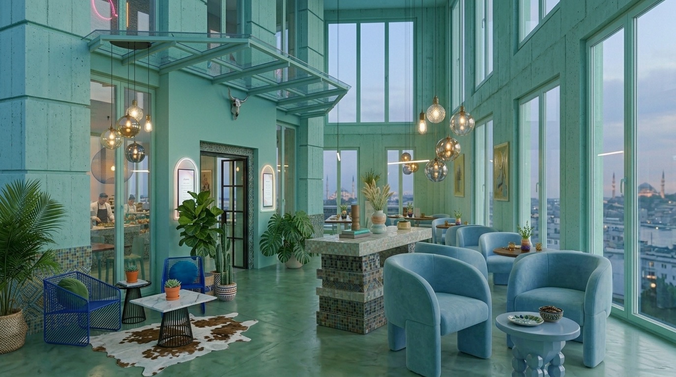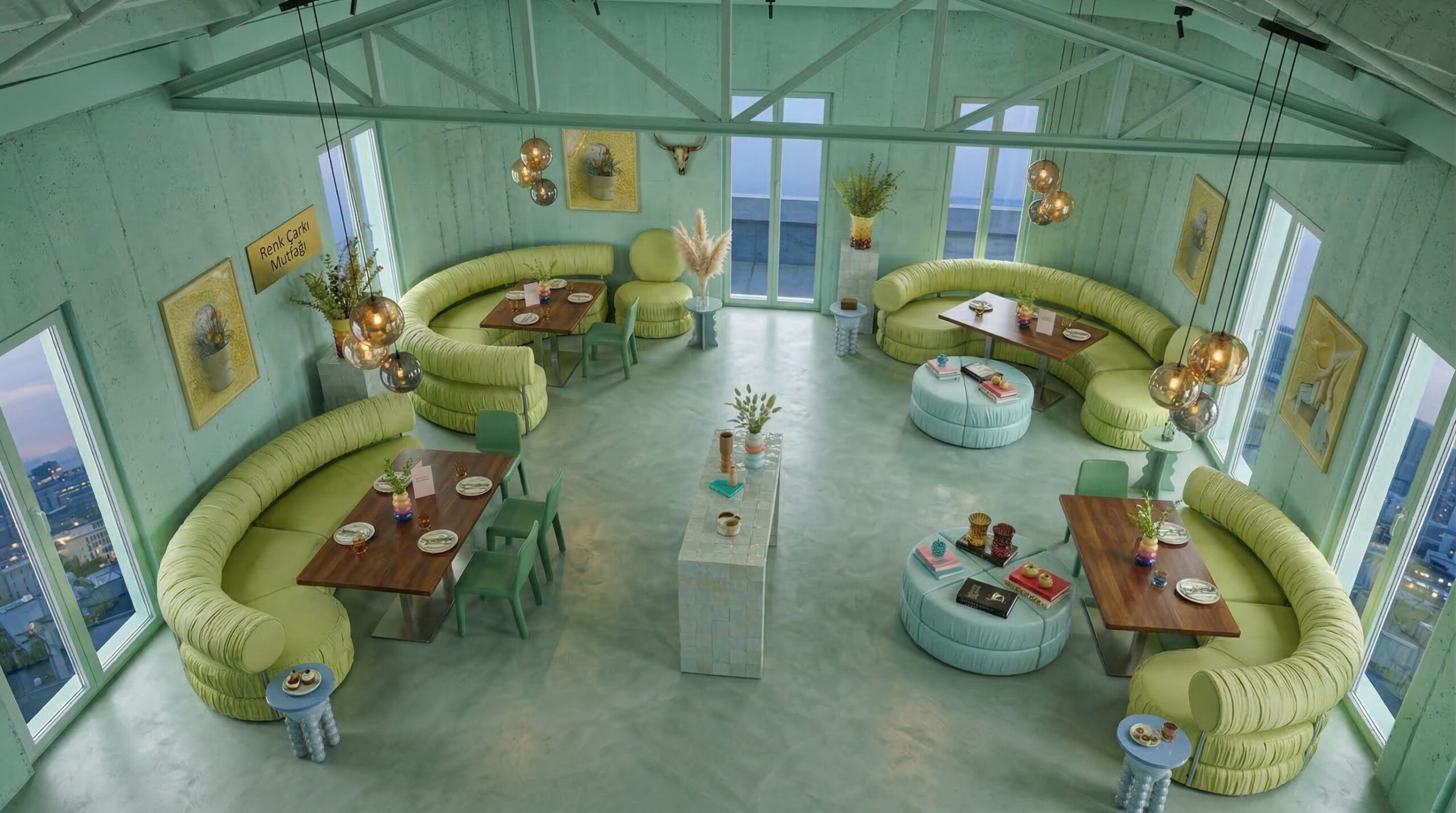 Panoramik şehir manzarası ile bütünleşen bu mekân, mint yeşili tonlarının hâkim olduğu ferah ve çağdaş bir atmosfer sunar. Geniş cam yüzeyler ve yüksek hacimli mekânsal kurgu, iç ve dış arasındaki sınırları geçirgen hale getirirken; gün ışığı mekânın ana tasarım öğesine dönüşür.