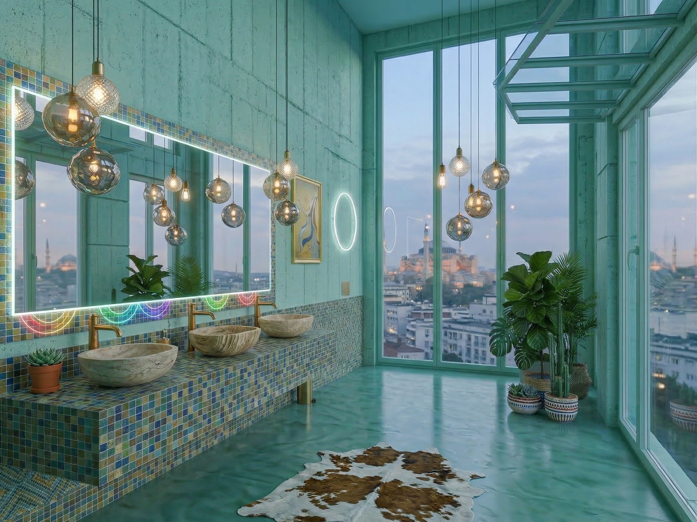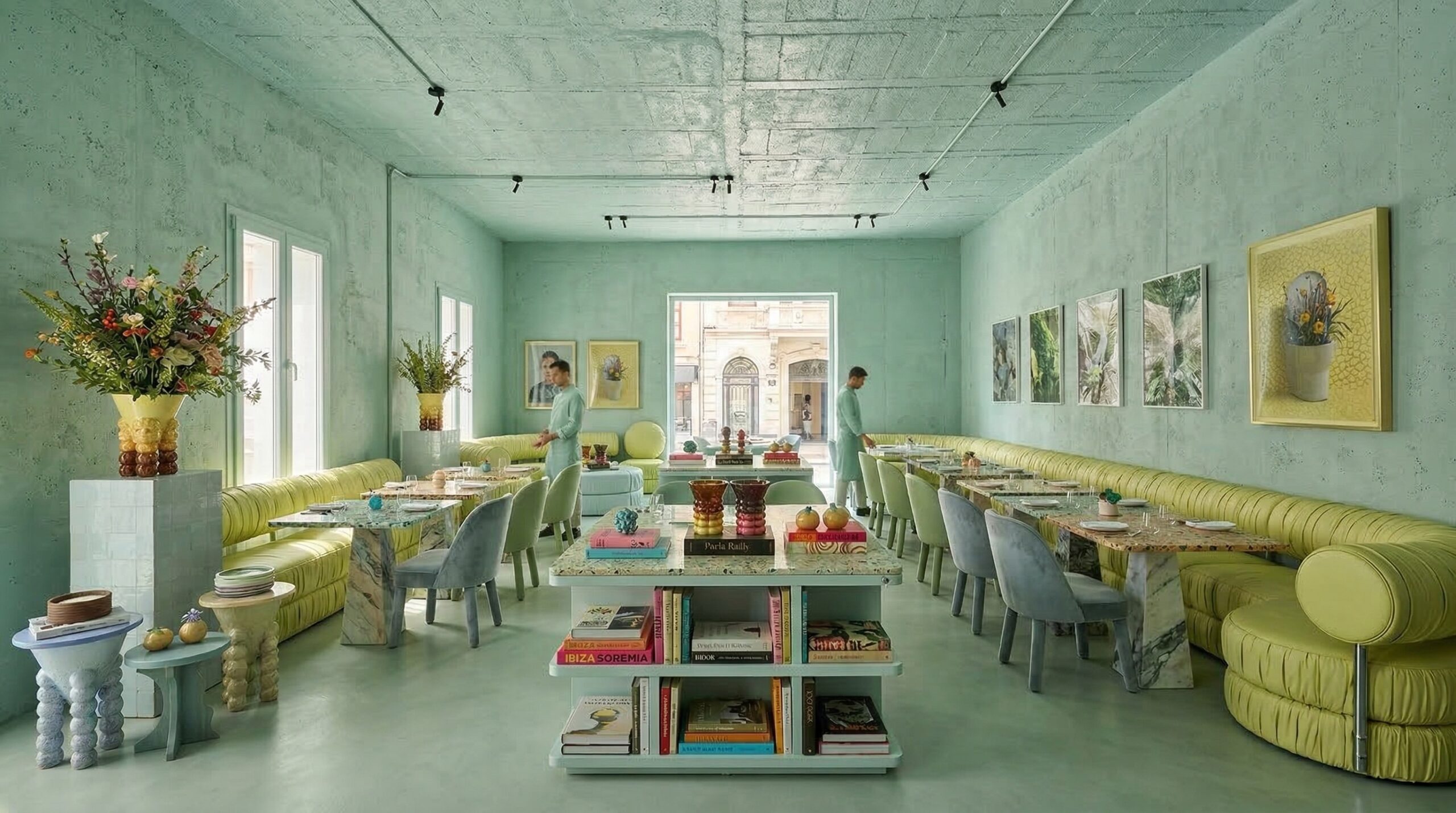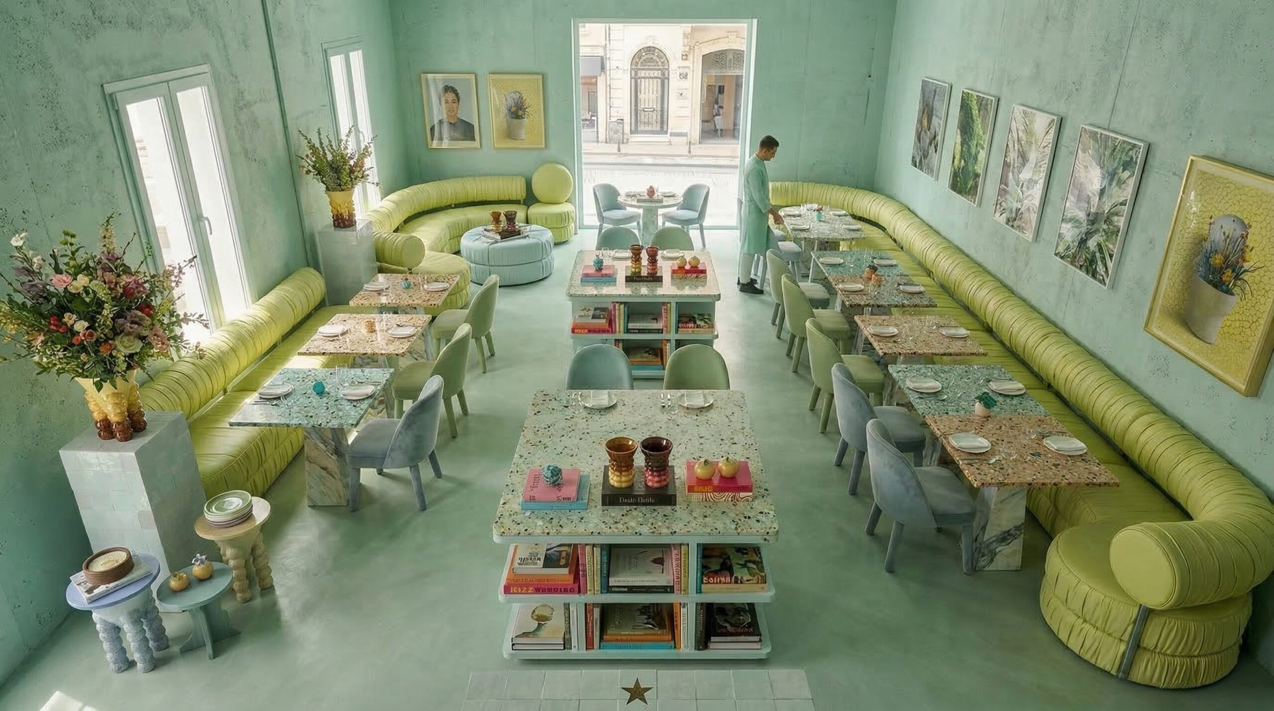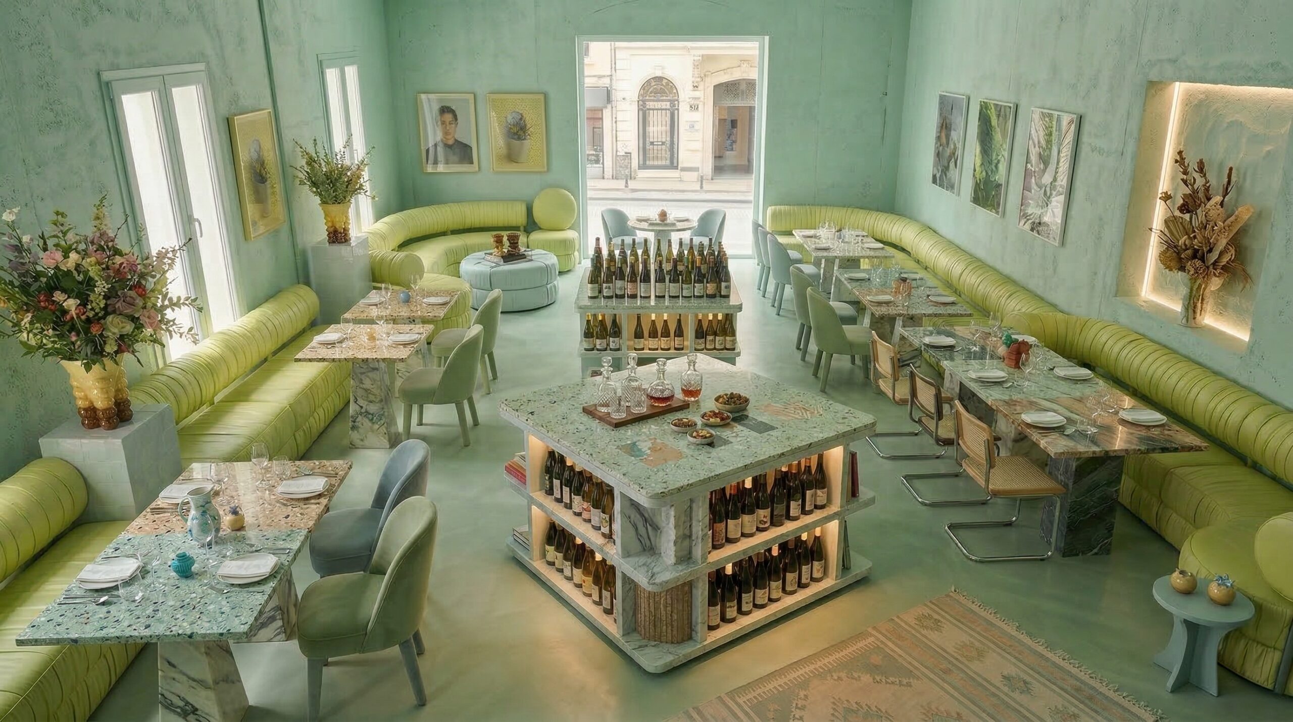 Panoramik şehir manzarası ile bütünleşen bu mekân, mint yeşili tonlarının hâkim olduğu ferah ve çağdaş bir atmosfer sunar. Geniş cam yüzeyler ve yüksek hacimli mekânsal kurgu, iç ve dış arasındaki sınırları geçirgen hale getirirken; gün ışığı mekânın ana tasarım öğesine dönüşür.