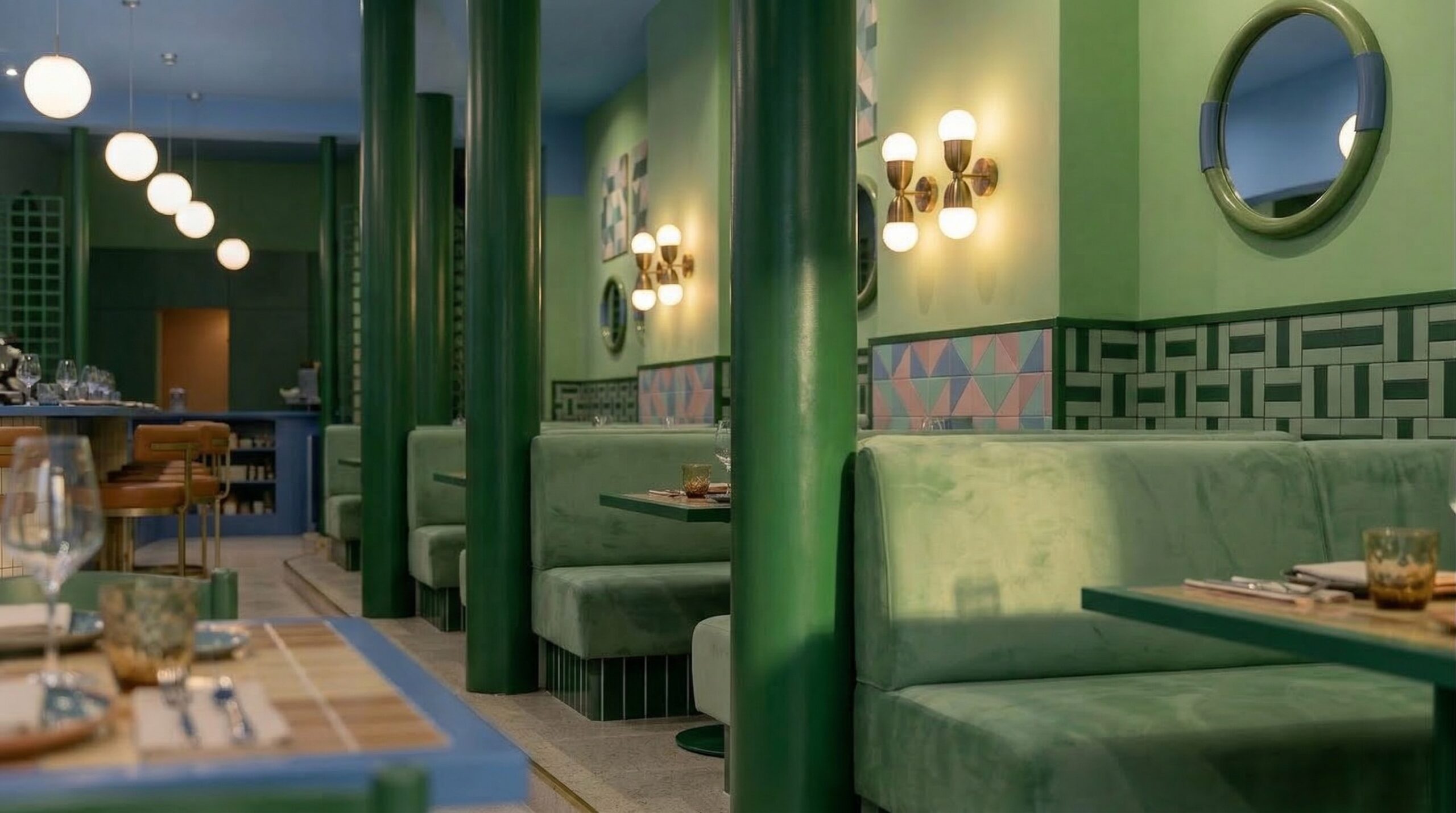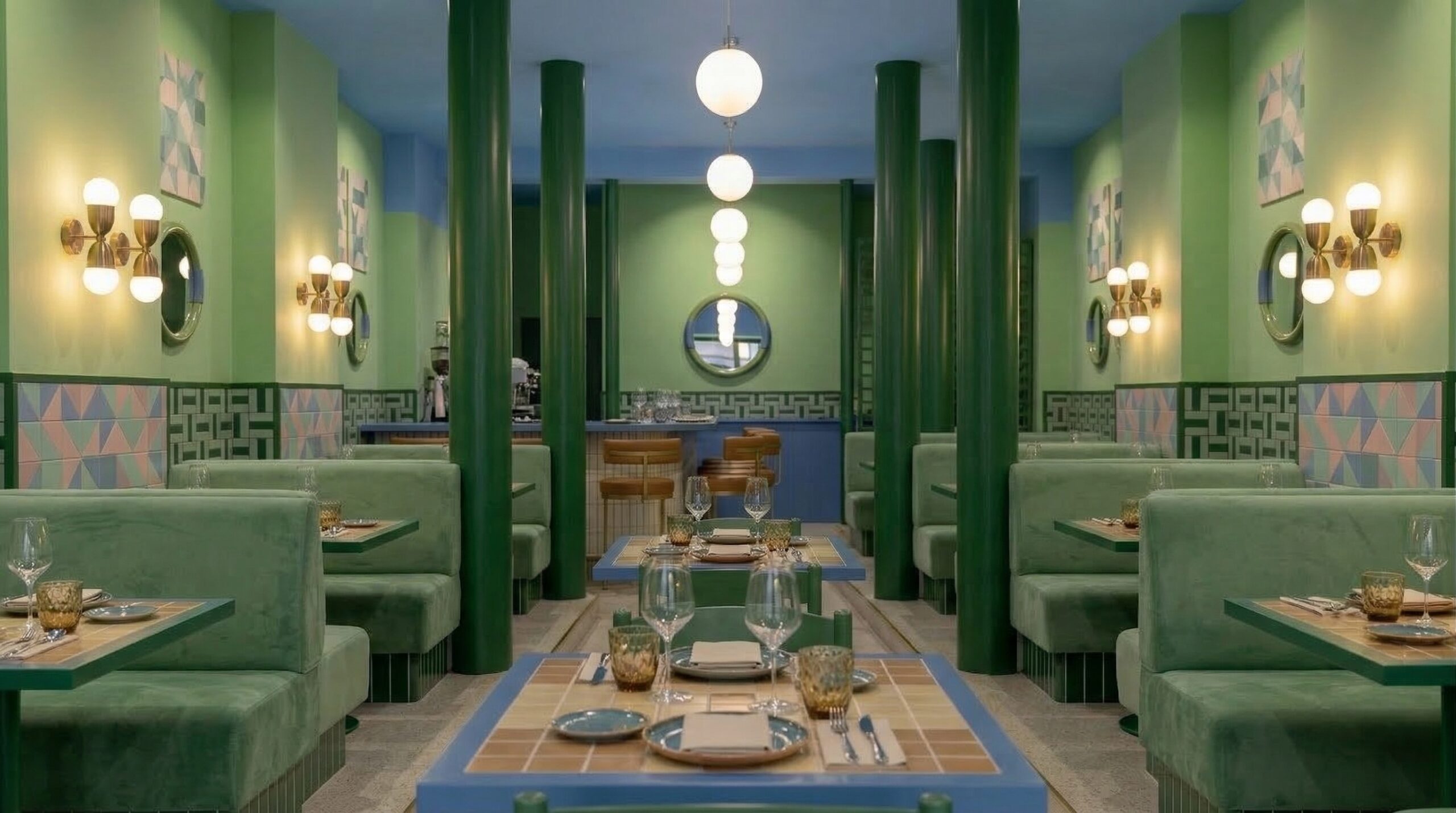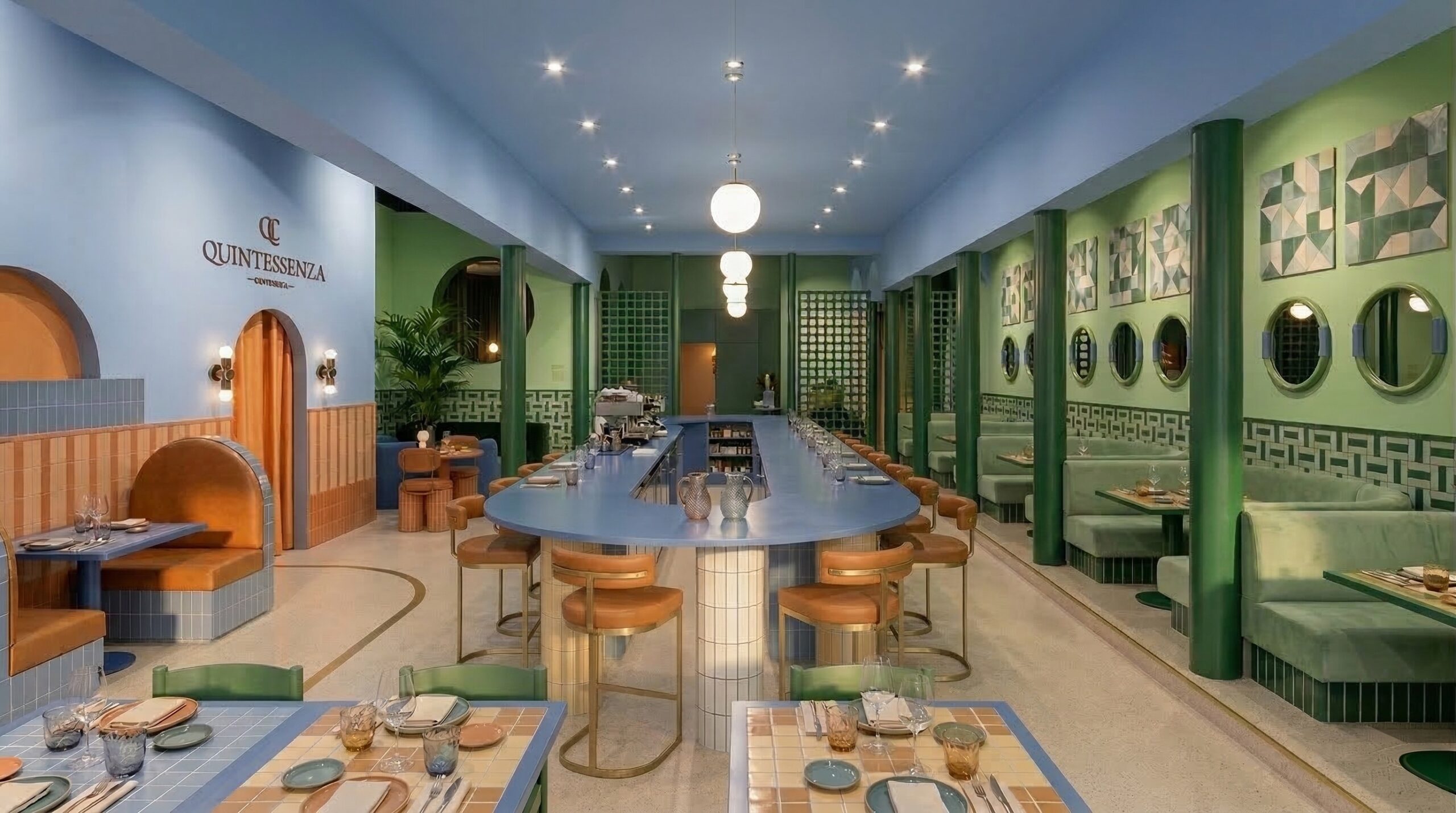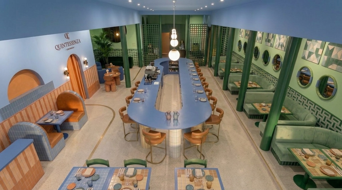 Canlı renk blokları, geometrik yüzeyler ve güçlü kolon ritmi ile kurgulanan bu mekân, Akdeniz ve Art Deco etkilerini çağdaş bir bistro dilinde bir araya getirir. Mavi, yeşil ve terracotta tonlarının kontrastlı kullanımı, mekâna enerjik ve karakteristik bir kimlik kazandırırken; yarım daire formlu nişler ve kemerli geçişler mekânsal sürekliliği destekler.
