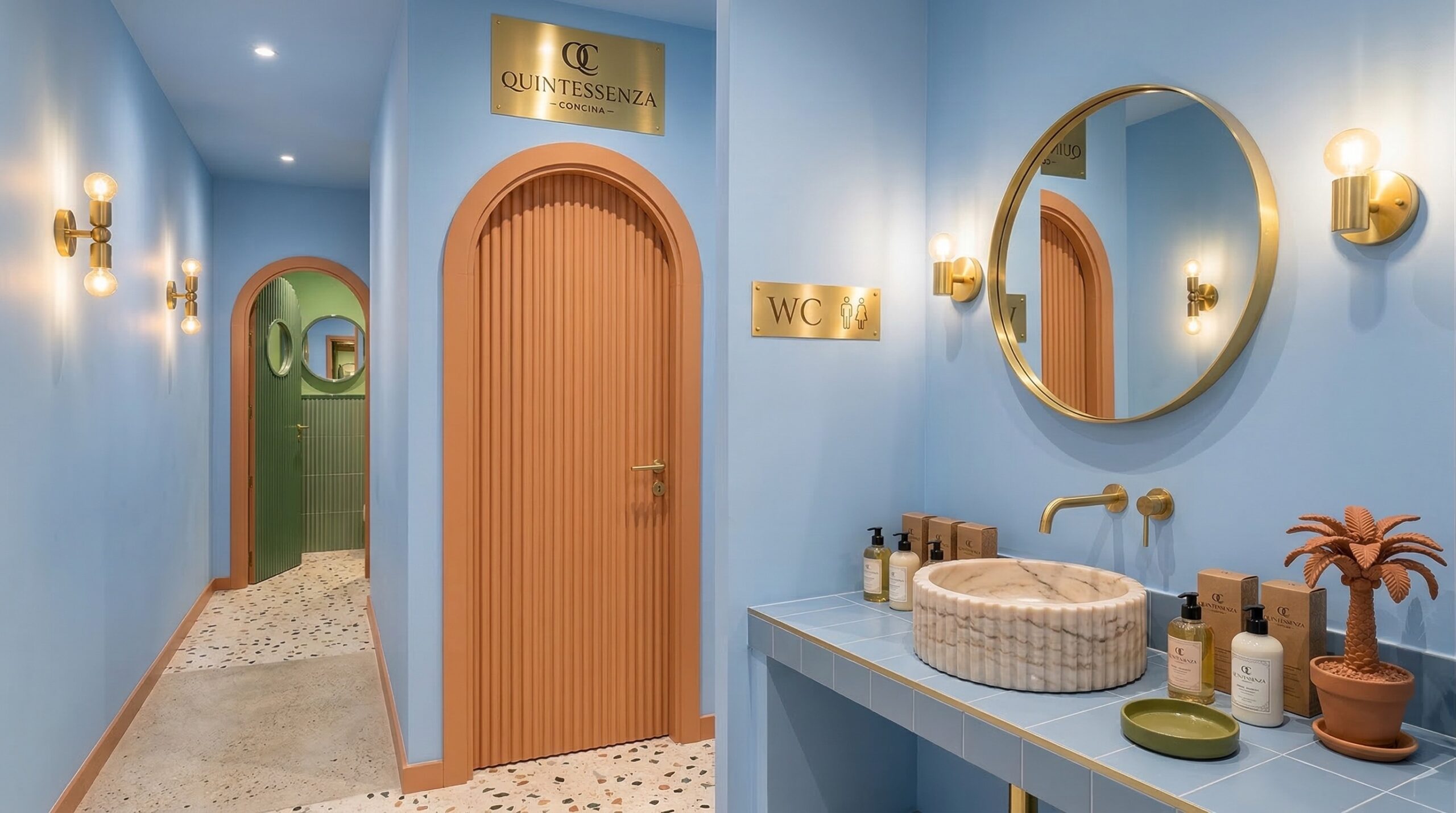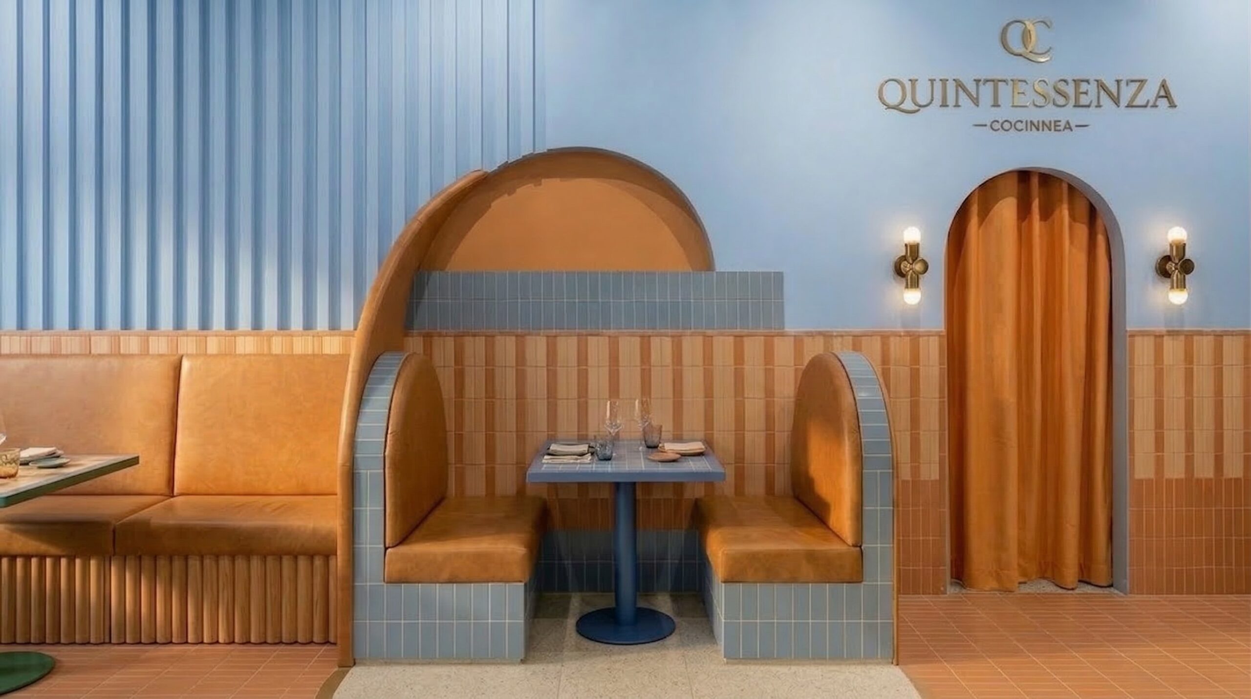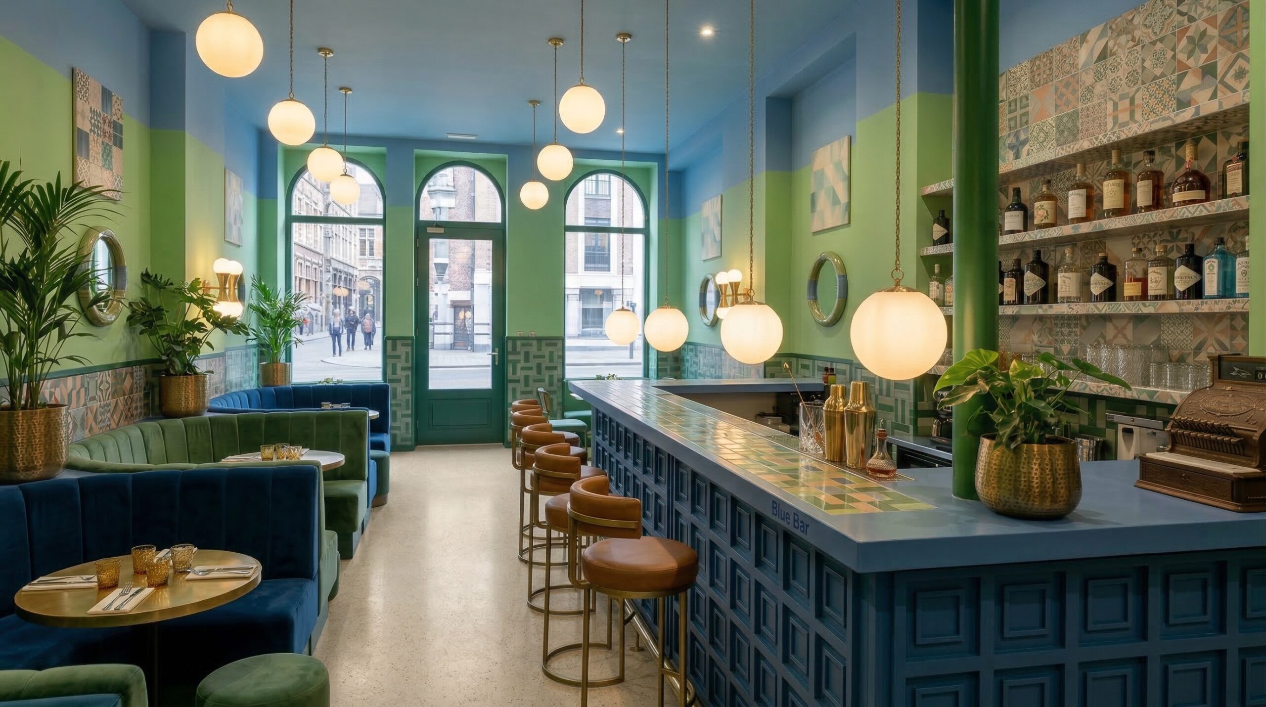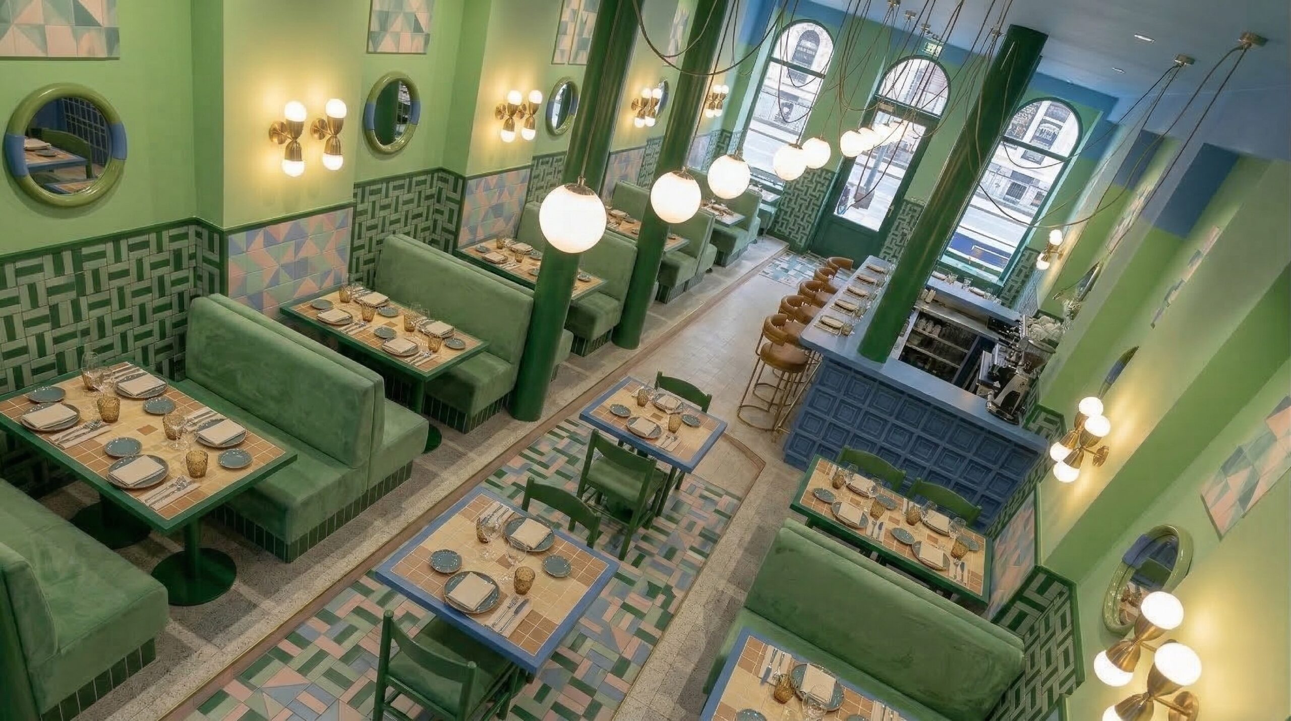Canlı renk blokları, geometrik yüzeyler ve güçlü kolon ritmi ile kurgulanan bu mekân, Akdeniz ve Art Deco etkilerini çağdaş bir bistro dilinde bir araya getirir. Mavi, yeşil ve terracotta tonlarının kontrastlı kullanımı, mekâna enerjik ve karakteristik bir kimlik kazandırırken; yarım daire formlu nişler ve kemerli geçişler mekânsal sürekliliği destekler.