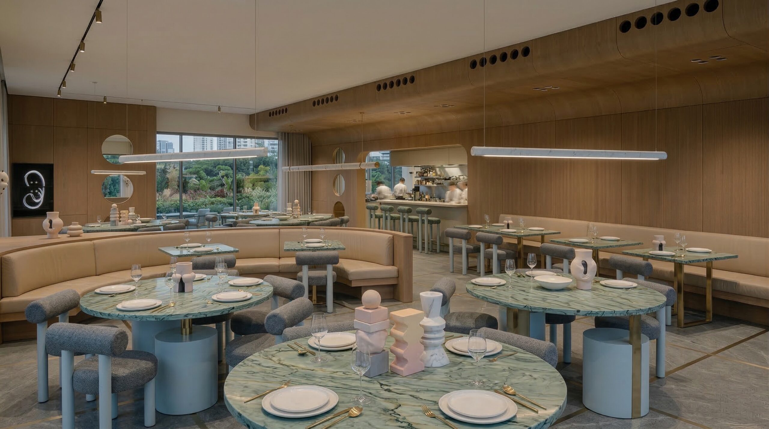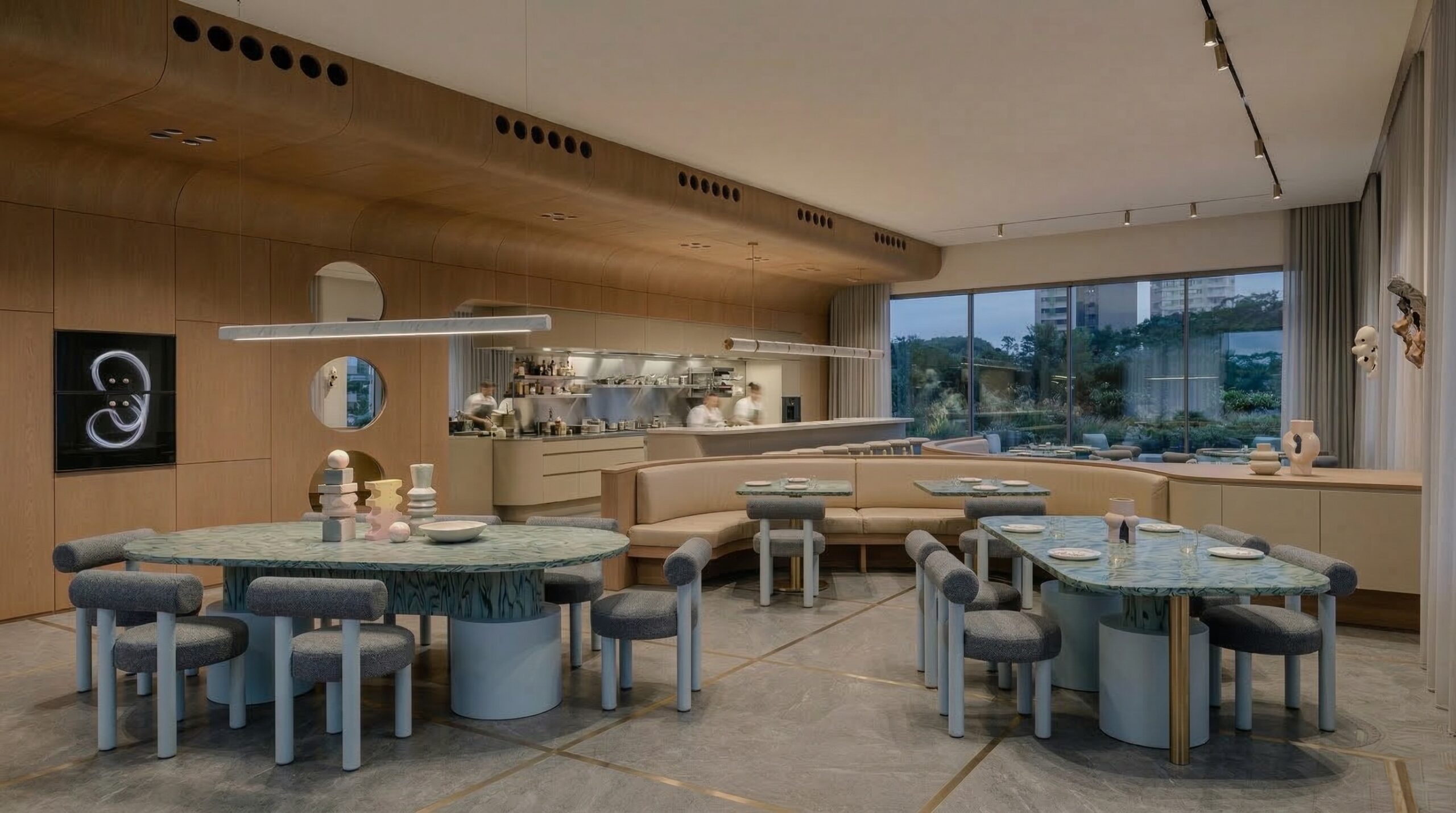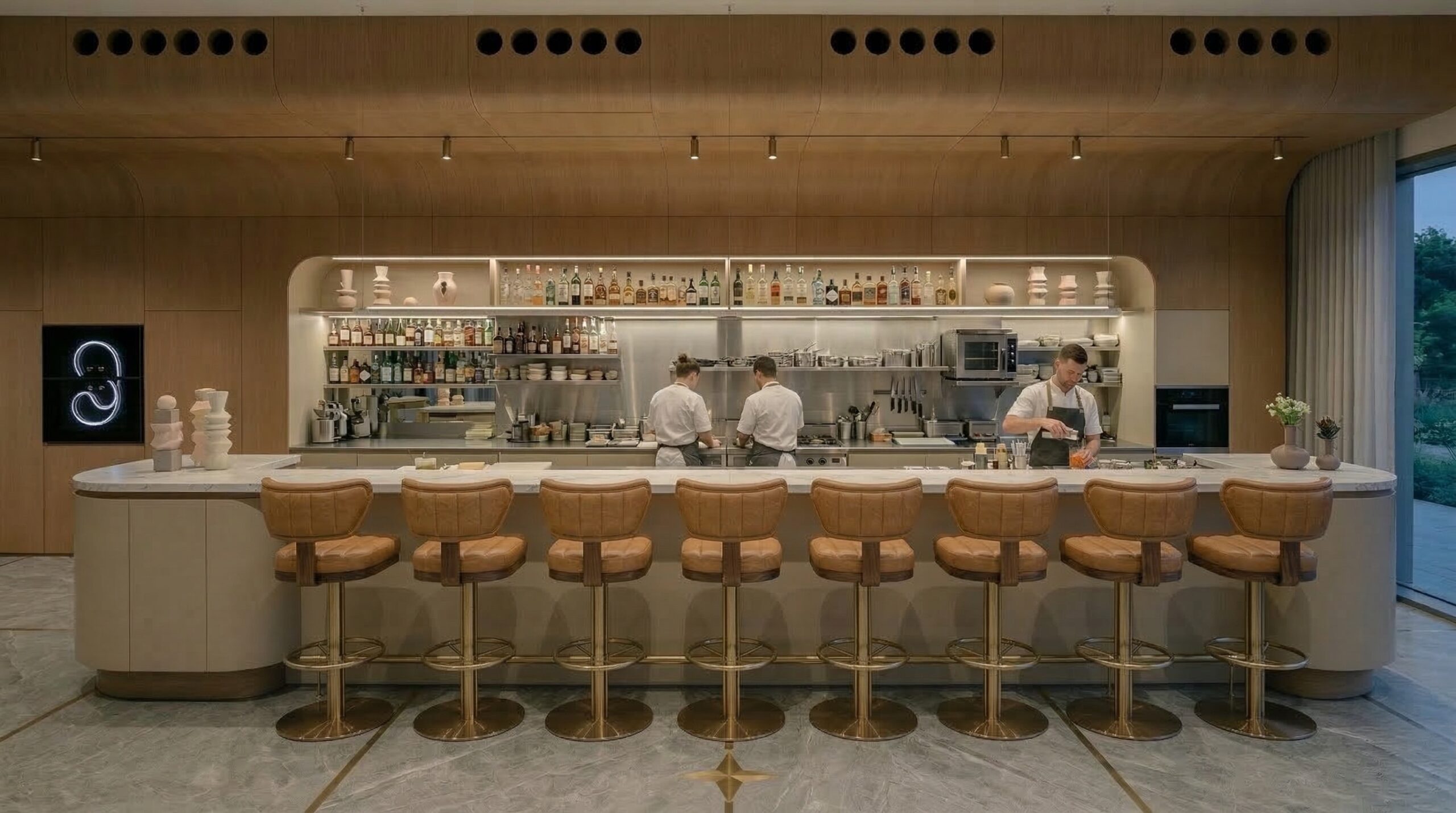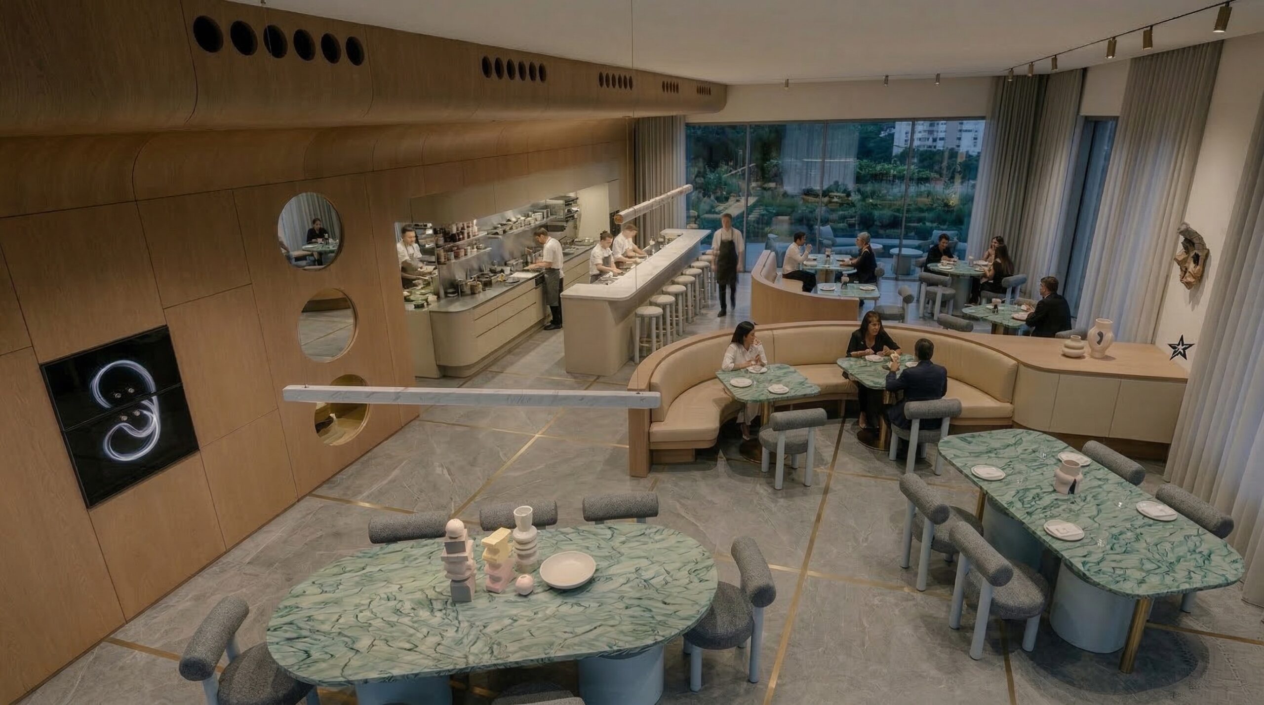 Doğal taş ve sıcak ahşap yüzeylerin birlikte kurgulandığı bu proje, dış cephede dikey ahşap ritimler ve şeffaf giriş aksı ile davetkâr bir kent arayüzü oluşturur. İç mekânda ise açık mutfak ve lineer bar düzeni, mekânın merkezinde konumlanarak sosyal etkileşimi artırır.