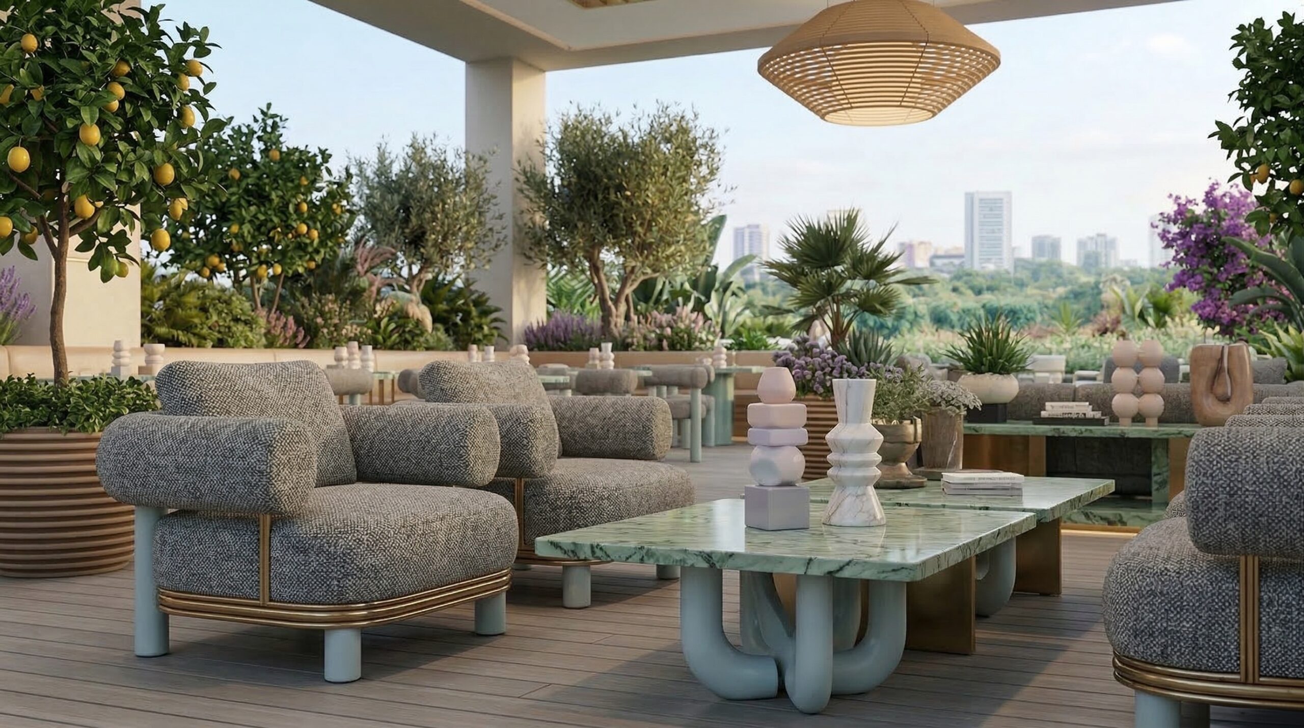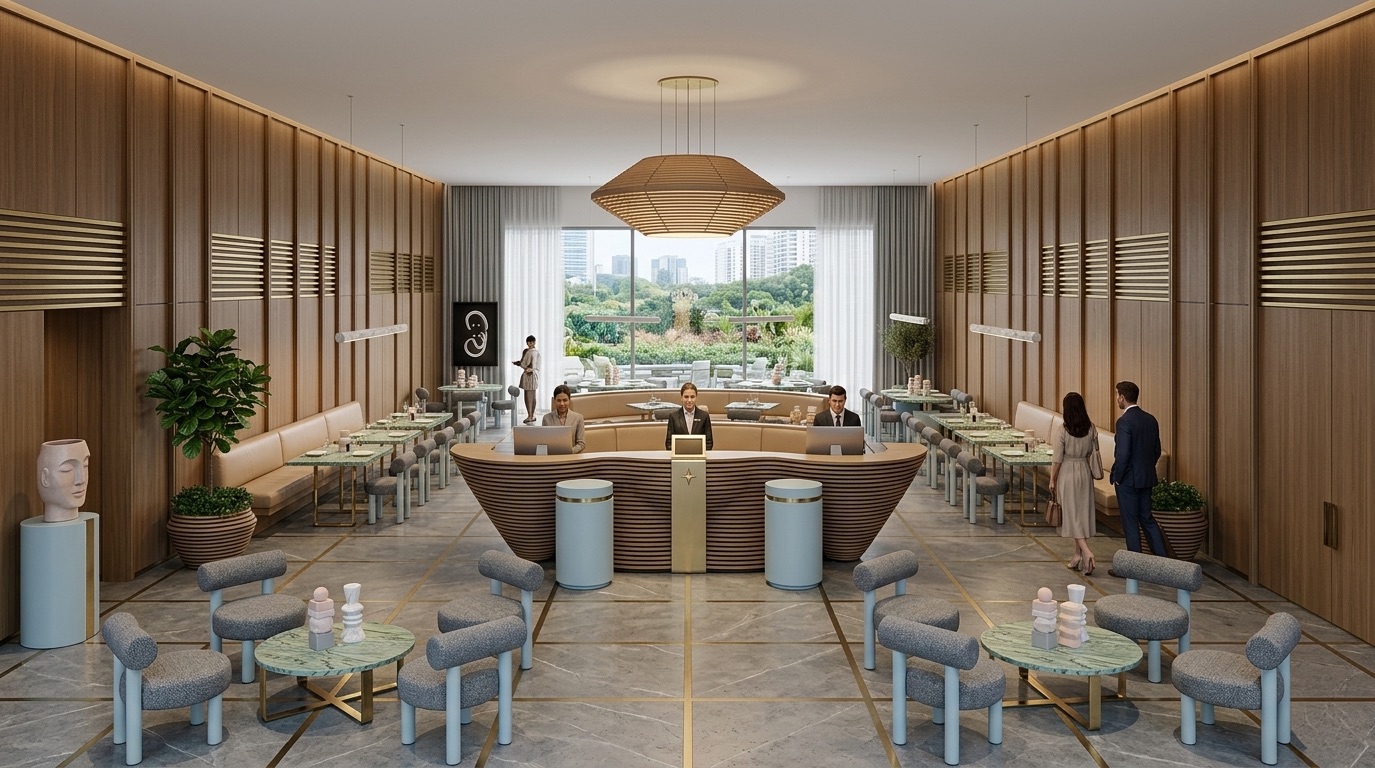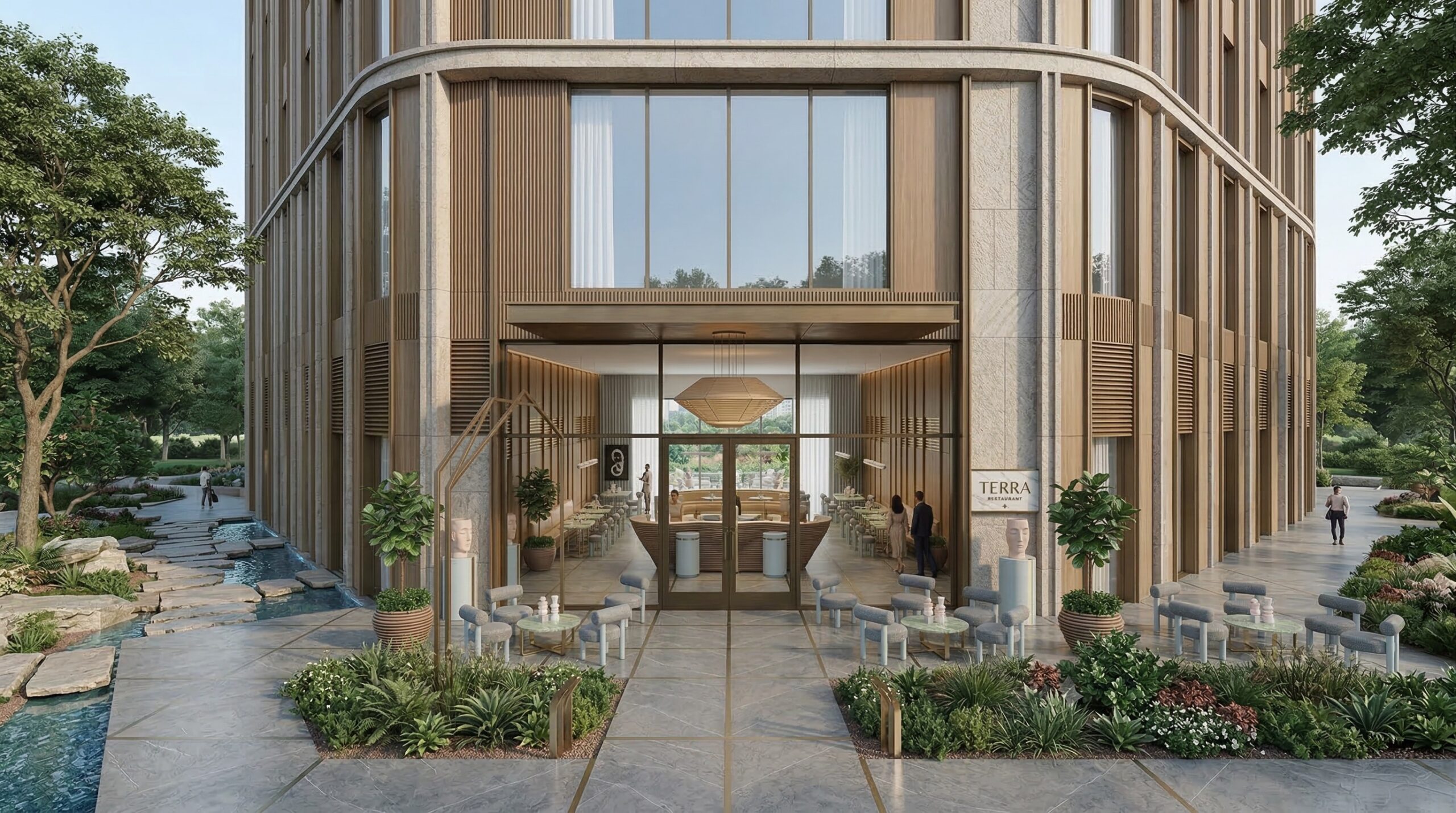 Yuvarlak mermer masalar, yumuşak hatlı oturma elemanları ve booth çözümleri farklı kullanıcı senaryolarına olanak tanırken; geniş açıklıklar ve gün ışığı ile mekân derinliği güçlendirilir. Ahşap paneller, gömme raf sistemleri ve bitkisel dokunuşlar katmanlı bir atmosfer yaratır. Genel kurguda modern kafe dili ile doğal malzeme paleti arasında dengeli ve rafine bir geçiş hedeflenmiştir.