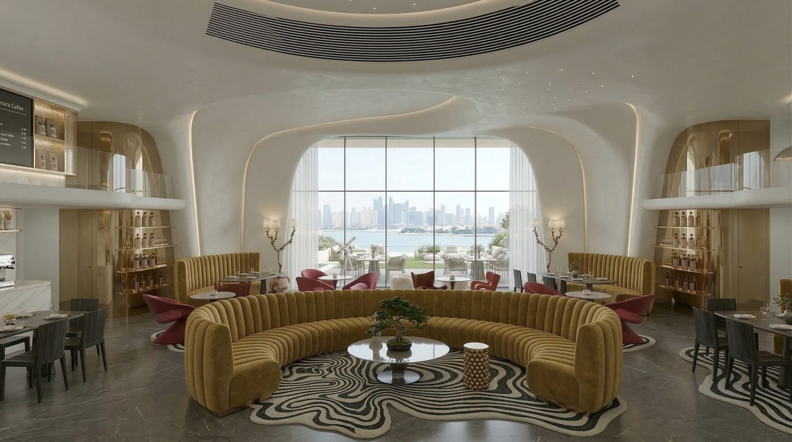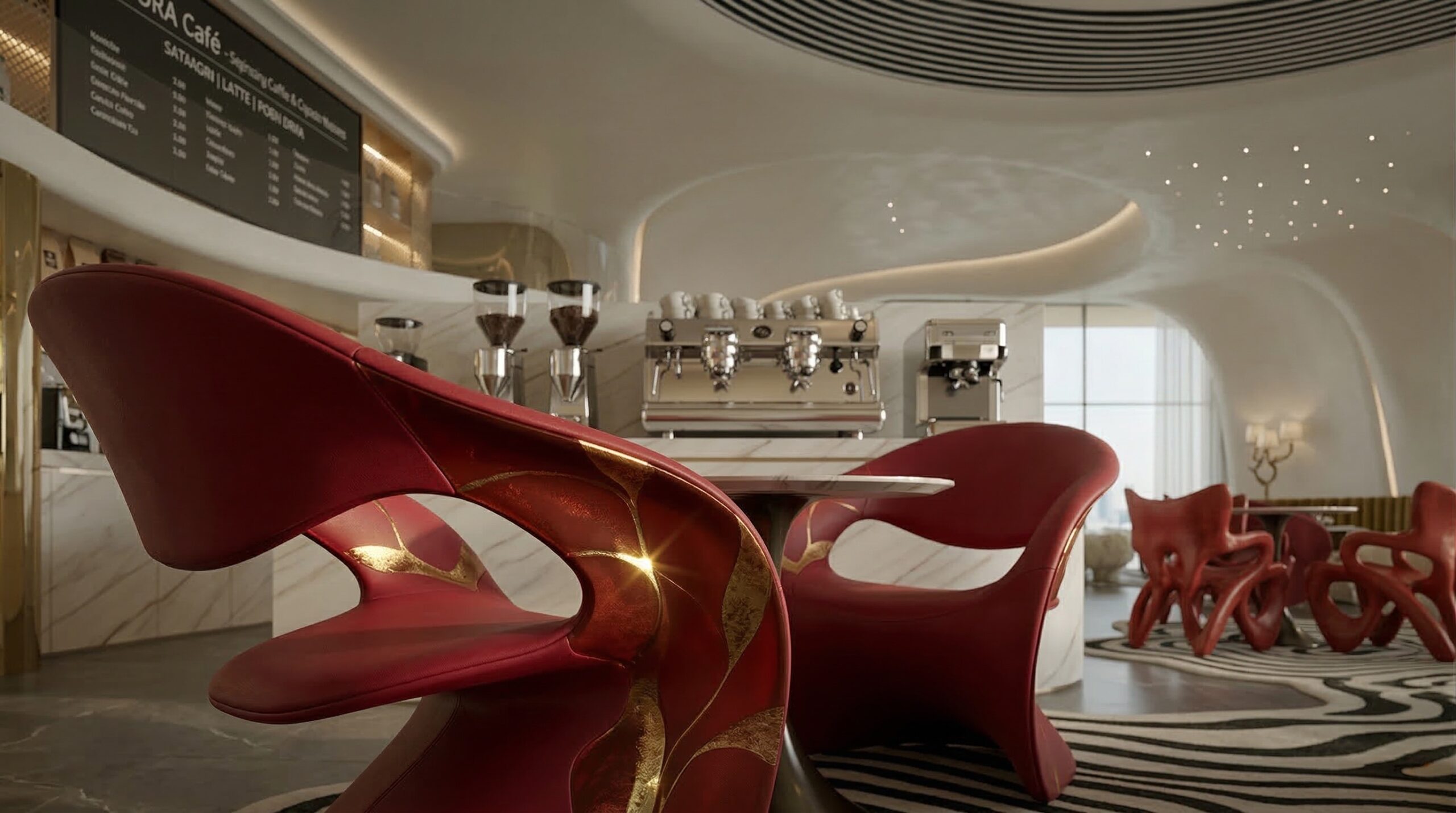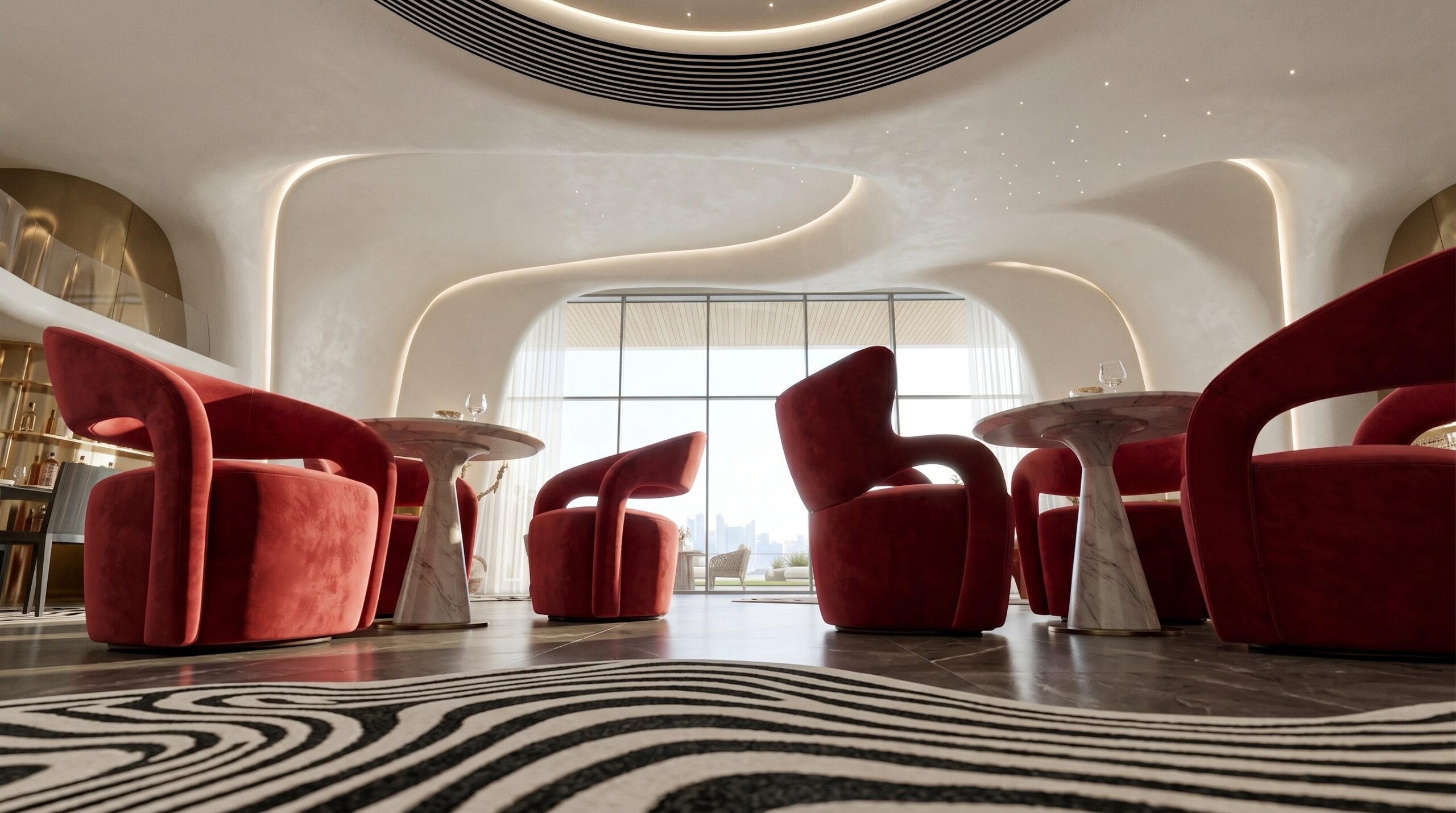 Akışkan formlar ve heykelsi mobilyaların ön planda olduğu bu restoran tasarımı, futuristik ve lüks bir mekânsal deneyim sunar. Yumuşak geçişli beyaz yüzeyler ve kıvrımlı mimari kabuk, mekânı bütüncül bir forma dönüştürürken; kırmızı tonlardaki organik mobilyalar güçlü bir odak oluşturur. Grafik zemin desenleri ve dramatik aydınlatmalar mekâna dinamik bir etki katarken, geniş açıklıklar ve manzara ilişkisi iç mekânı dış çevre ile bağlar. Deneyim odaklı, ikonik ve akılda kalıcı bir restoran atmosferi oluşturulmuştur.