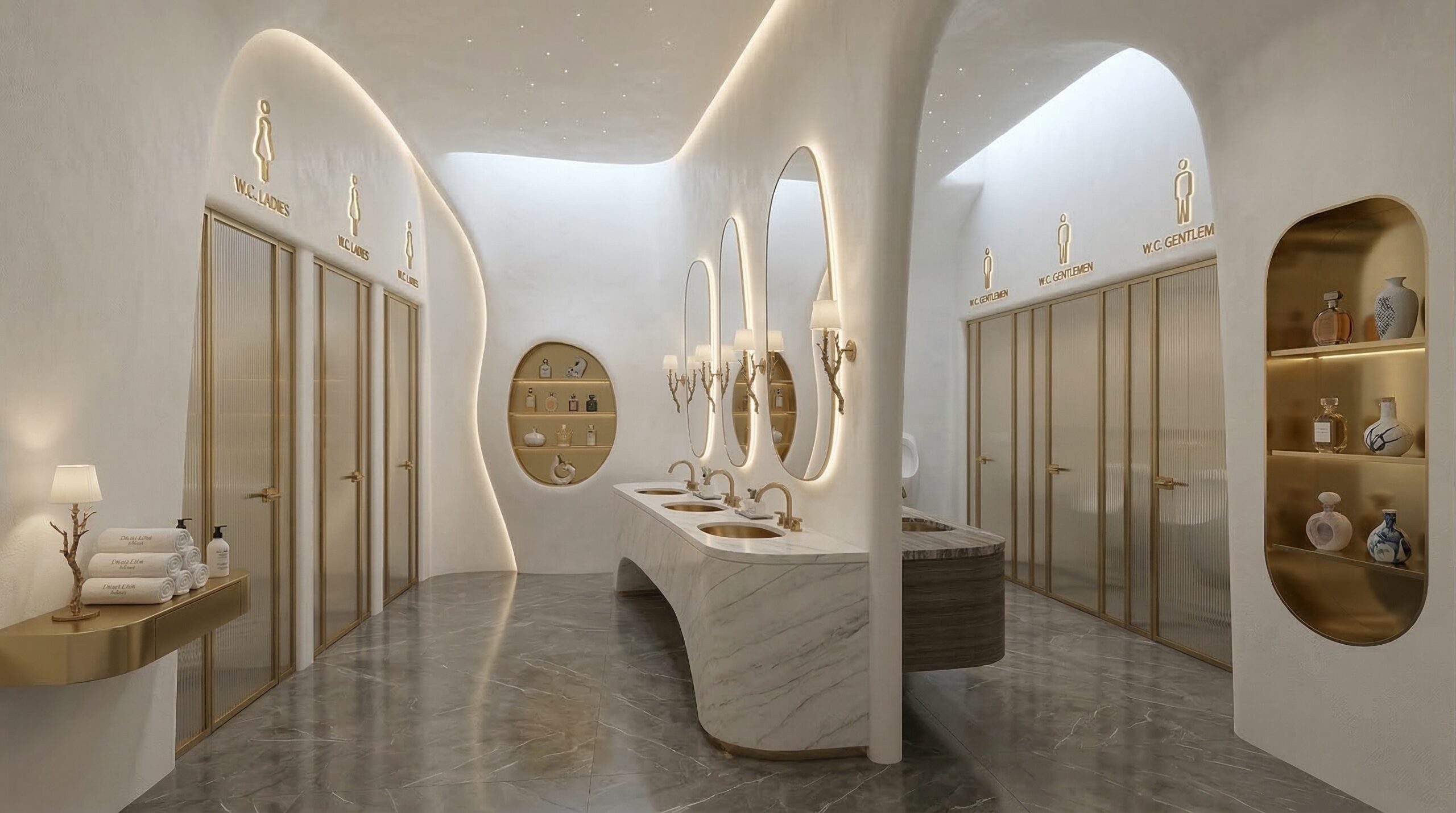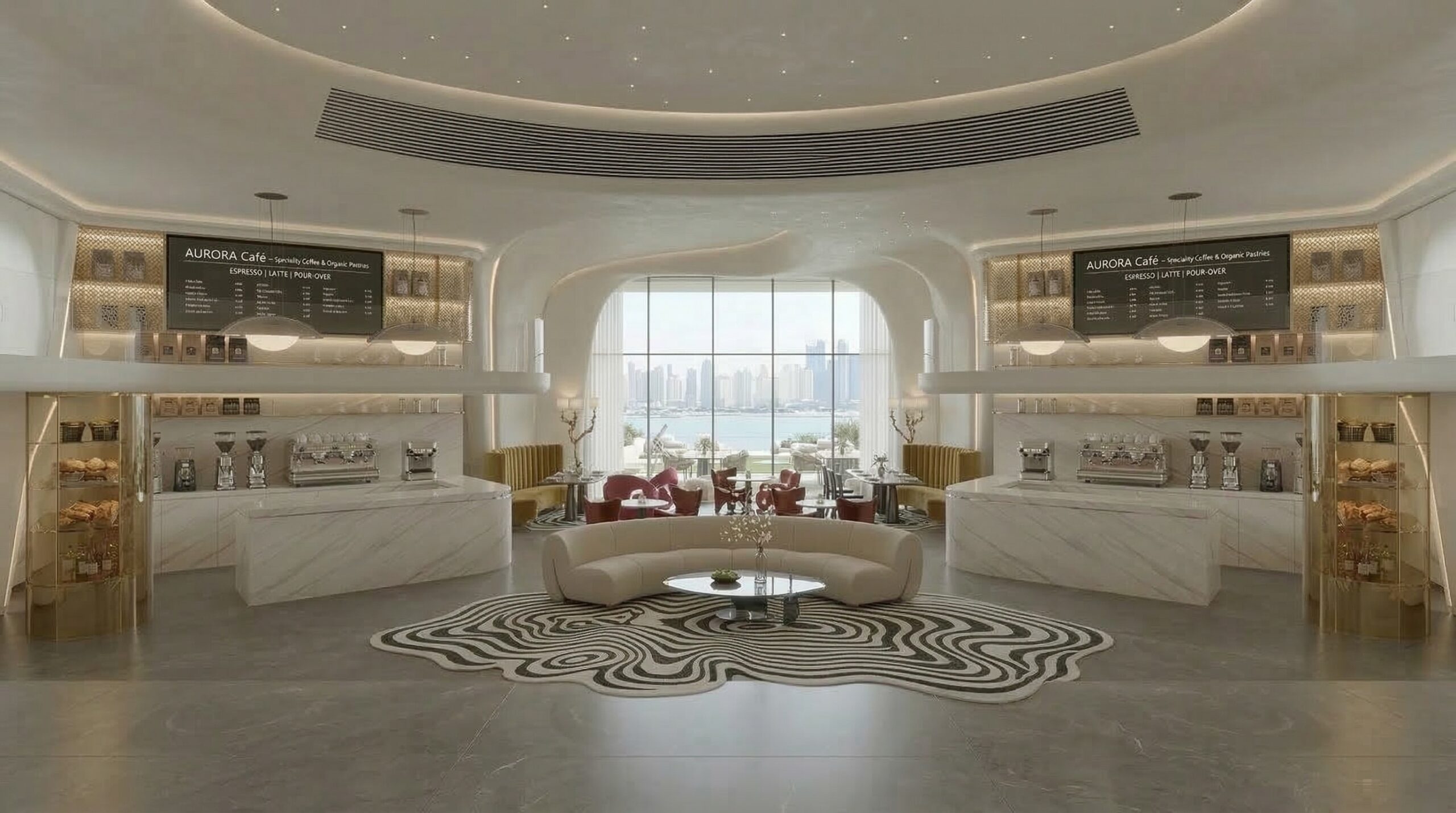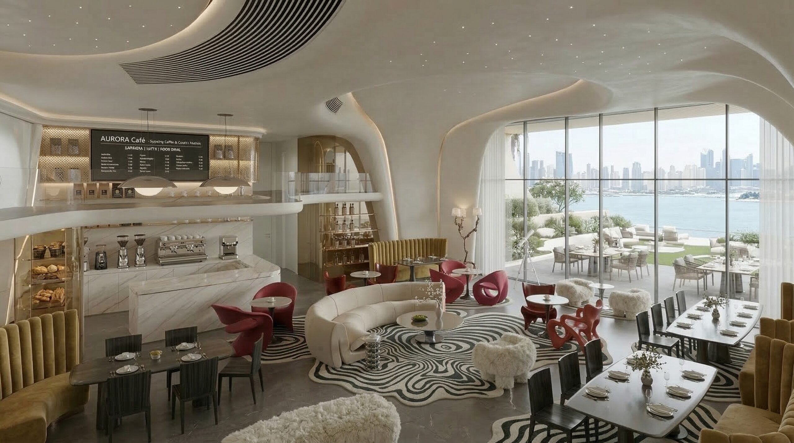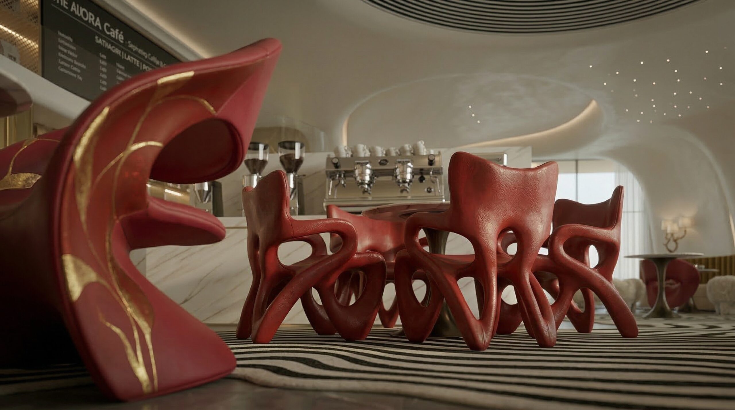Akışkan formlar ve heykelsi mobilyaların ön planda olduğu bu restoran tasarımı, futuristik ve lüks bir mekânsal deneyim sunar. Yumuşak geçişli beyaz yüzeyler ve kıvrımlı mimari kabuk, mekânı bütüncül bir forma dönüştürürken; kırmızı tonlardaki organik mobilyalar güçlü bir odak oluşturur. Grafik zemin desenleri ve dramatik aydınlatmalar mekâna dinamik bir etki katarken, geniş açıklıklar ve manzara ilişkisi iç mekânı dış çevre ile bağlar. Deneyim odaklı, ikonik ve akılda kalıcı bir restoran atmosferi oluşturulmuştur.