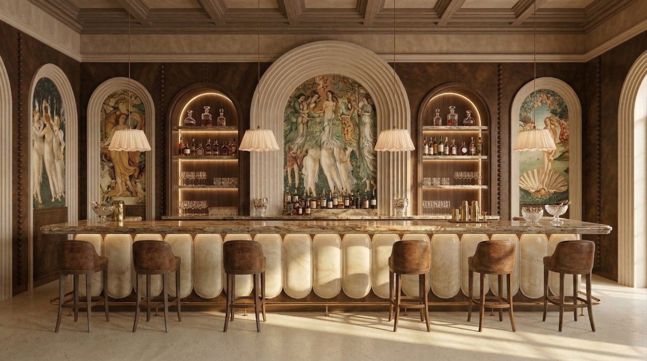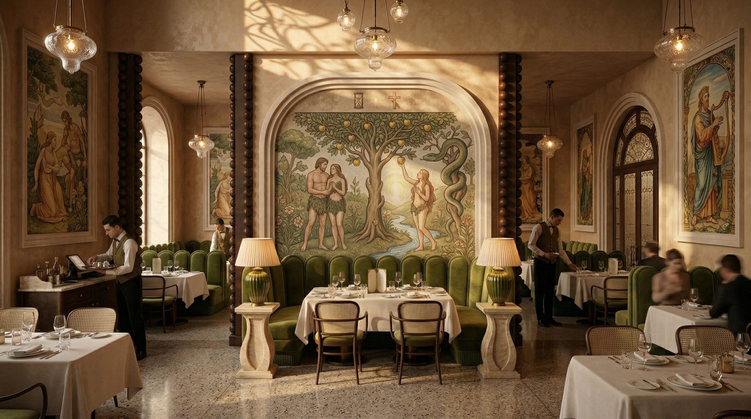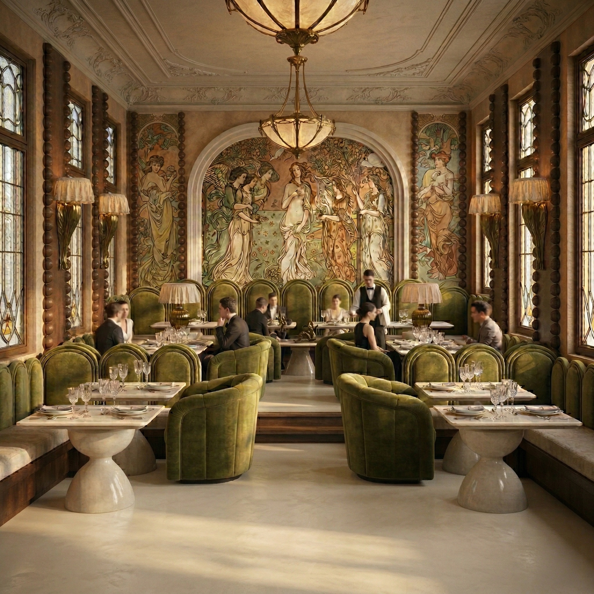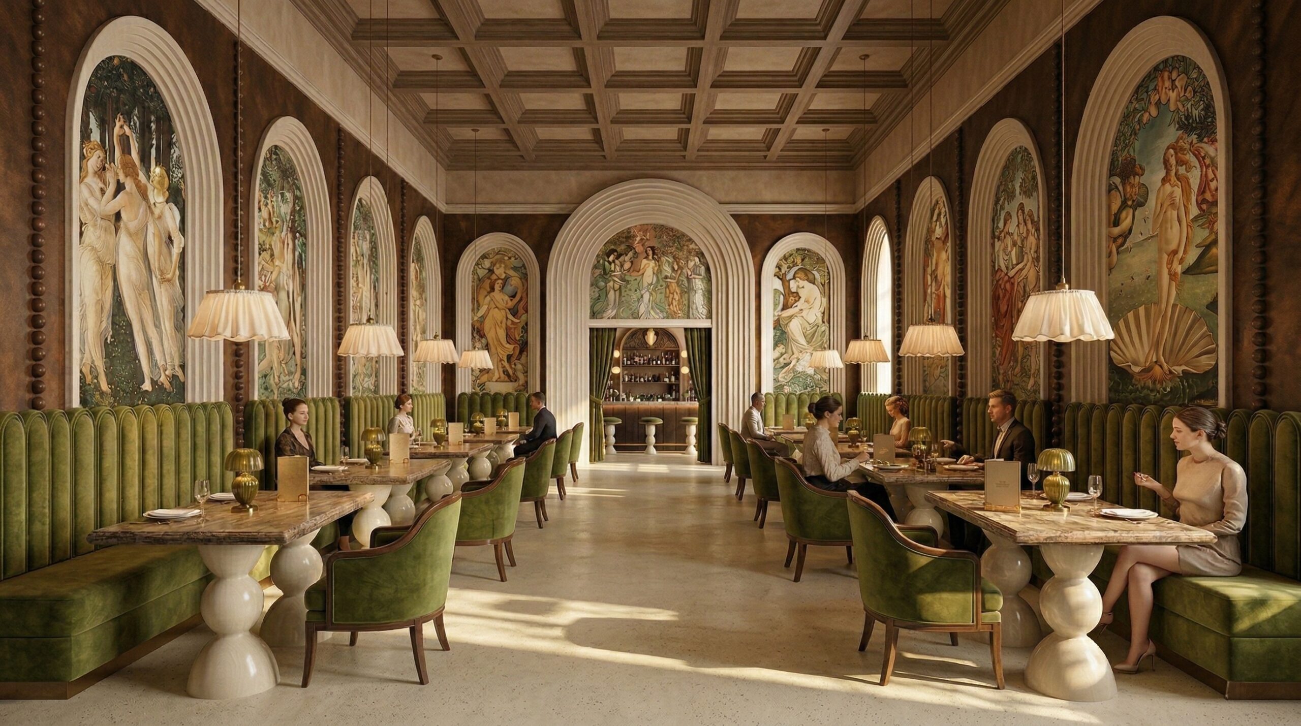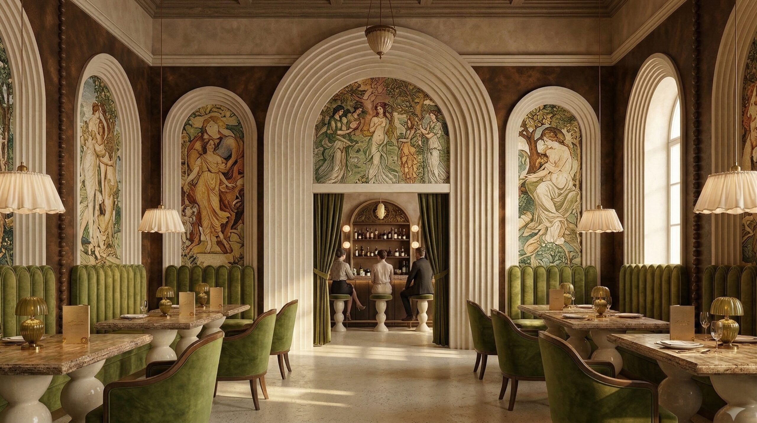 Klasik Avrupa mimarisinin çağdaş bir yorumunu sunan bu restoran, fresk duvar yüzeyleri, kemerli açıklıkları ve zengin malzeme paleti ile zamansız bir atmosfer yaratır. Mekânın ana aksı boyunca uzanan yüksek tavanlı salon, ritmik kemer dizilimi ve duvar panolarındaki figüratif sanat eserleriyle güçlü bir perspektif etkisi oluşturur.
