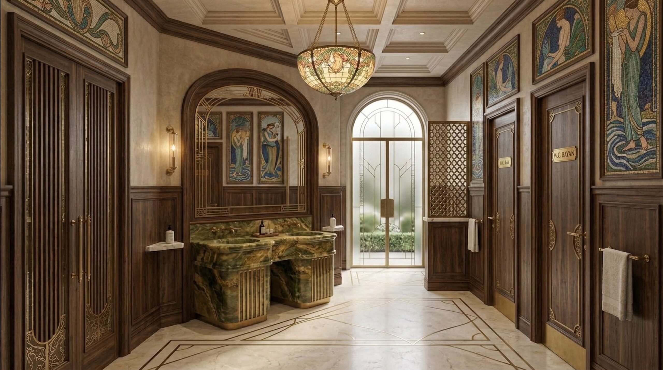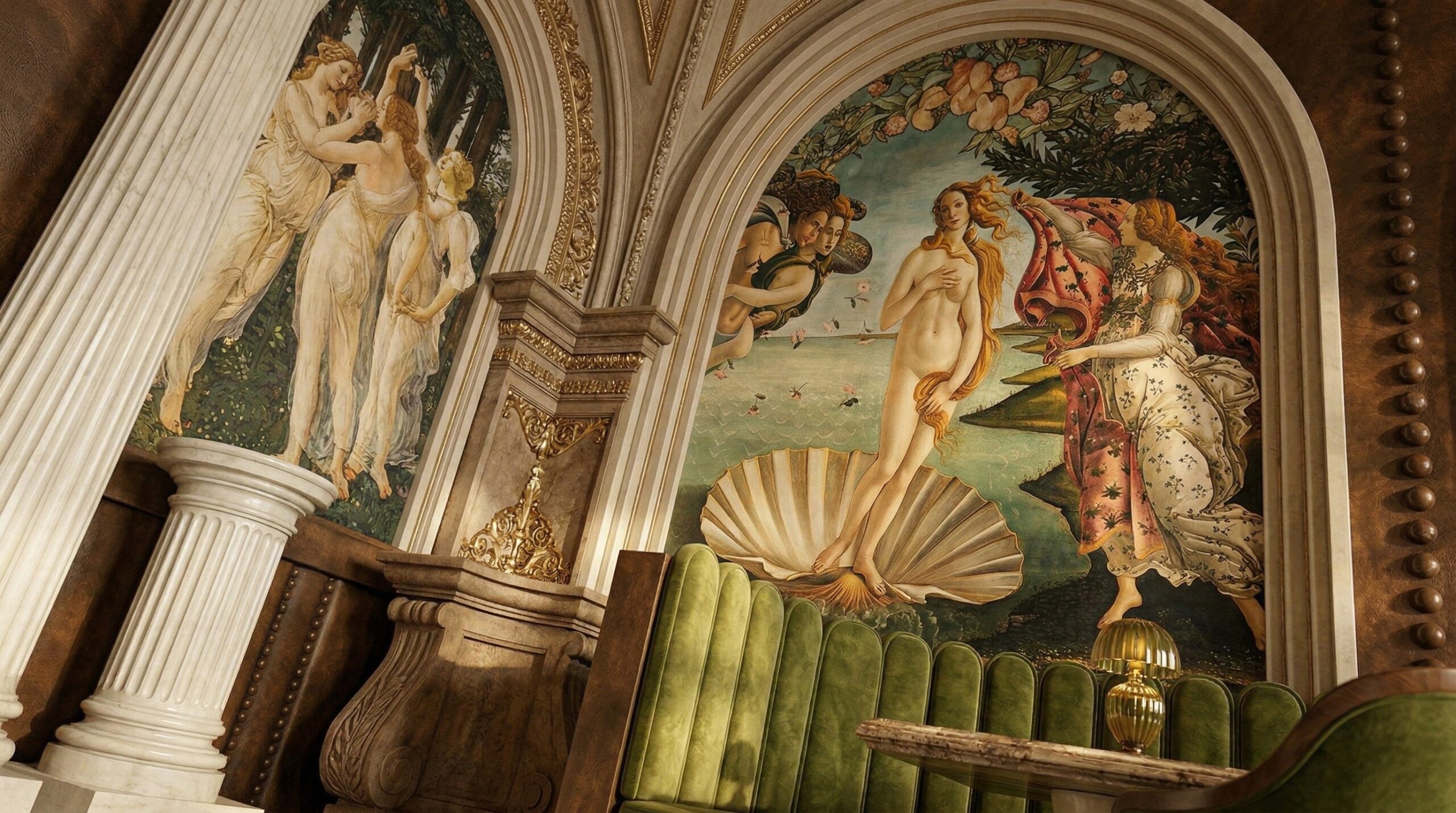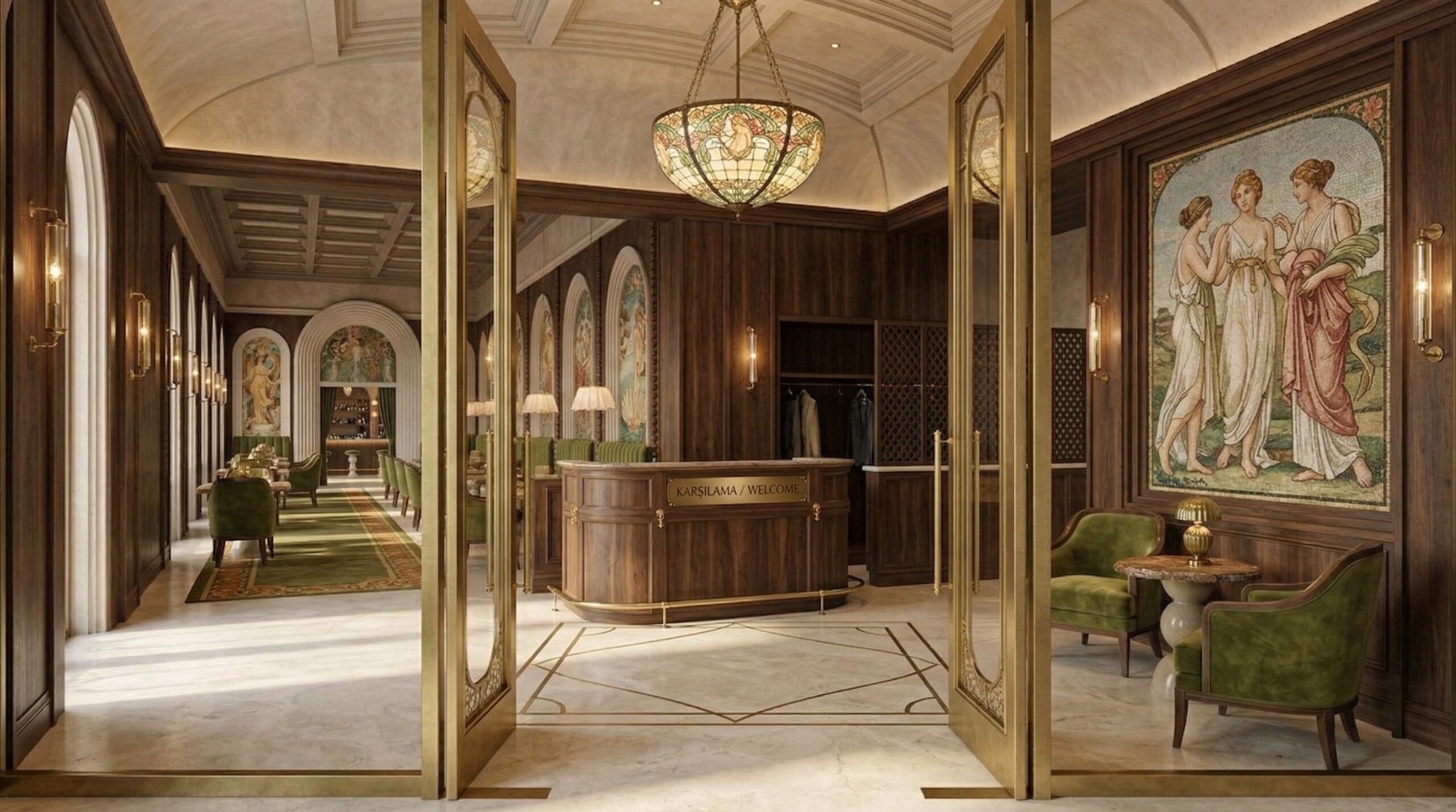 Yeşil tonlardaki kadife oturma elemanları, sıcak ahşap paneller ve doğal taş yüzeylerle dengelenerek sofistike bir iç mekân dili kurar. Girişten ana salona uzanan kurgu, ziyaretçiyi katmanlı bir deneyime davet ederken; merkezi odak noktalarında yer alan sanatsal kompozisyonlar mekânın kimliğini güçlendirir. Tasarım, klasik estetiği modern konfor ve işlevsellikle bütünleştirir.